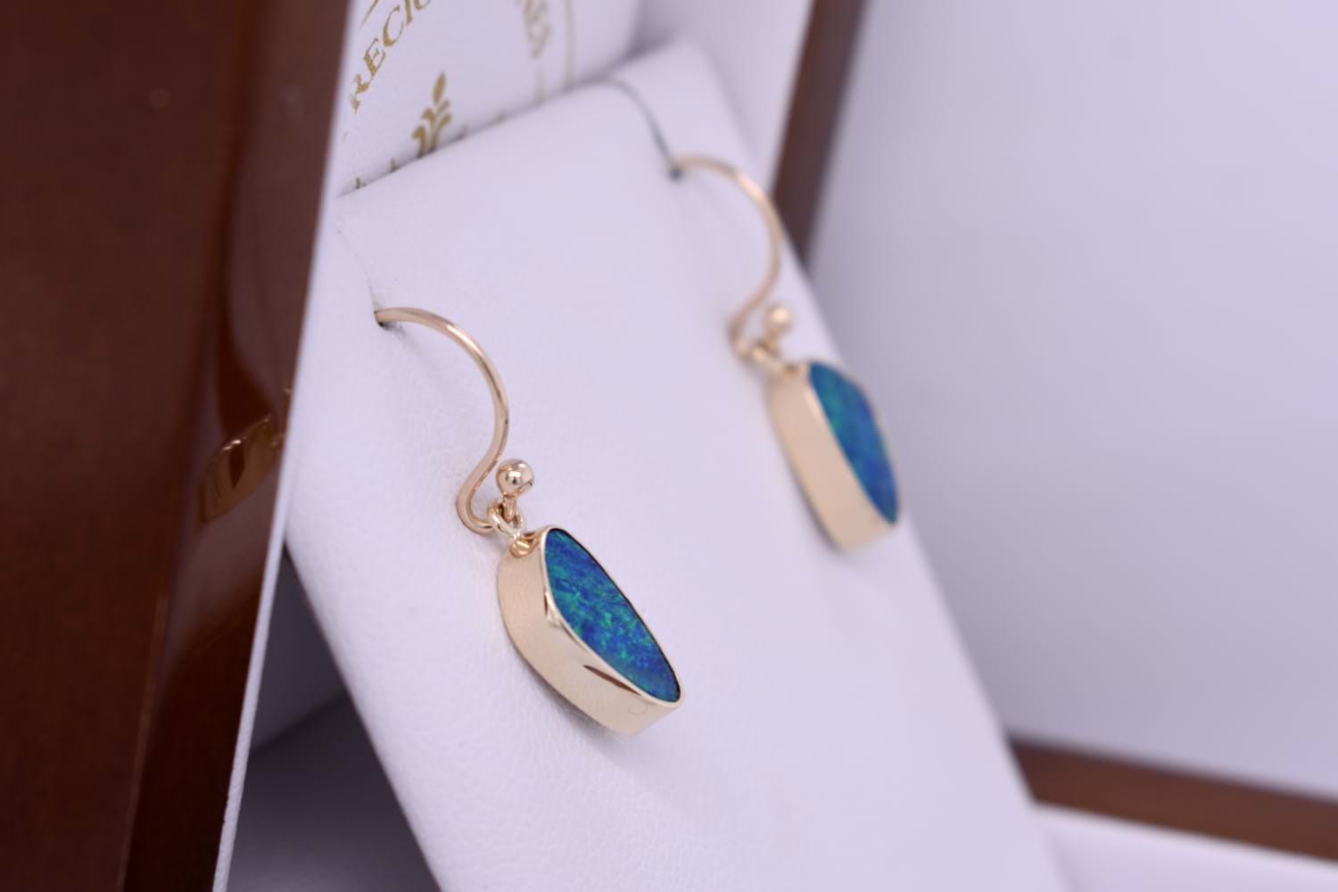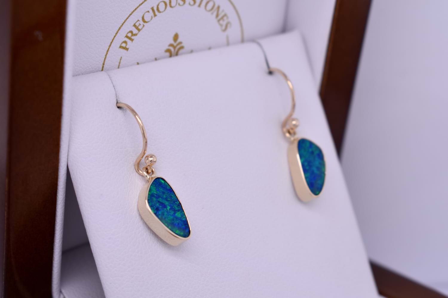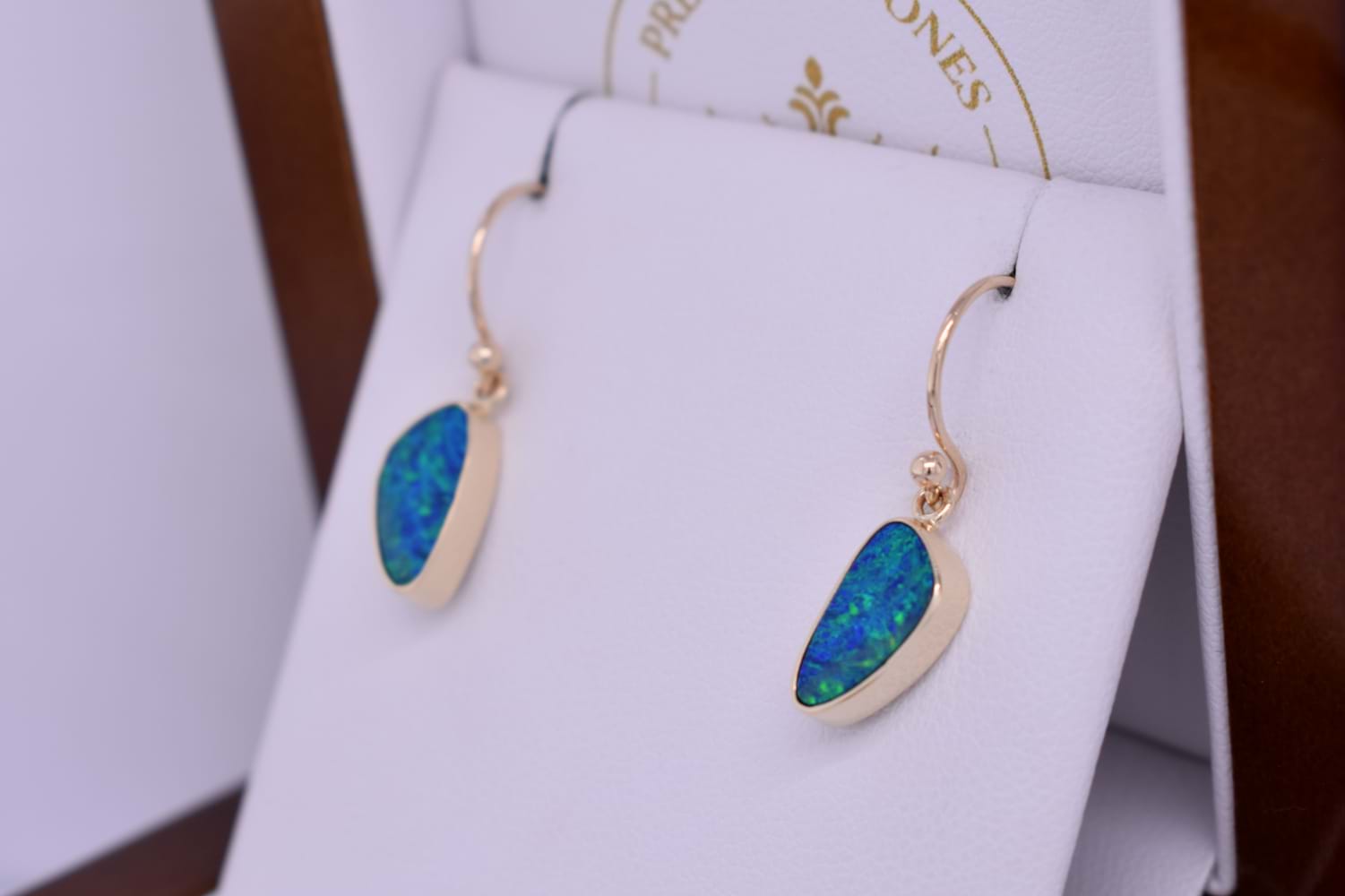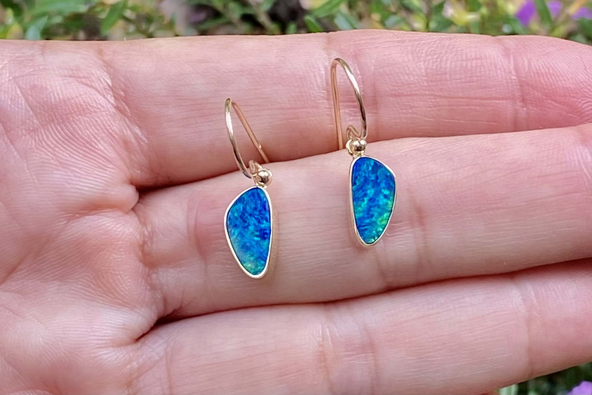 Pretty freeform Coober Pedy opals measuring approx. 11.5x6mm, bezel set into a handmade 9ct yellow gold setting. The opal is a doublet, with a boulder opal backing and has flashes of green and blue throughout. Finished with shepherd hook fittings.