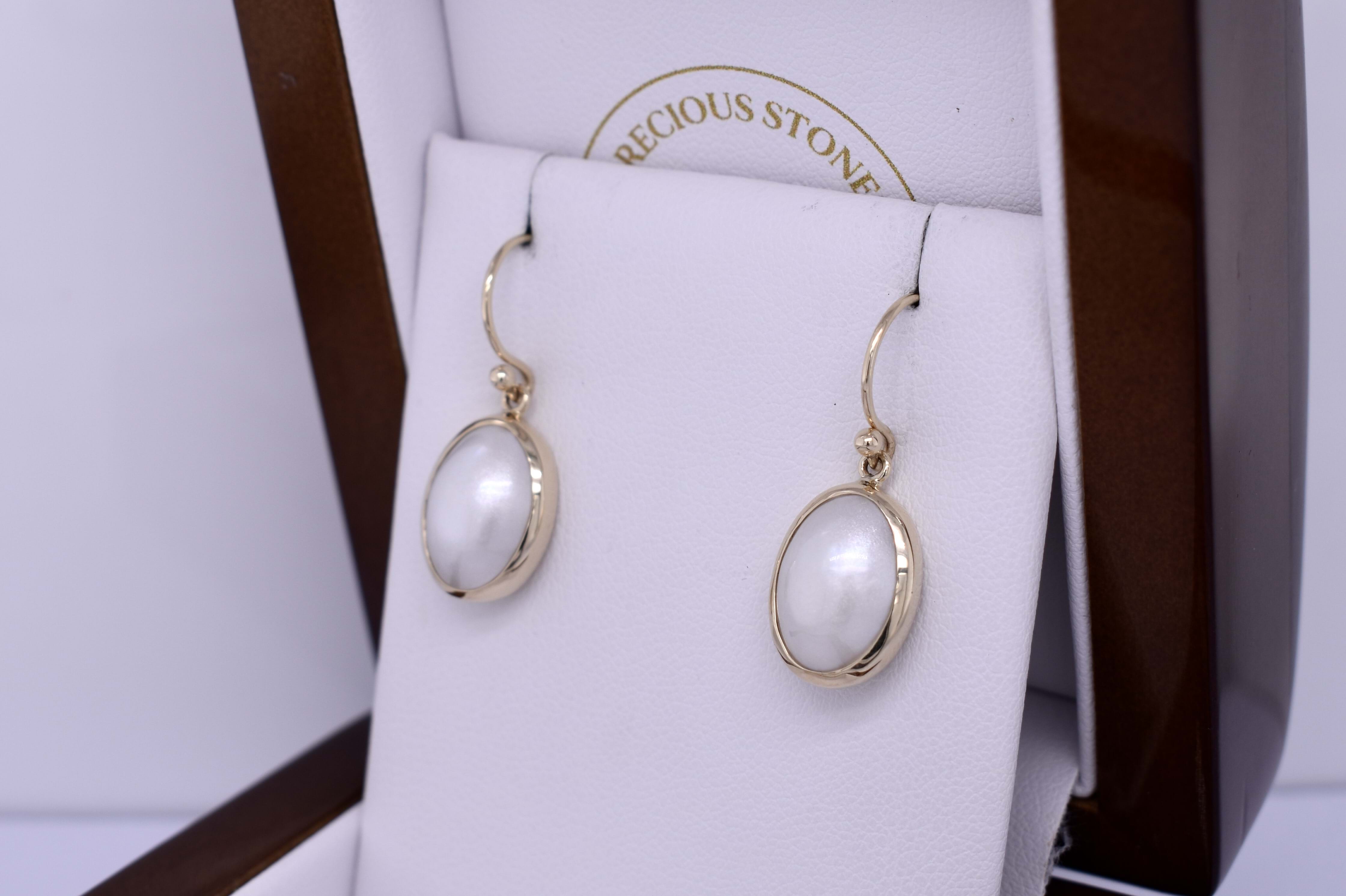 These classic earrings feature oval white mable pearls measuring approx. 12x8.4mm, bezel set into a handmade 9ct yellow gold setting. The earrings are finished with shepherd hook fittings for everyday wear.