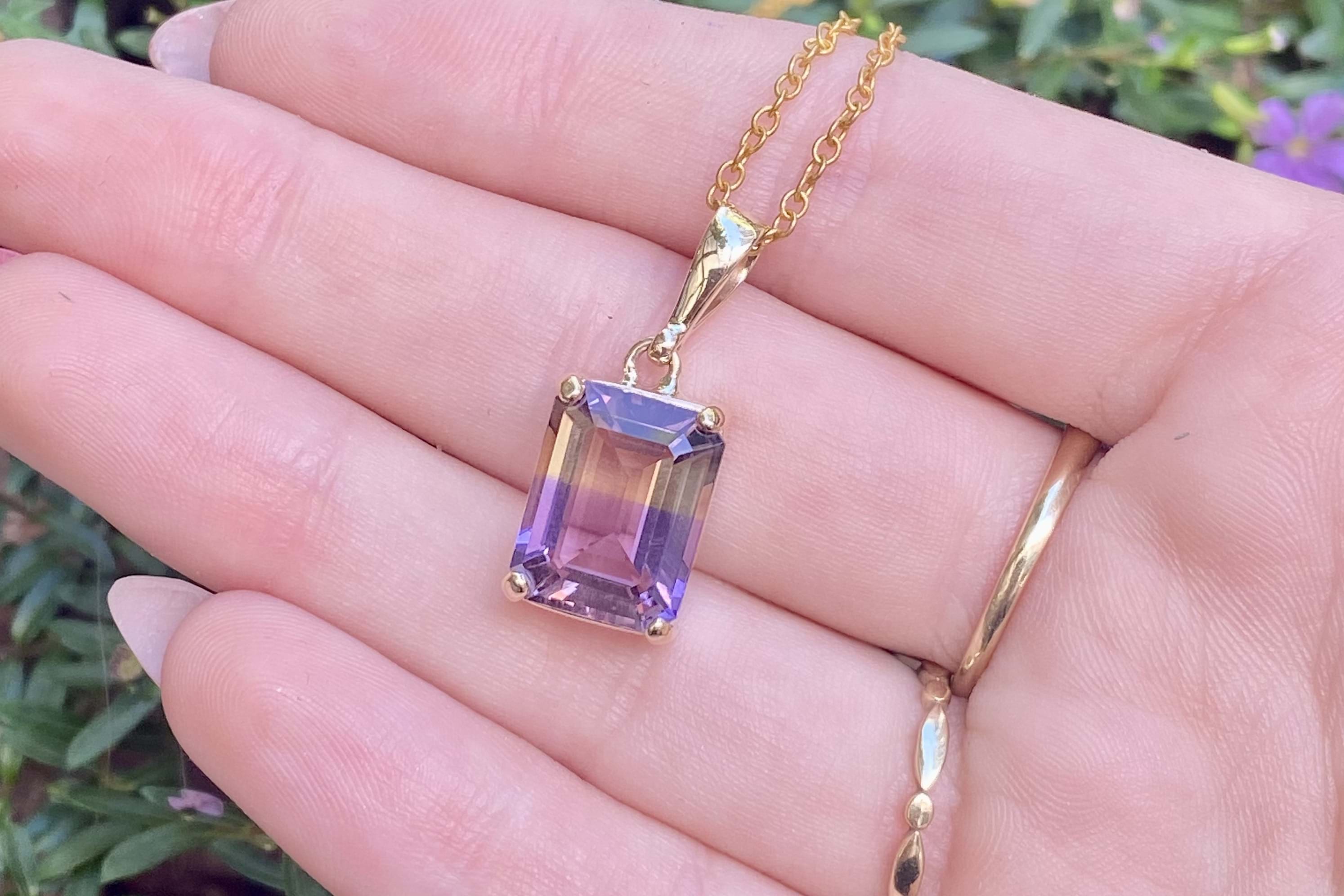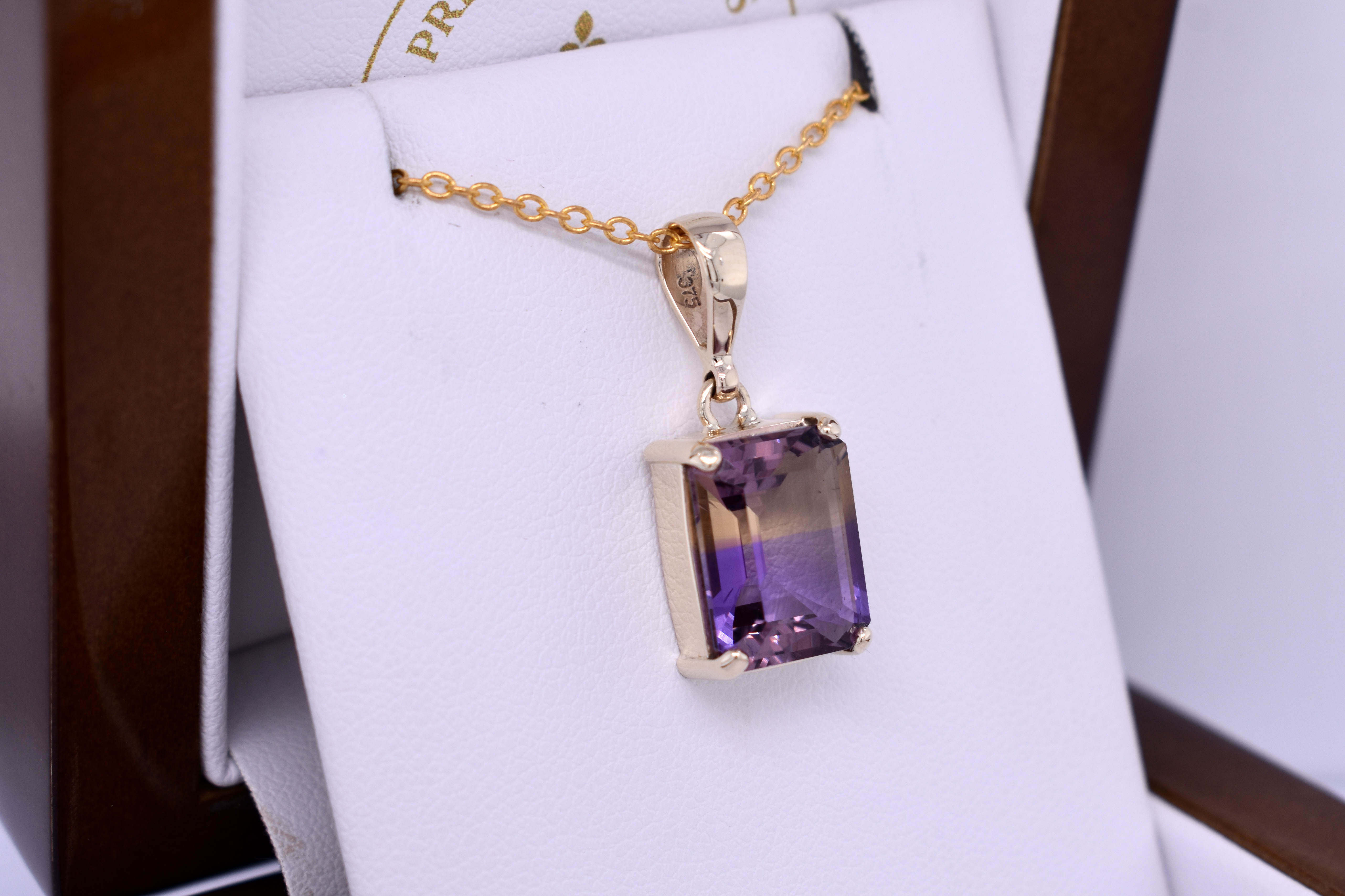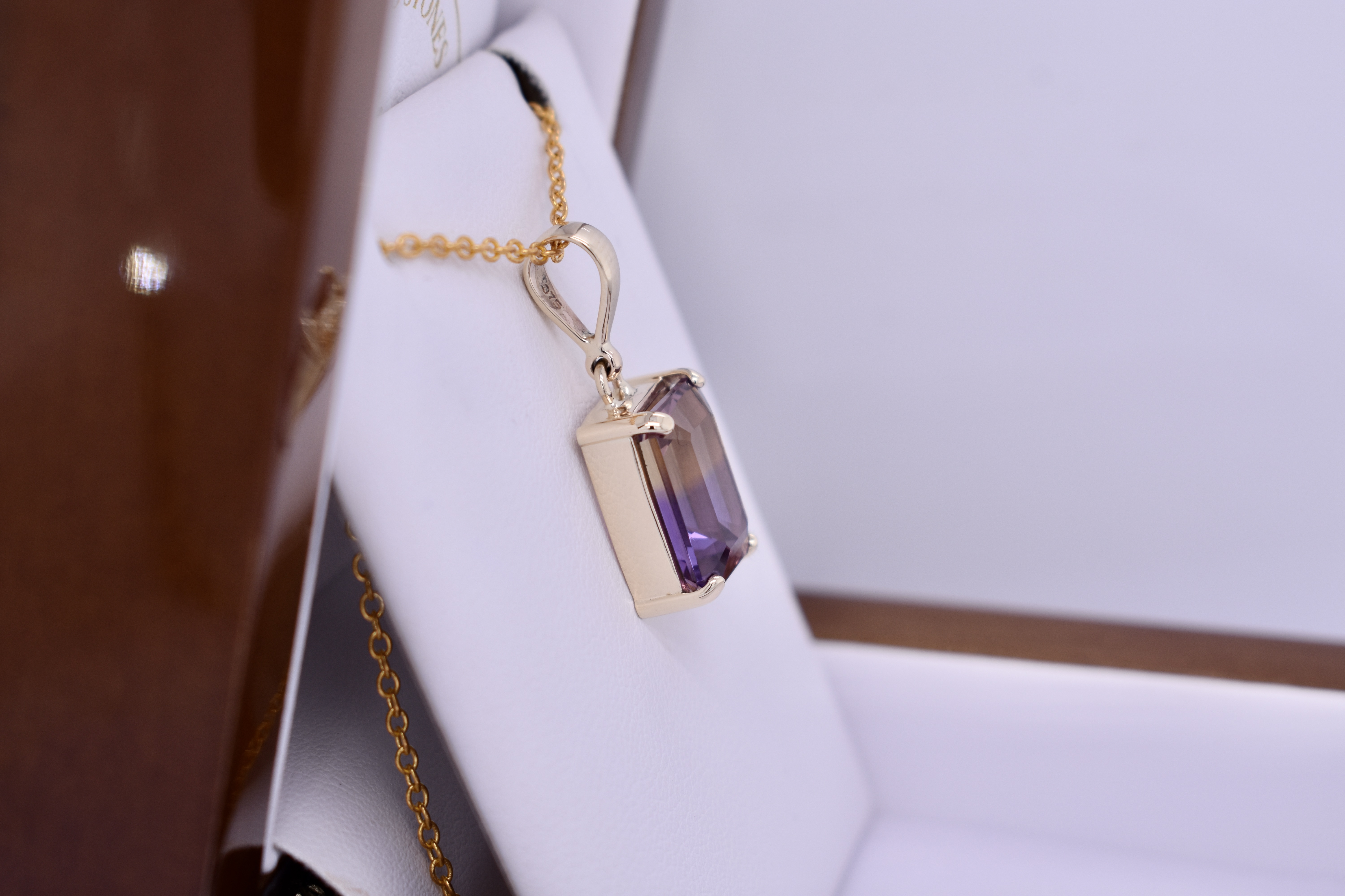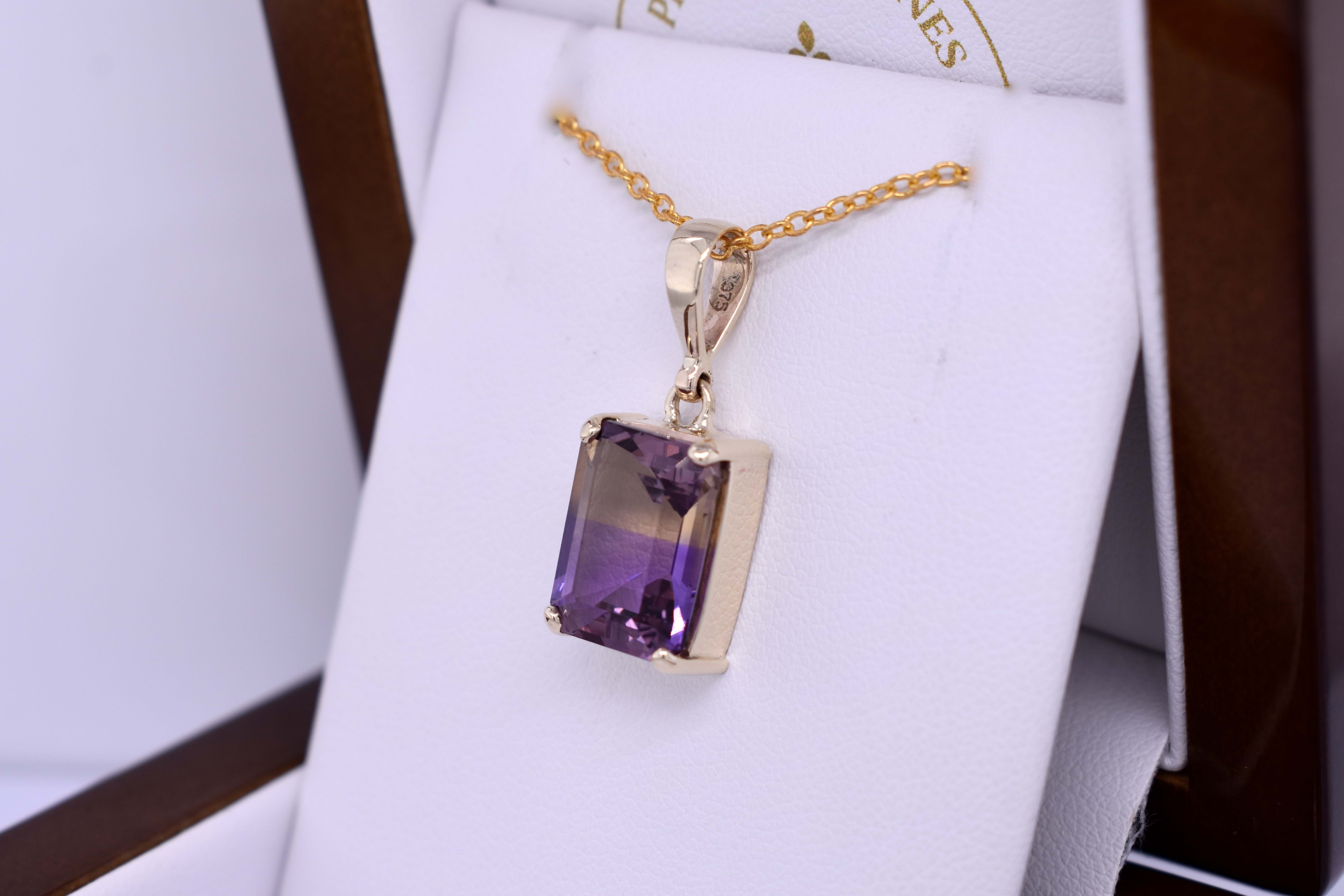This vibrant pendant features a unique emerald cut Bolivian ametrine measuring approx. 13.1x10.2mm, four claw set into a handmade 9ct yellow gold setting. Finished with a plain bale. Chains are available for separate purchase. Photographed with matching earrings (Available for seperate purchase)