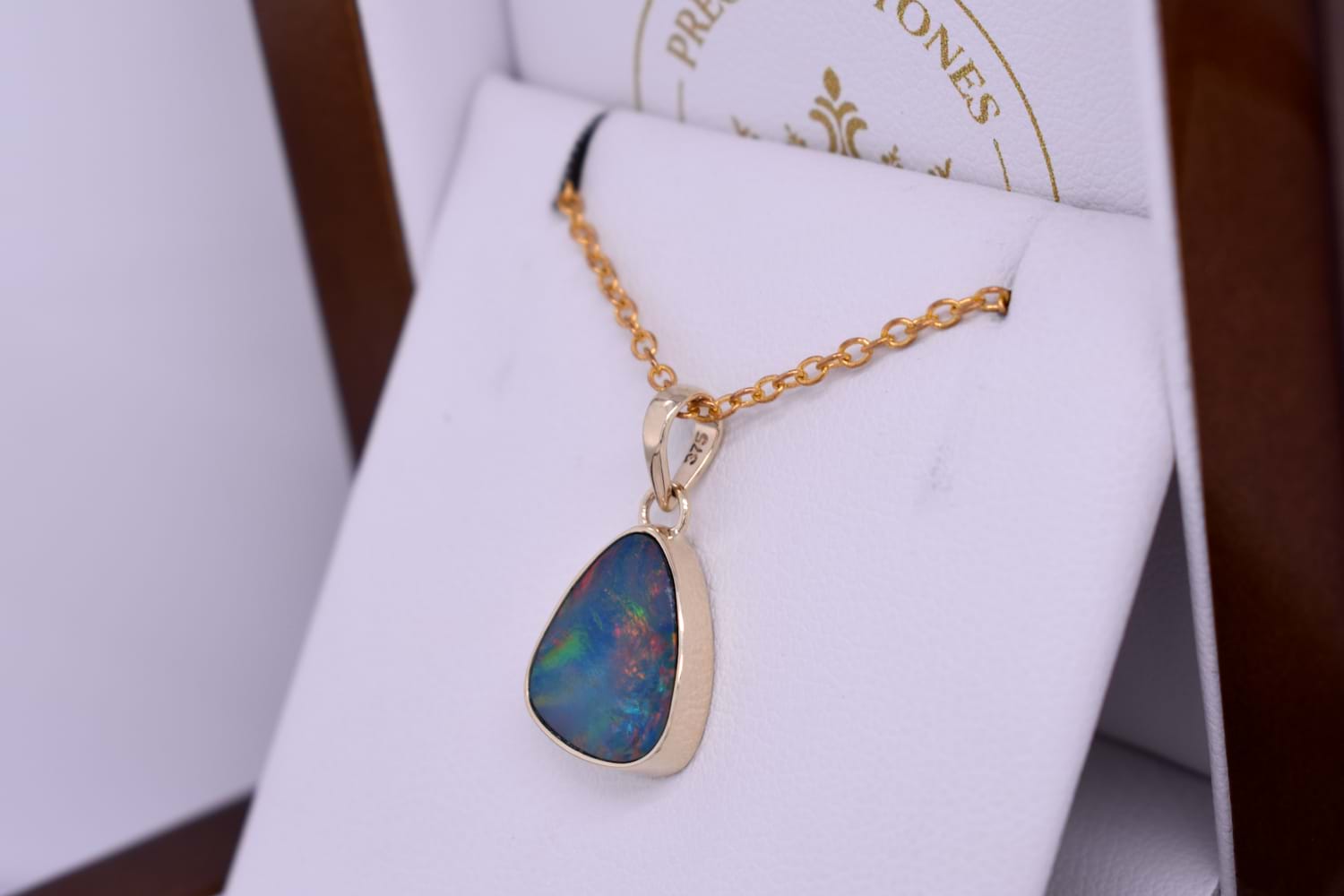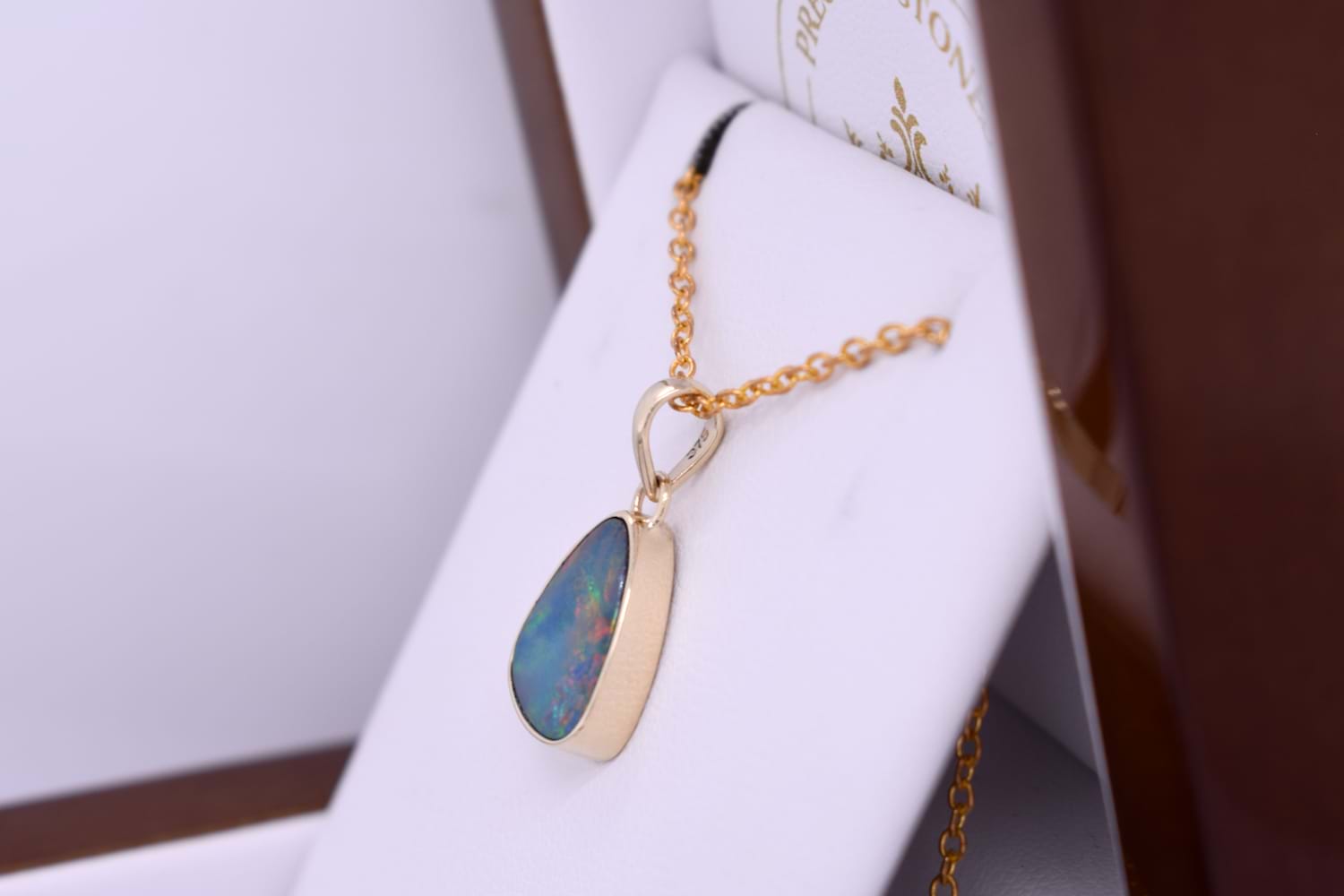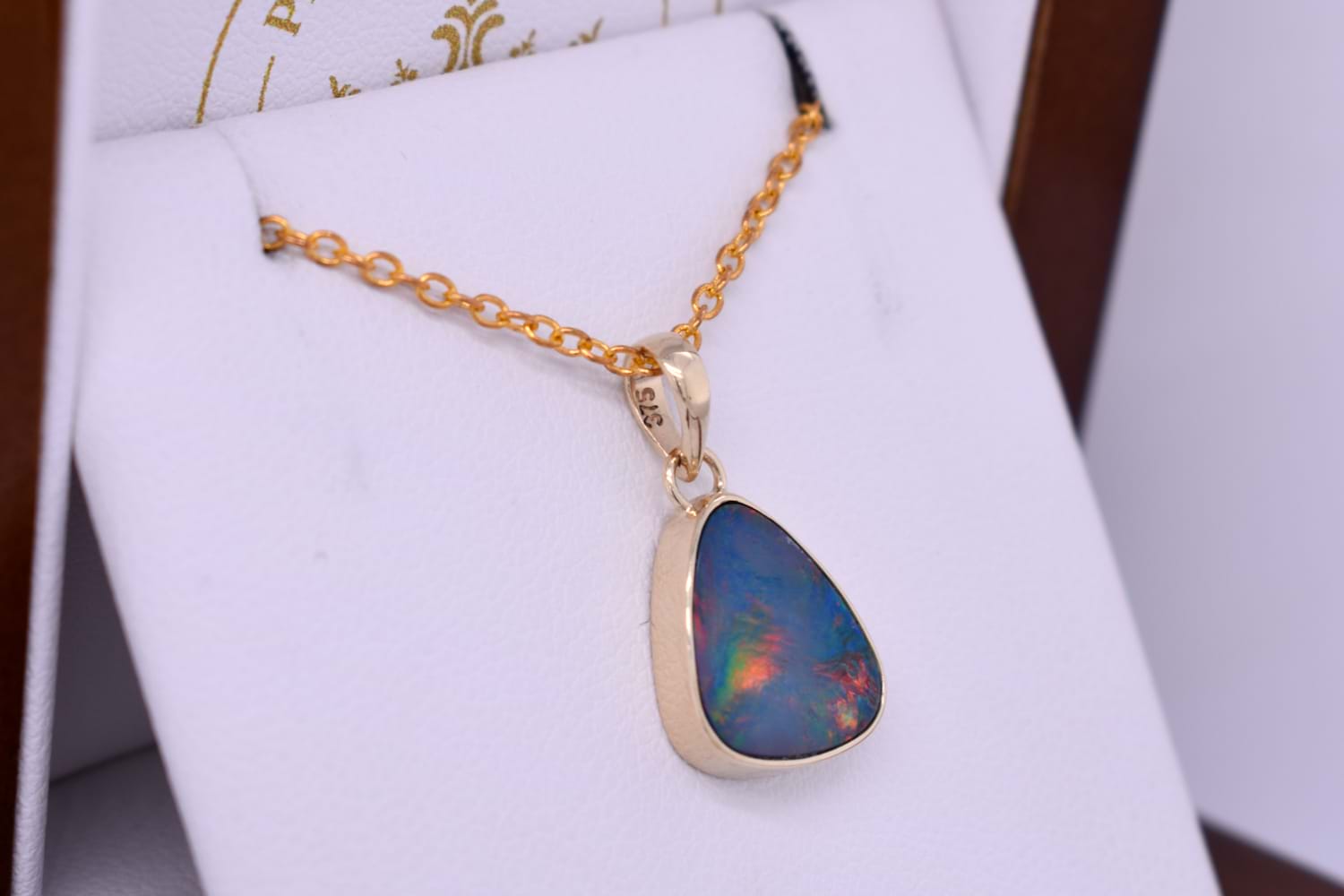 This luminous pendant features a Coober Pedy opal measuring approx. 13.2x10.55mm, that is bezel set into a handmade 9ct yellow gold setting. The opal is a doublet, with a boulder opal backing and has flashes of orange and yellow throughout. Finished with a plain bale. Chains are available for separate purchase.