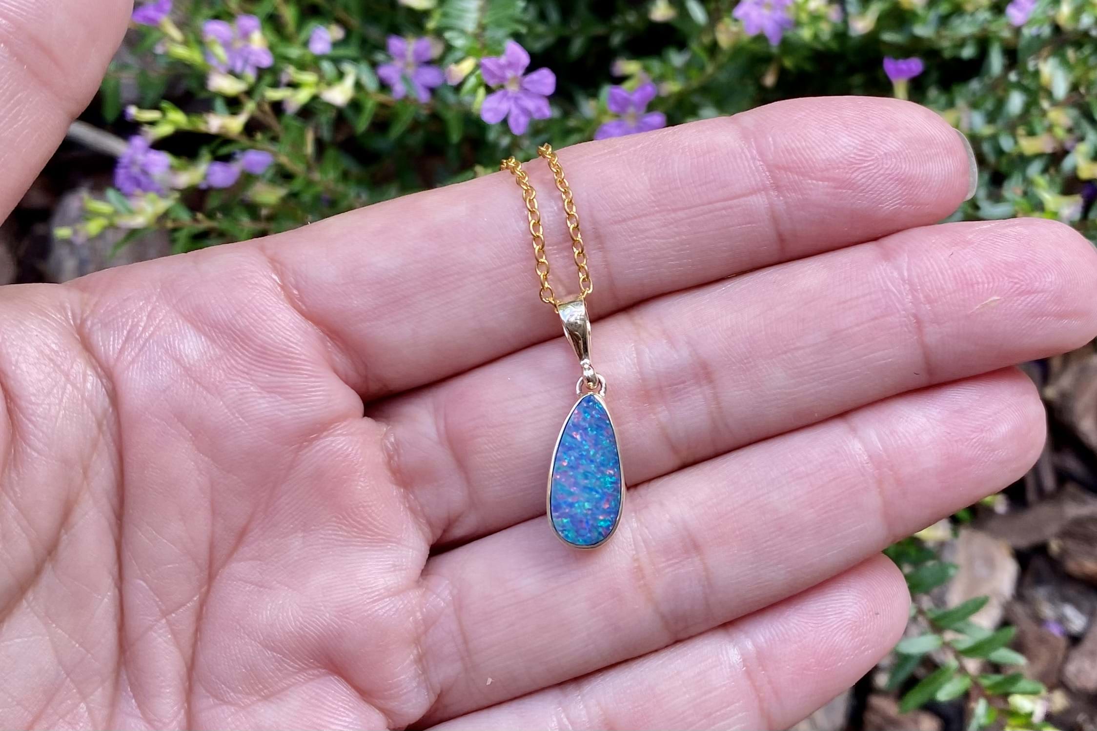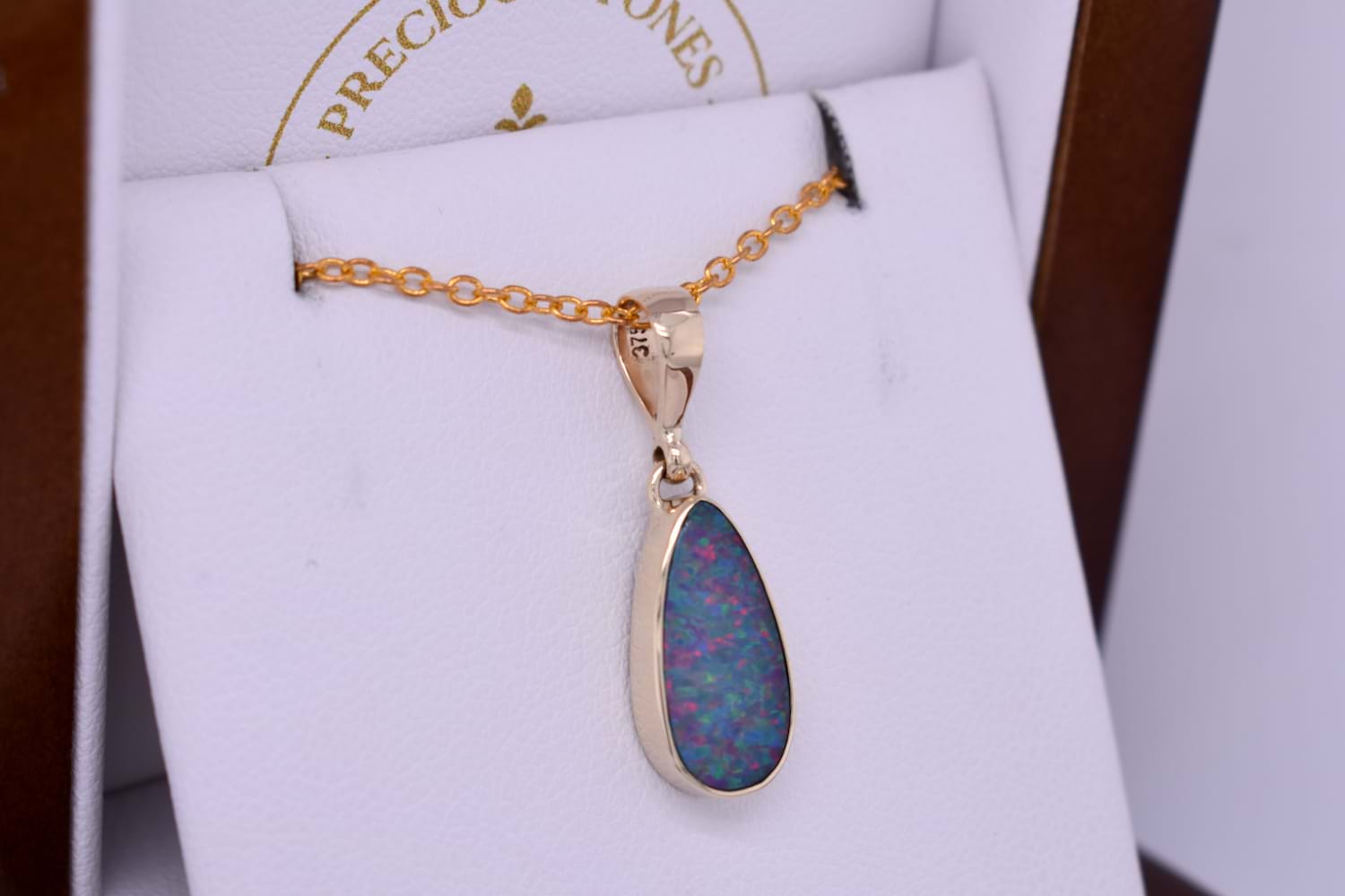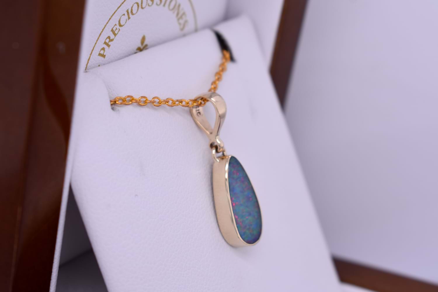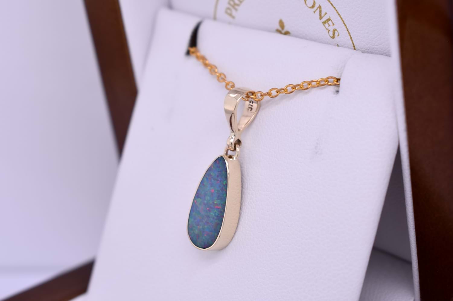 This gorgeous freeform Coober Pedy opal measures approx. 15.11x8.4mm, and is bezel set into a handmade 9ct yellow gold setting. The opal is a doublet, with a boulder opal backing and has flashes of red and green throughout in a pin fire pattern. Finished with a plain bale. Chains are available for separate purchase.