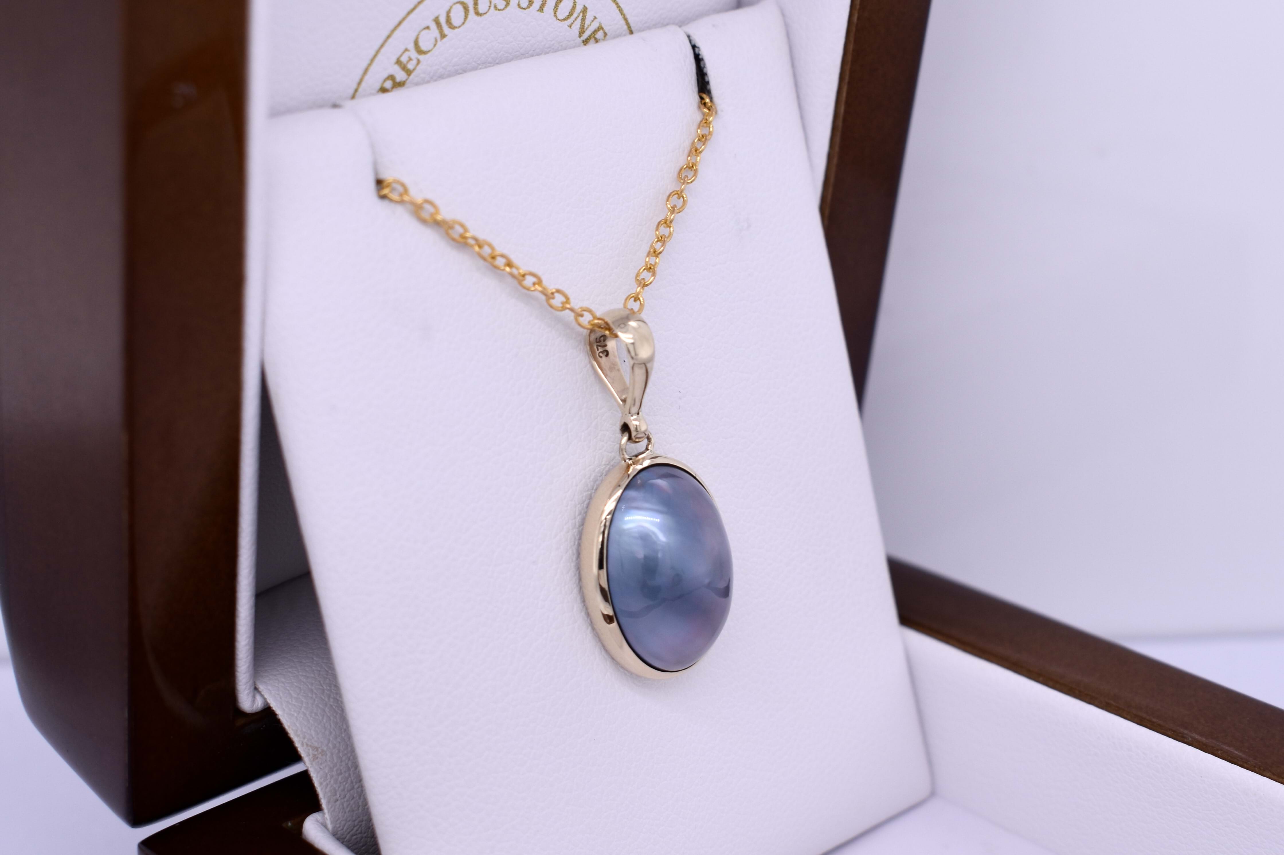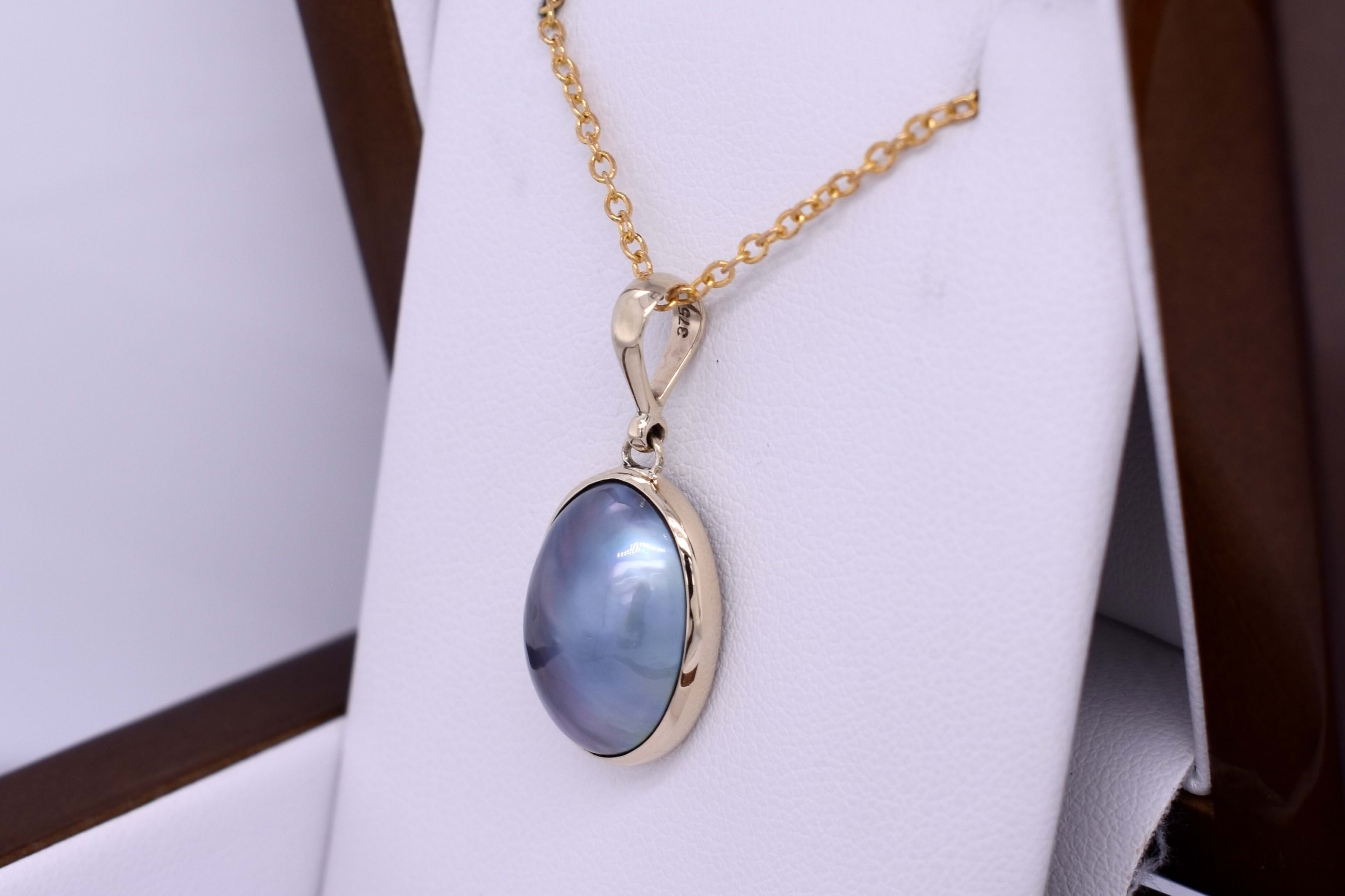 This gorgeous pendant features an oval blue mabe pearl measuring approx. 15x11.7mm, bezel set into a handmade 9ct yellow gold setting. Finished with a plain bale. Chains are available for separate purchase.