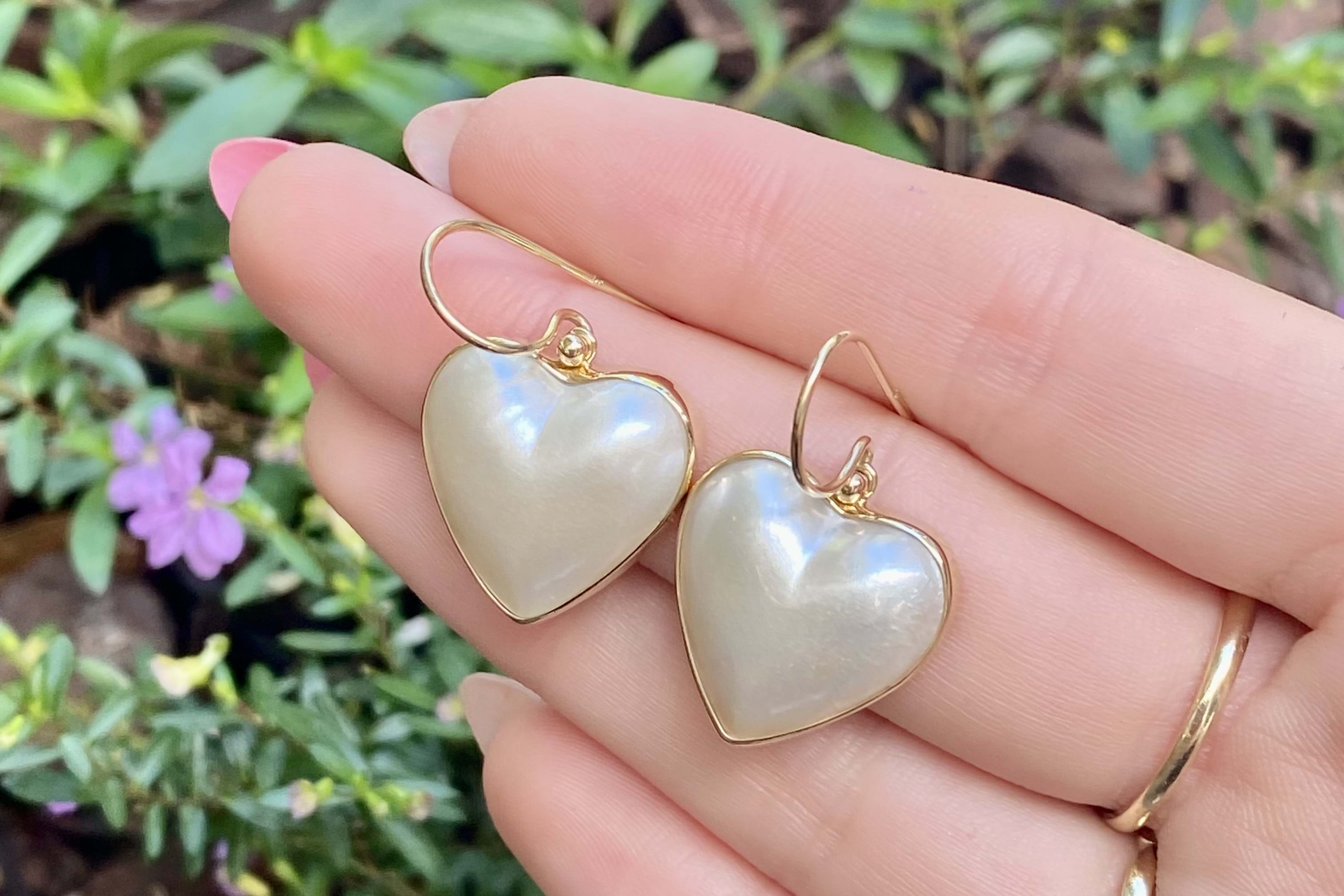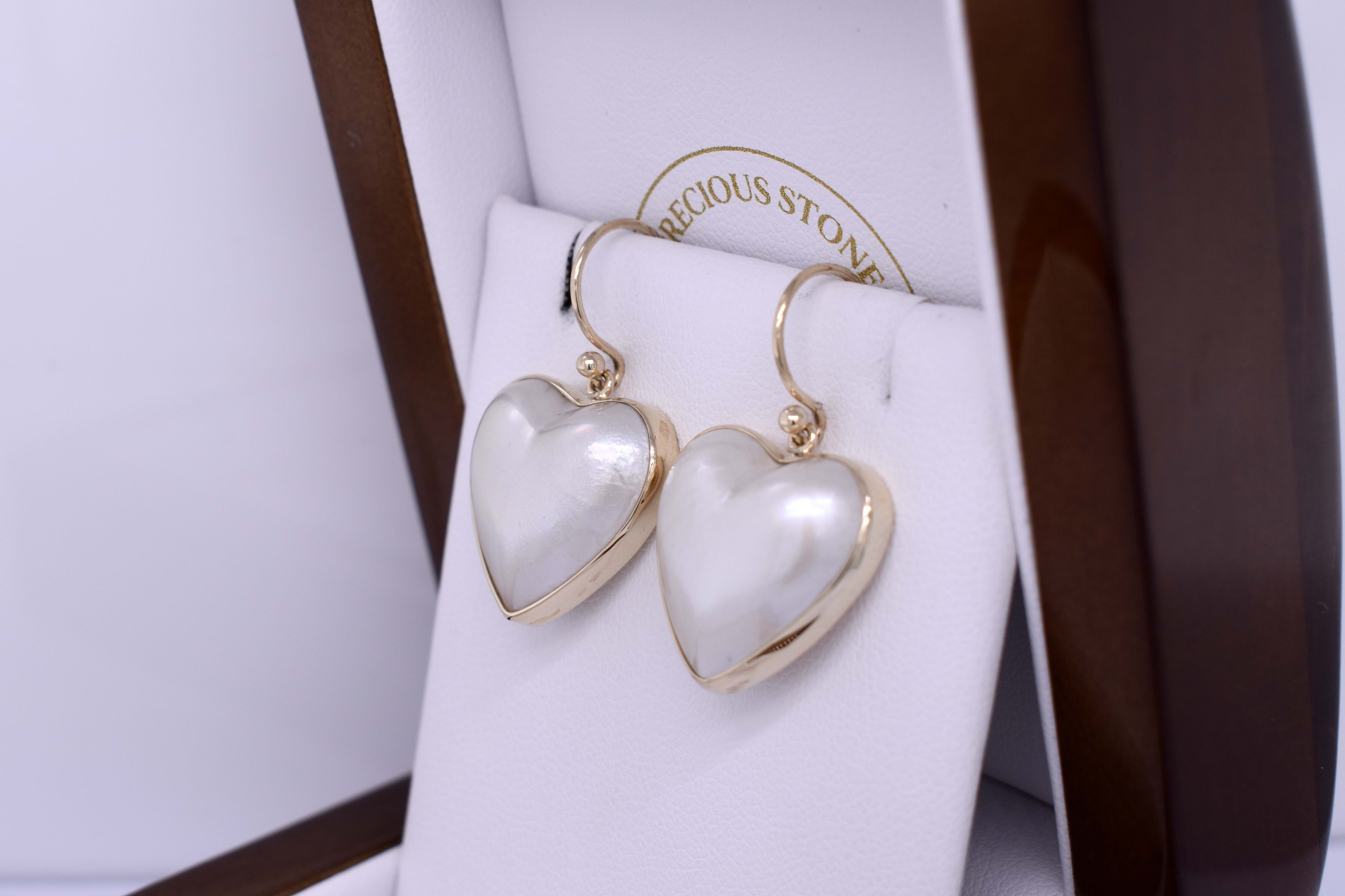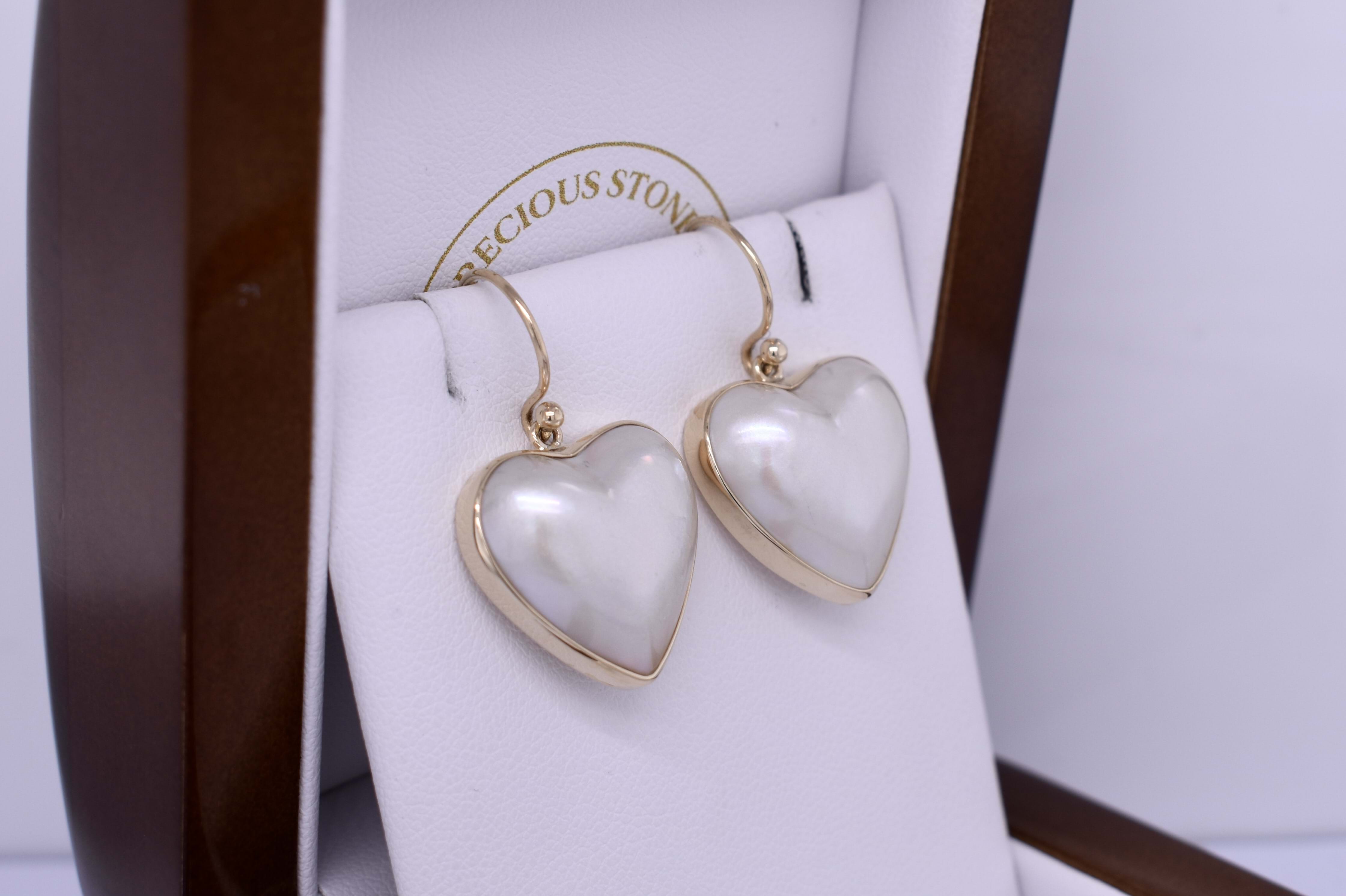 These pretty earrings feature heart shaped white mabe pearls measuring approx. 16.8x16.8mm, bezel set into a handmade 9ct yellow gold setting. The earrings are finished with shepherd hook fittings for everyday wear.