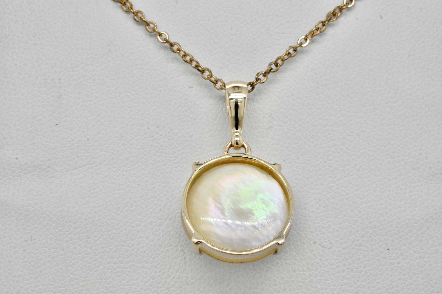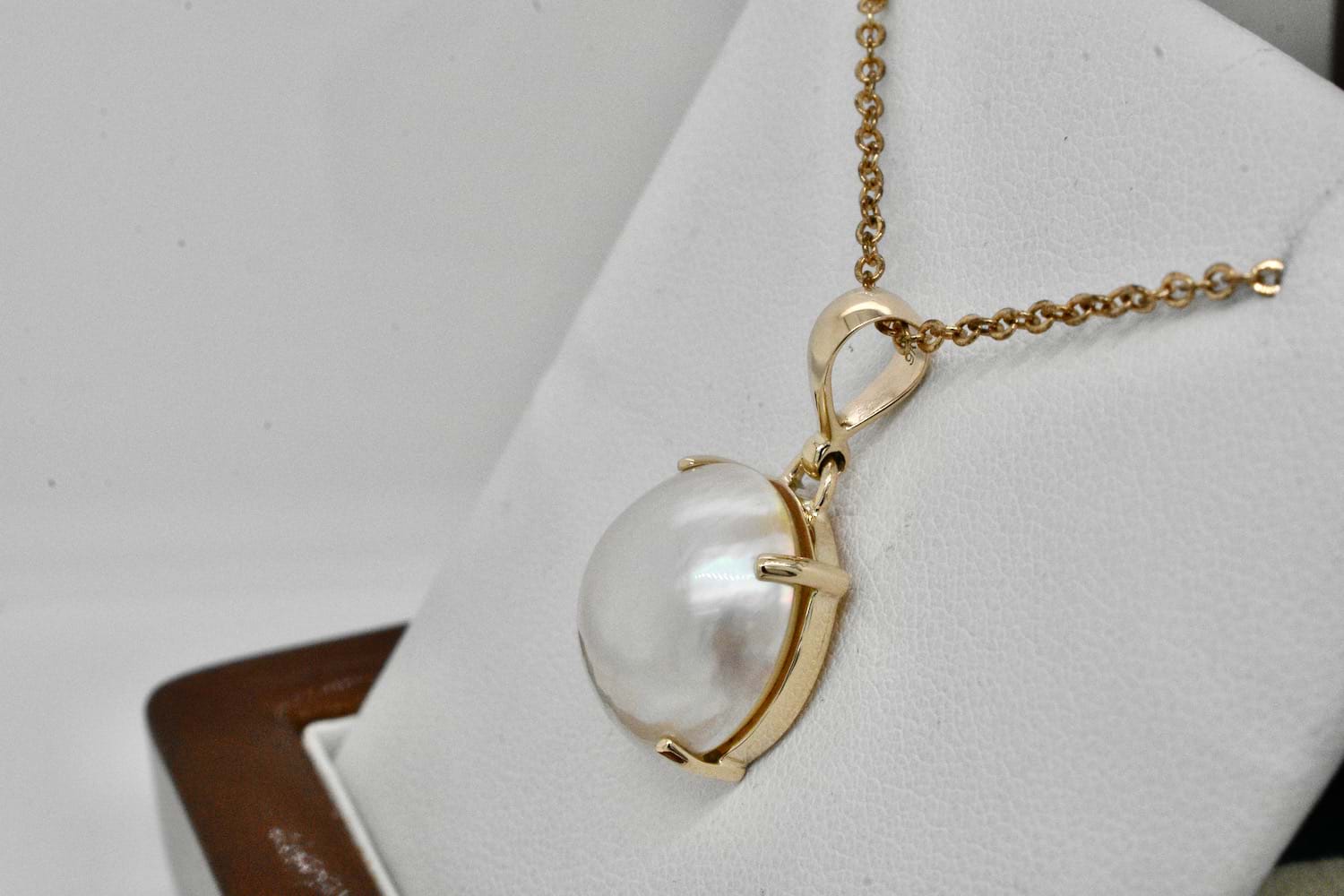 Lustrous white mabe pearl measuring approx. 16mm round set into a handmade 9ct yellow gold pendant with four claws and a plain bale. Chains are available for separate purchase