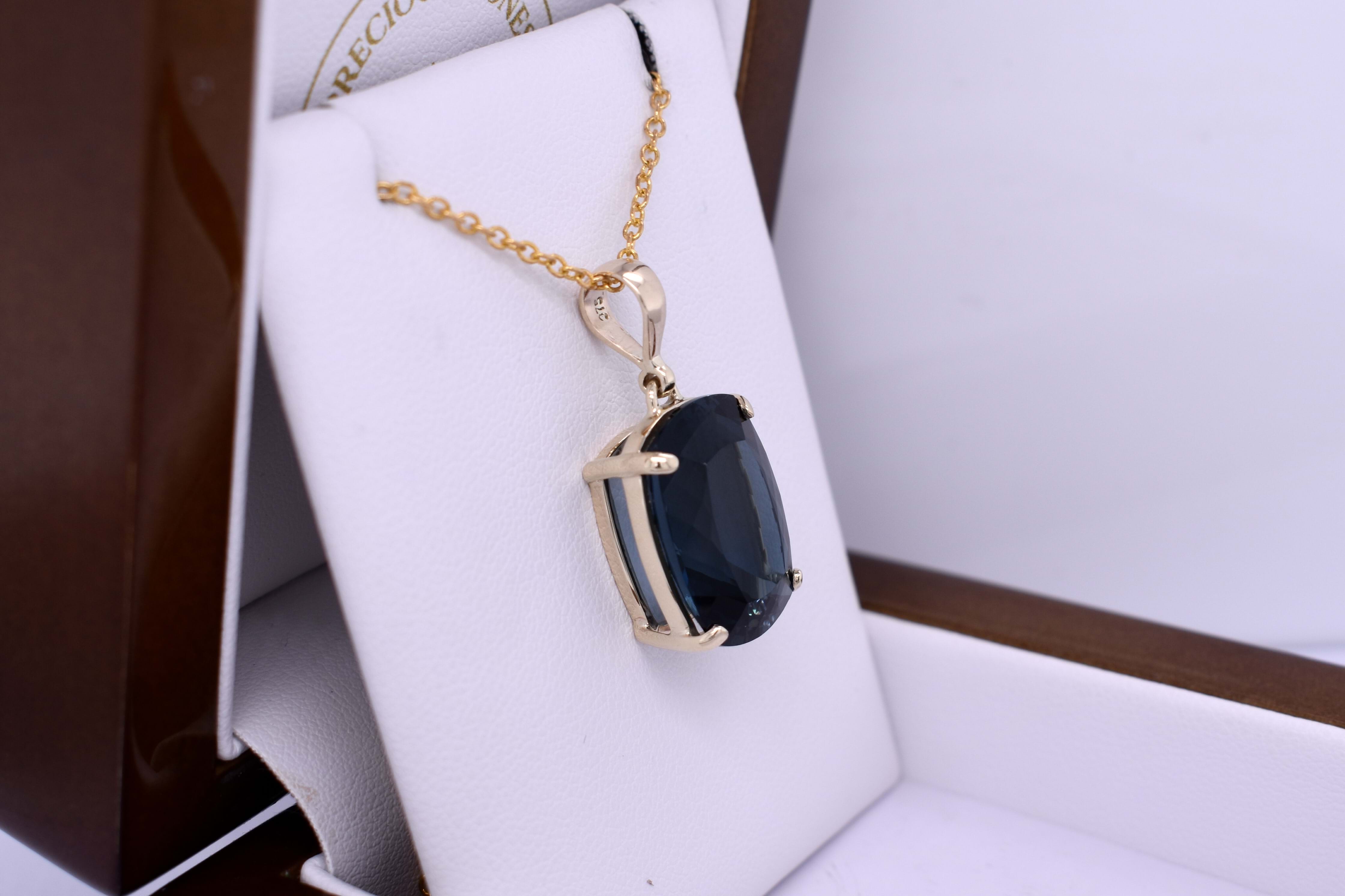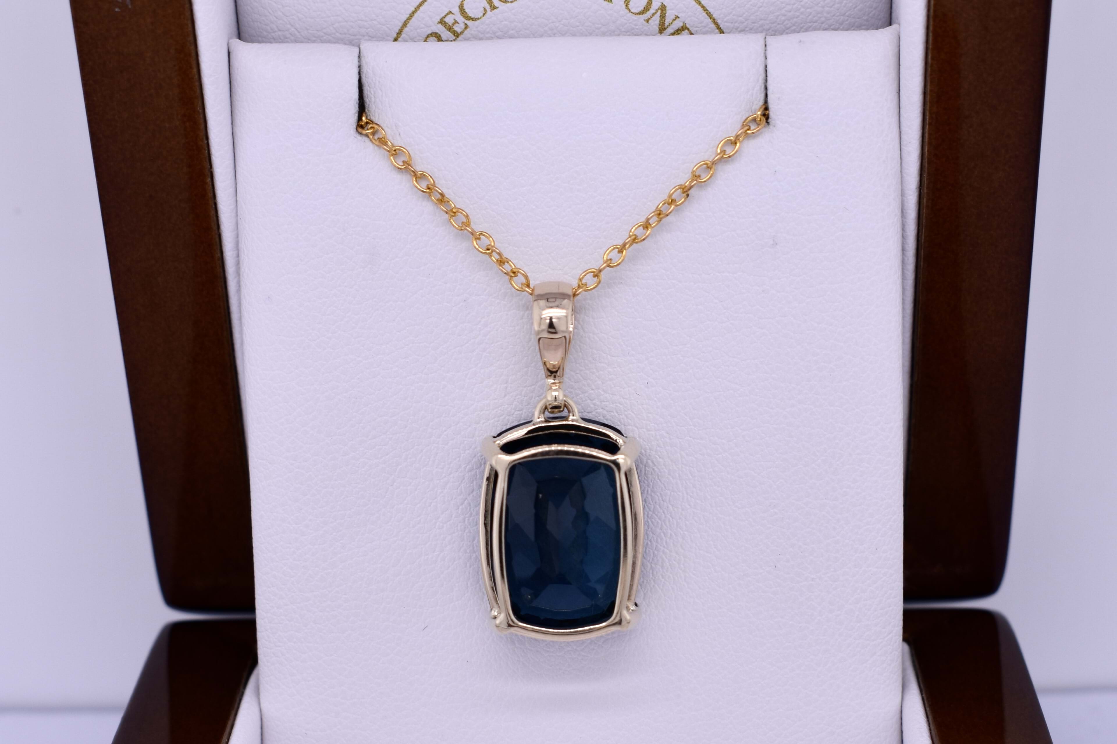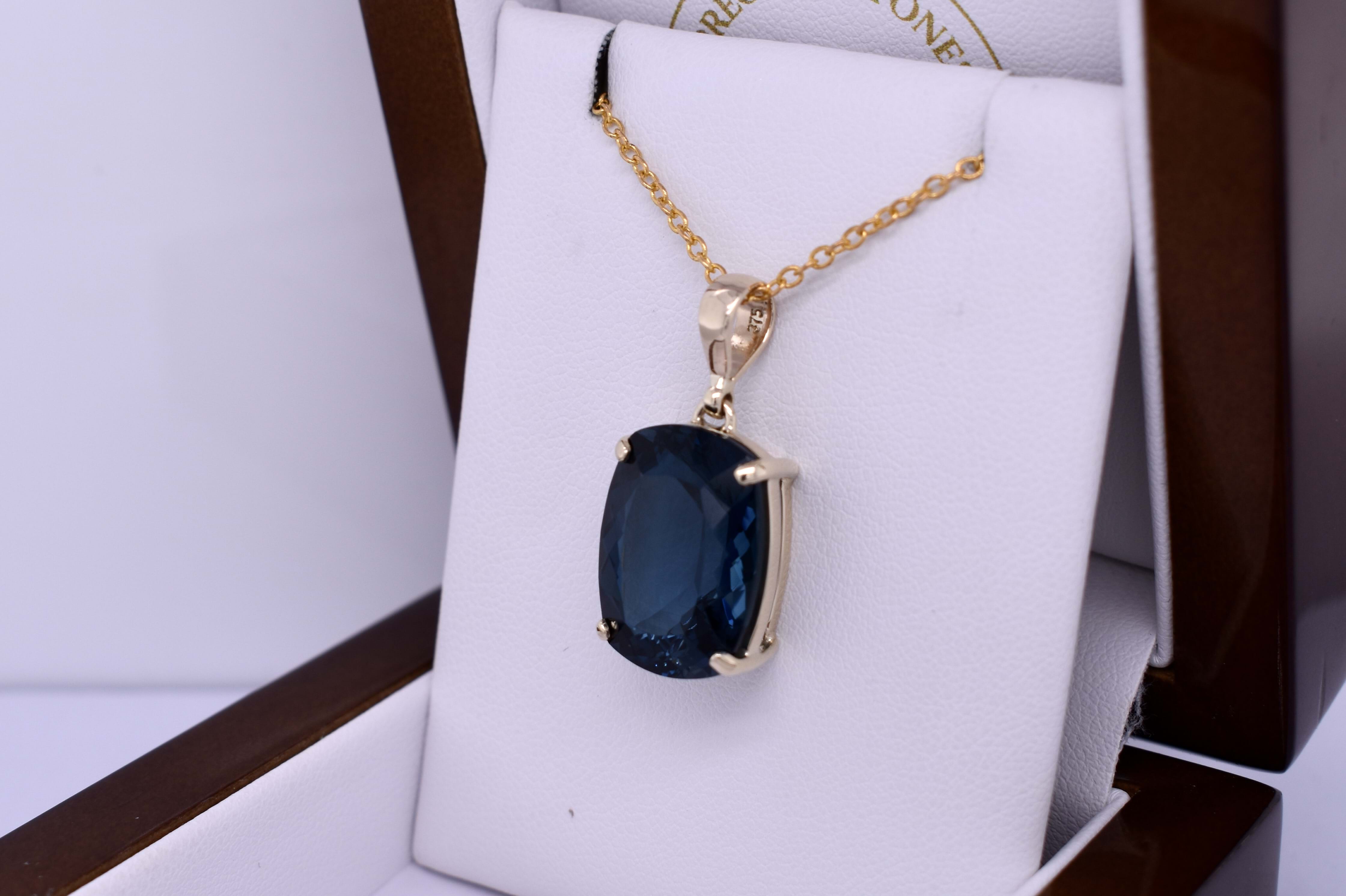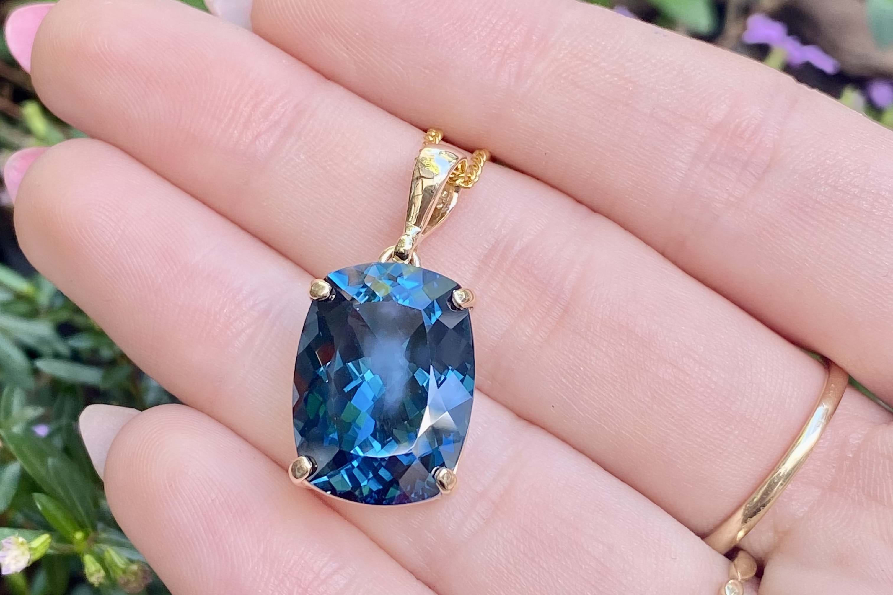 This simple yet vibrant pendant features a cushion shaped London blue topaz measuring approx. 17.6x12.95mm, four claw set into a handmade 9ct yellow gold setting. Finished with a plain bale. Chains are available for separate purchase.