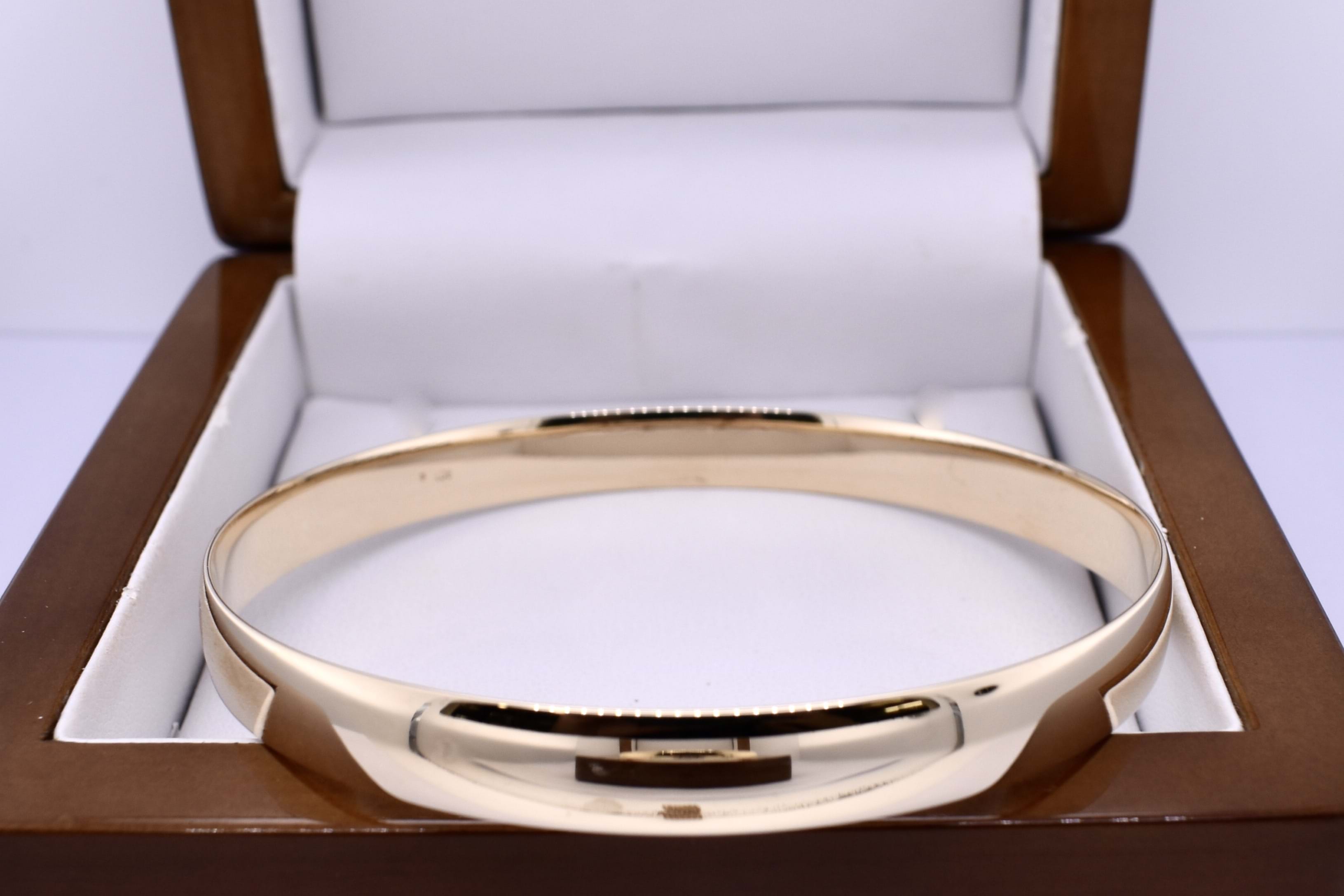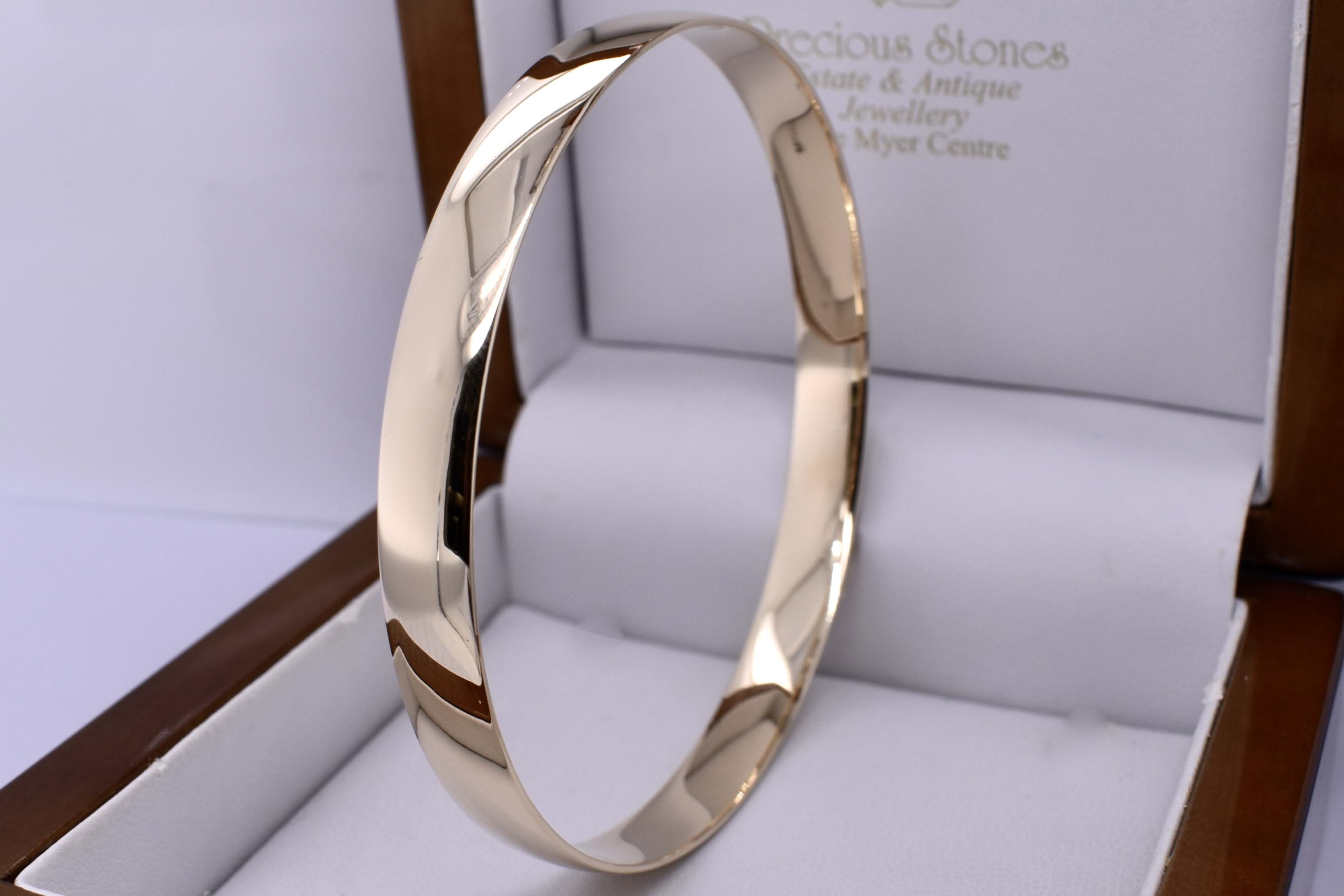 A classic and timeless jewellery collection staple, this solid, round bangle has been crafted in 9ct yellow gold with a high dome profile. Bangle is hand size 69mm and 8mm wide, with a depth of 1.5mm. Weighing 24.53grams.