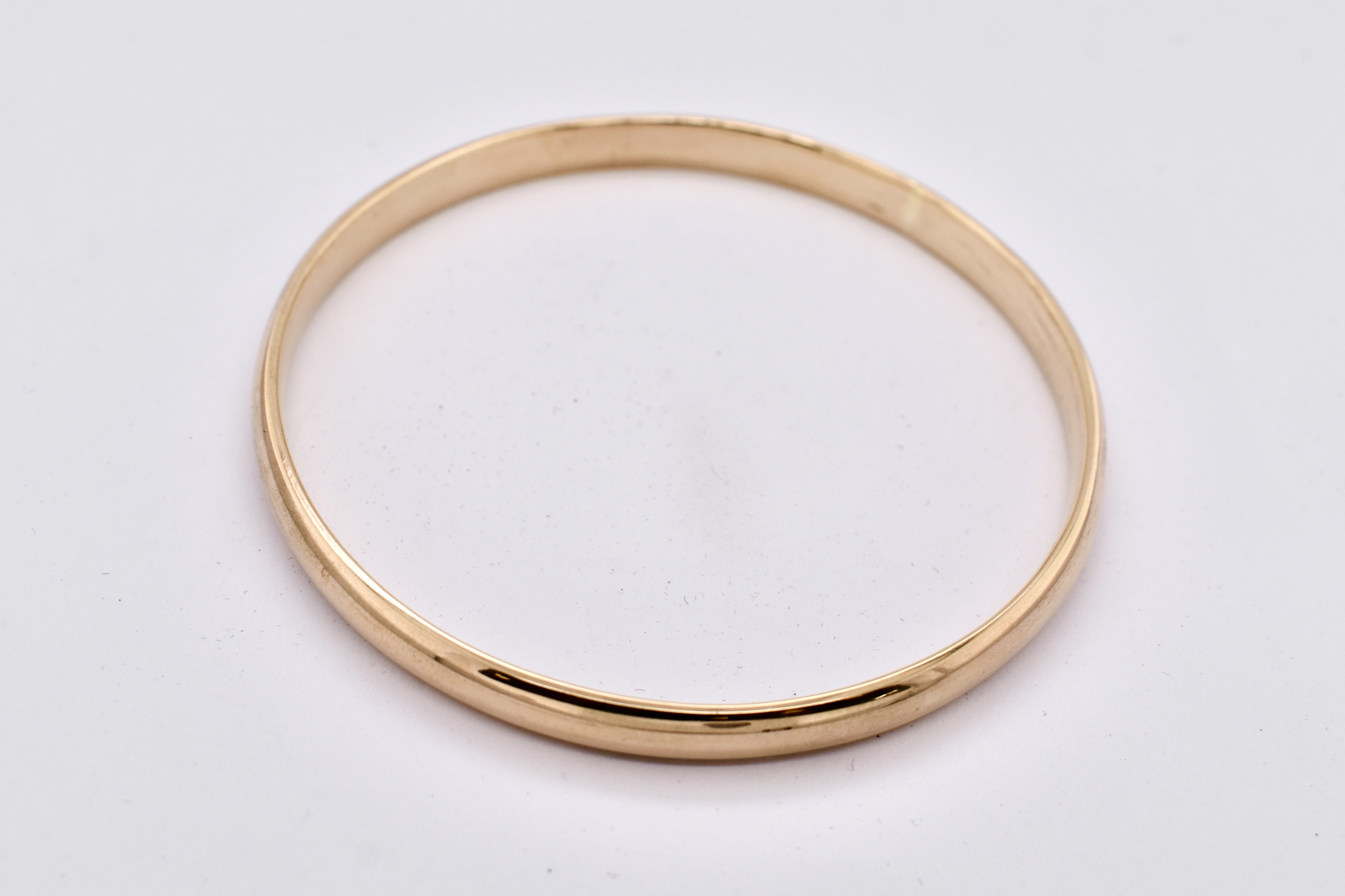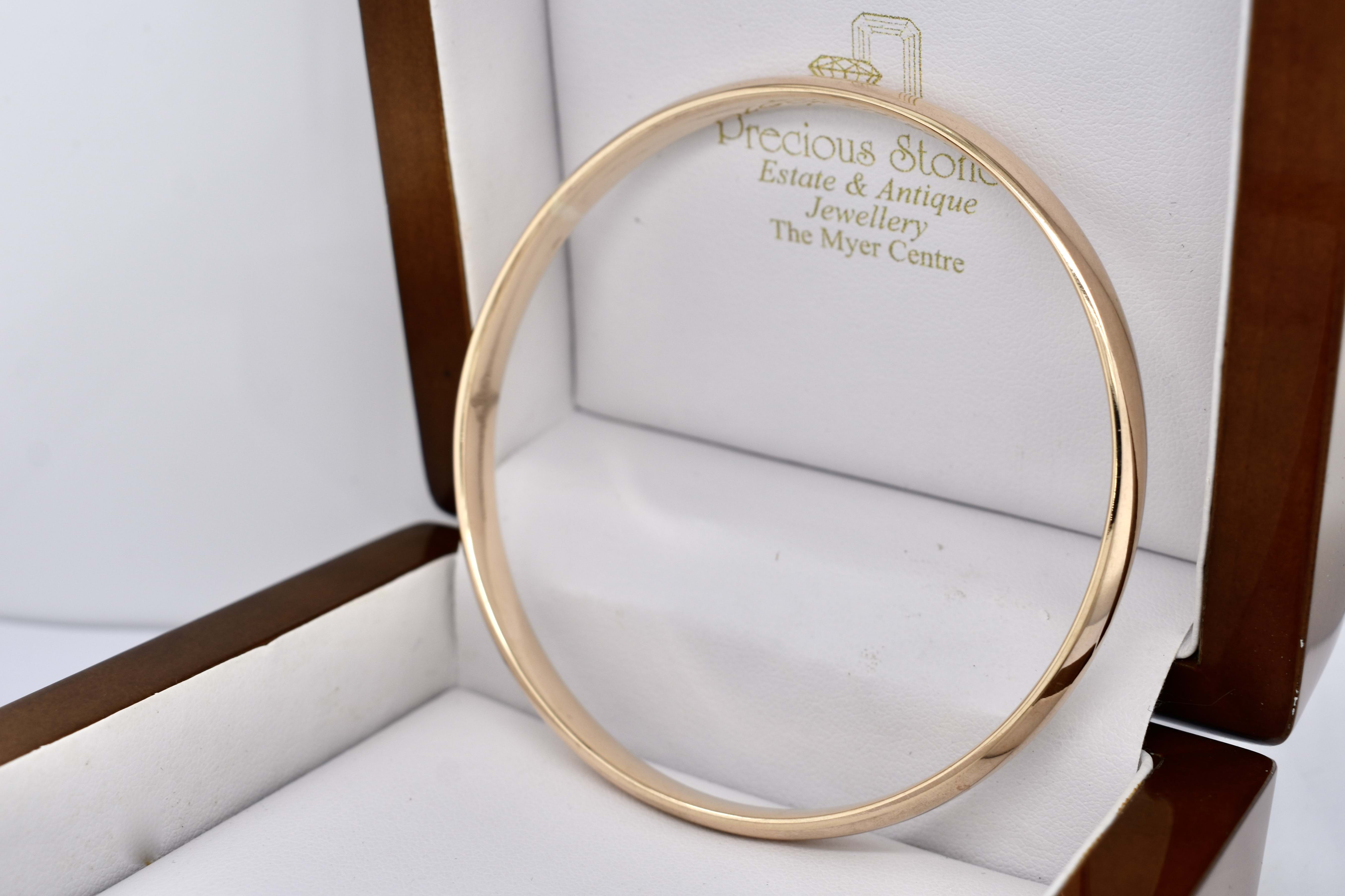 This lovely solid round bangle has been beautifully hand crafted by our talented goldsmith in 9ct yellow gold, with a hand size of 68mm and width of 6mm. Weighing 34.1 grams.