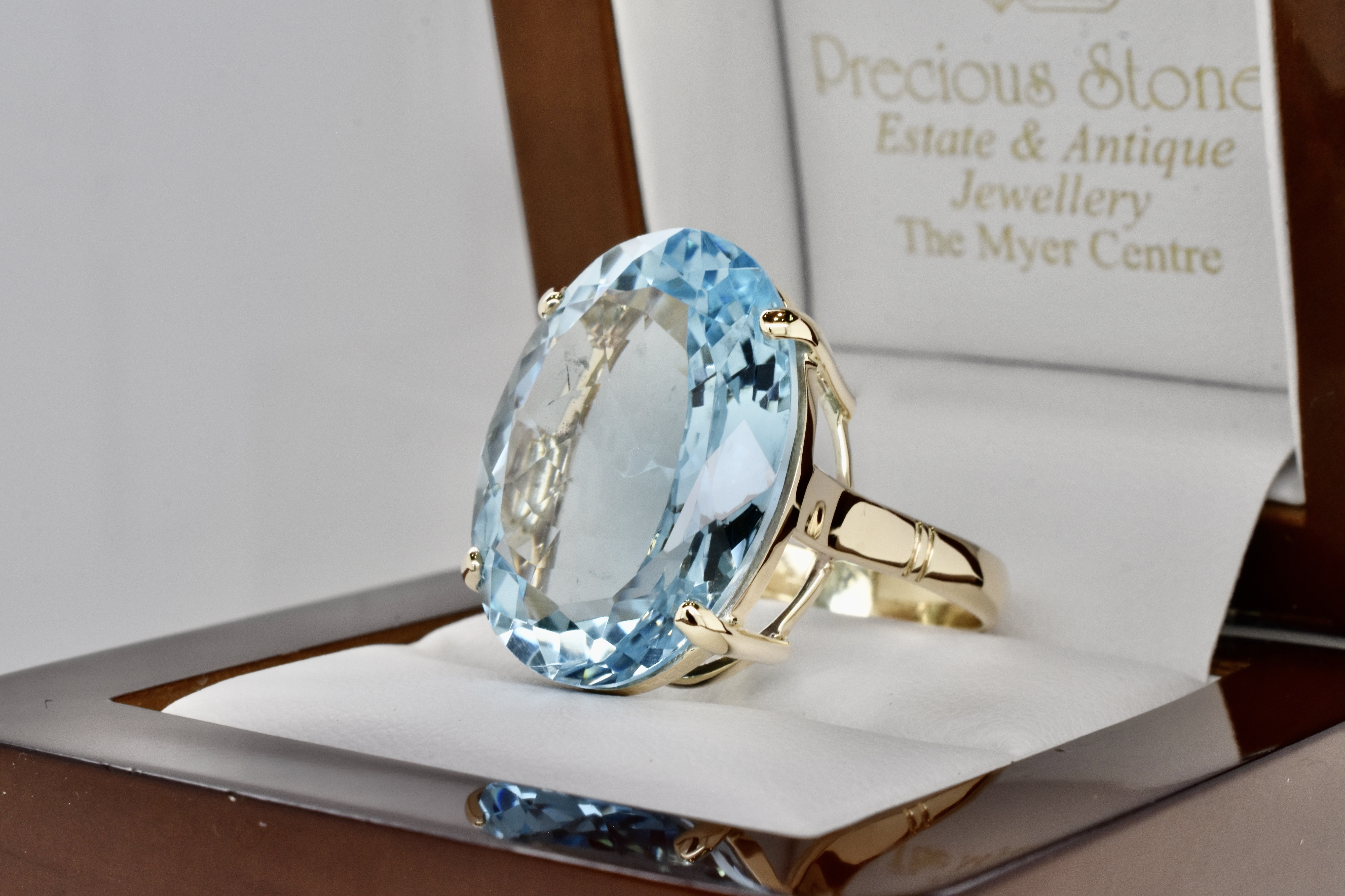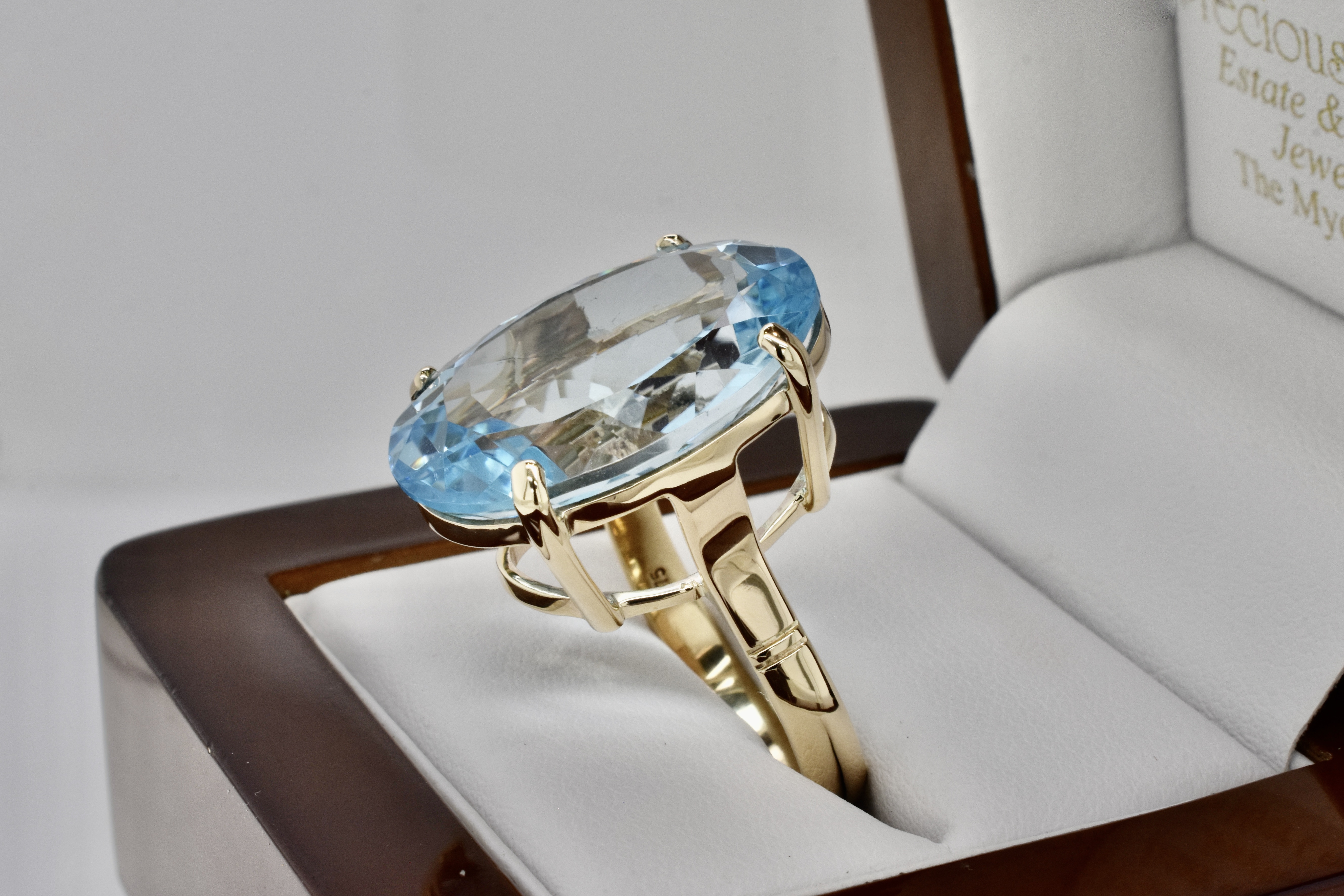 This fabulous and striking cocktail ring has been handmade in 9ct yellow gold and features an epic faceted oval sky blue topaz of 35.50cts measuring 23.8x18.2mm in a classic four claw setting with a plain band. Finger size S+. Independent Valuation Supplied
