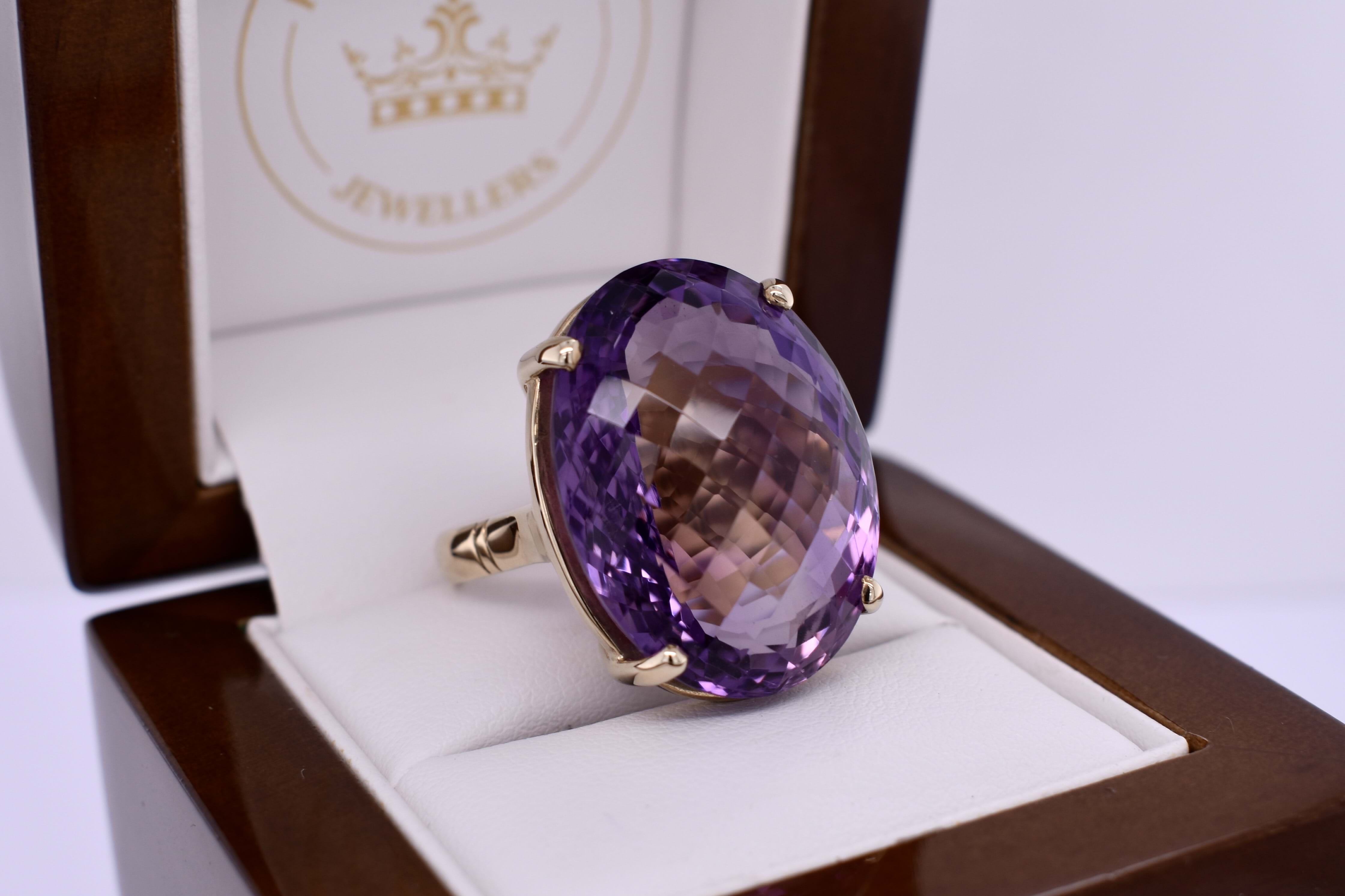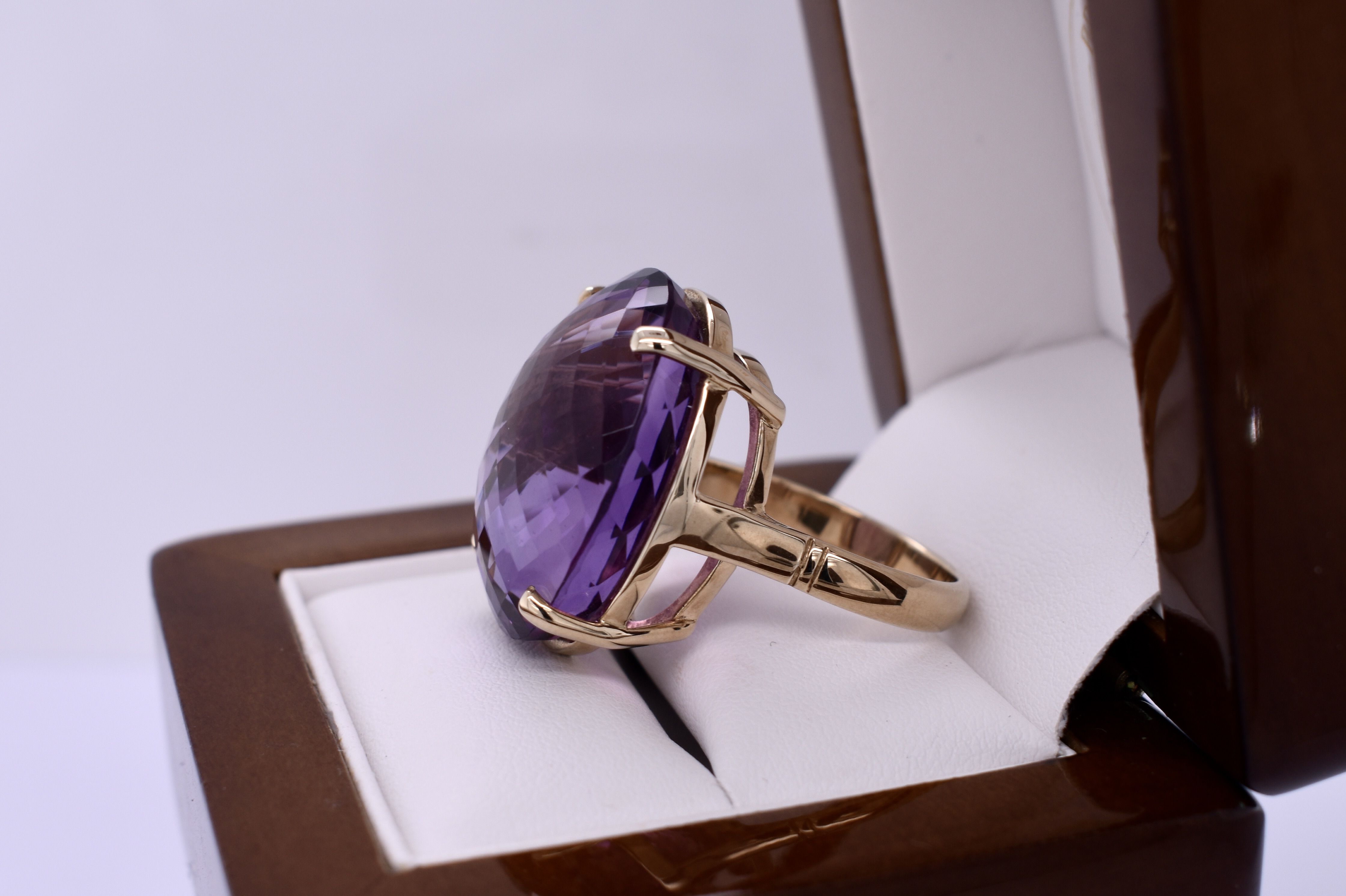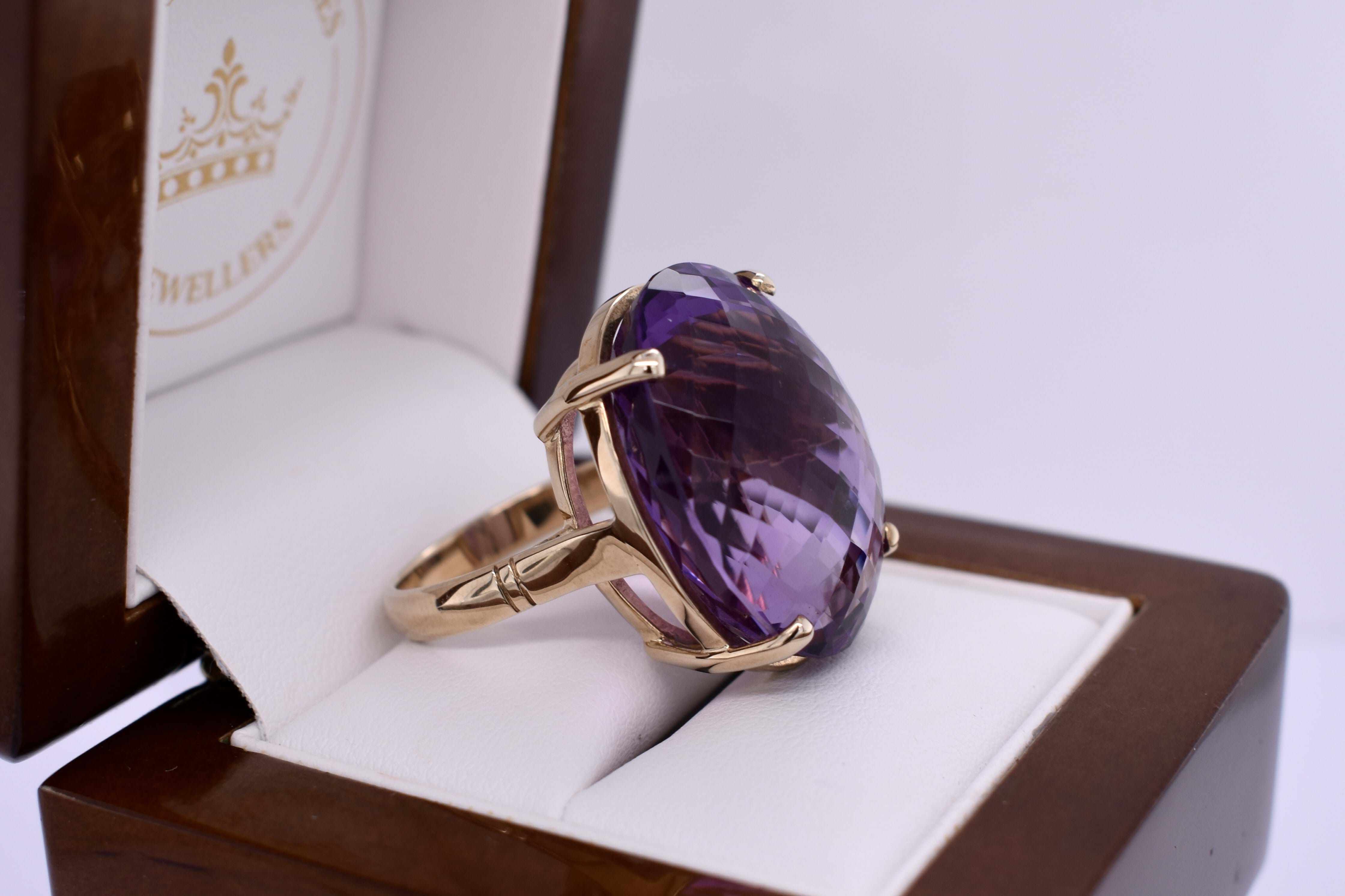 This dazzling ring features a large checkerboard cut oval amethyst weighing 39cts and measuring approx. 26x19.2mm. The stone is secured with a 9ct yellow gold four claw setting and is finished on a plain, grooved band. Finger size S. Independent valuation supplied.