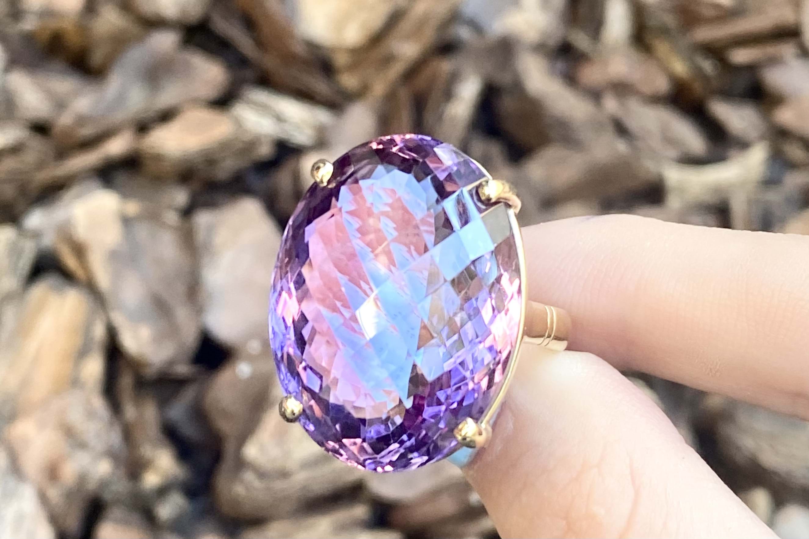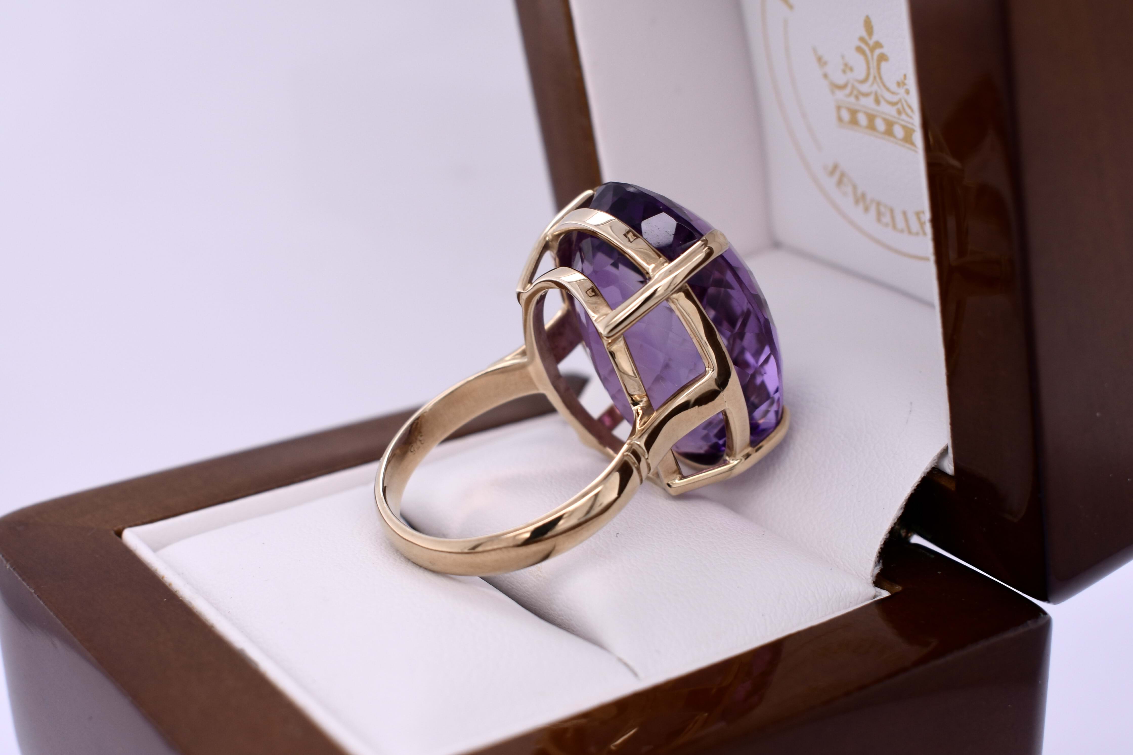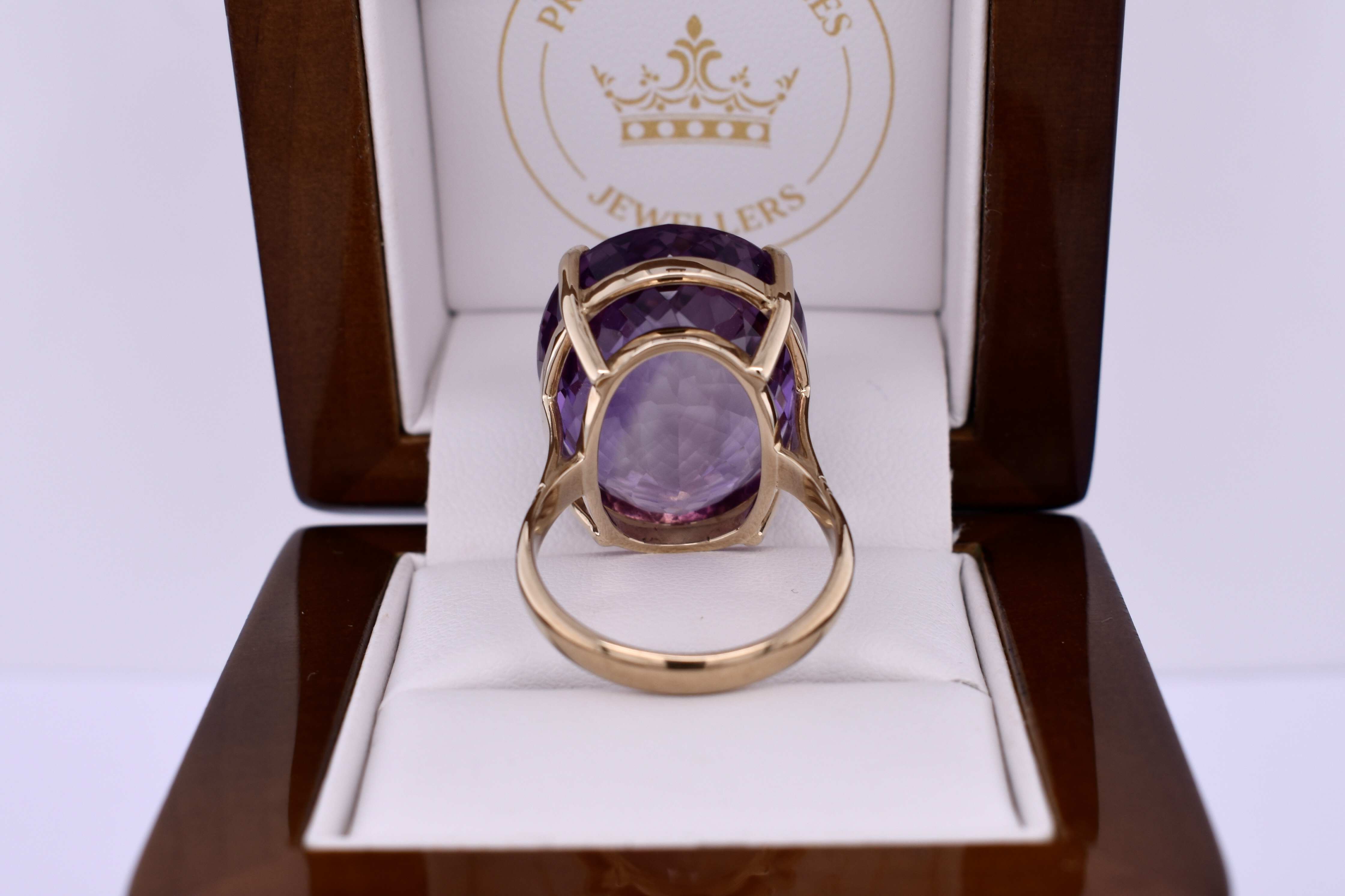 This dazzling ring features a large checkerboard cut oval amethyst weighing 39cts and measuring approx. 26x19.2mm. The stone is secured with a 9ct yellow gold four claw setting and is finished on a plain, grooved band. Finger size S. Independent valuation supplied.