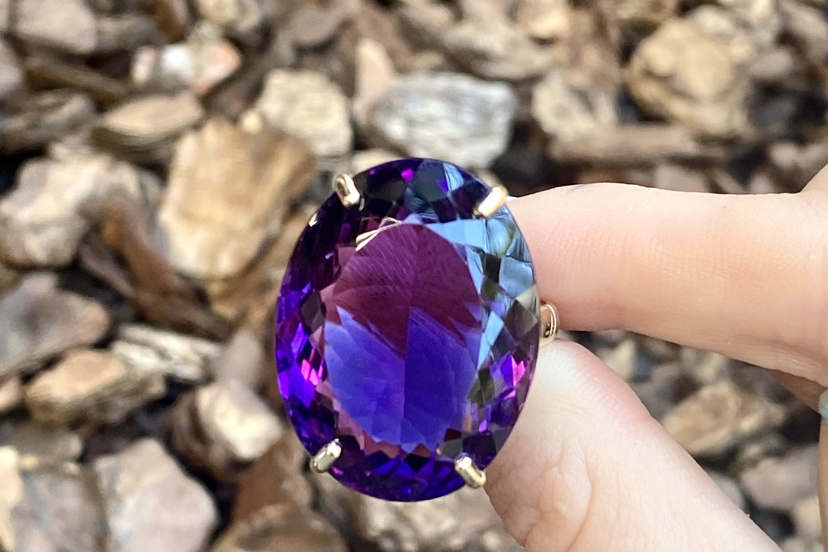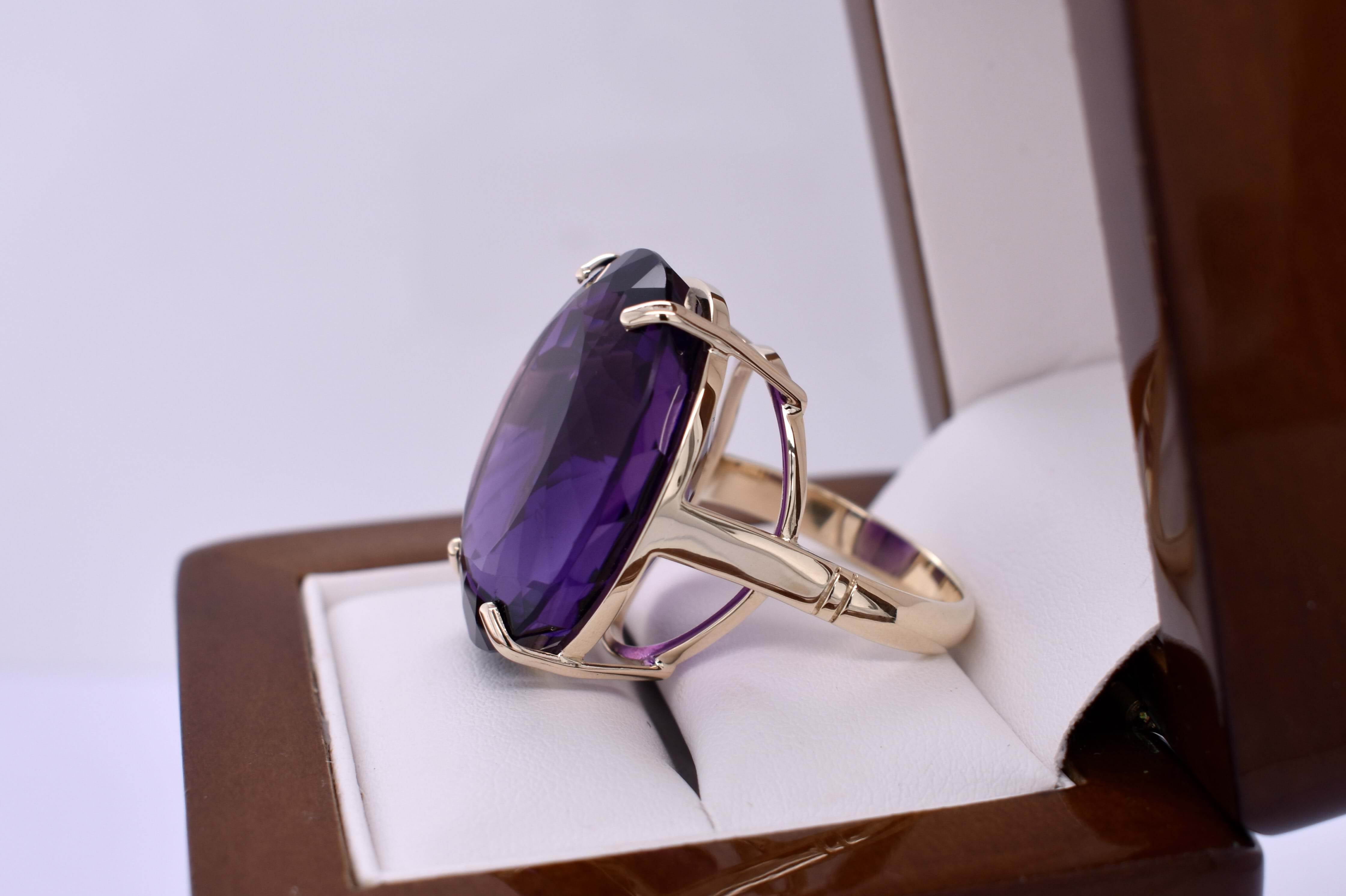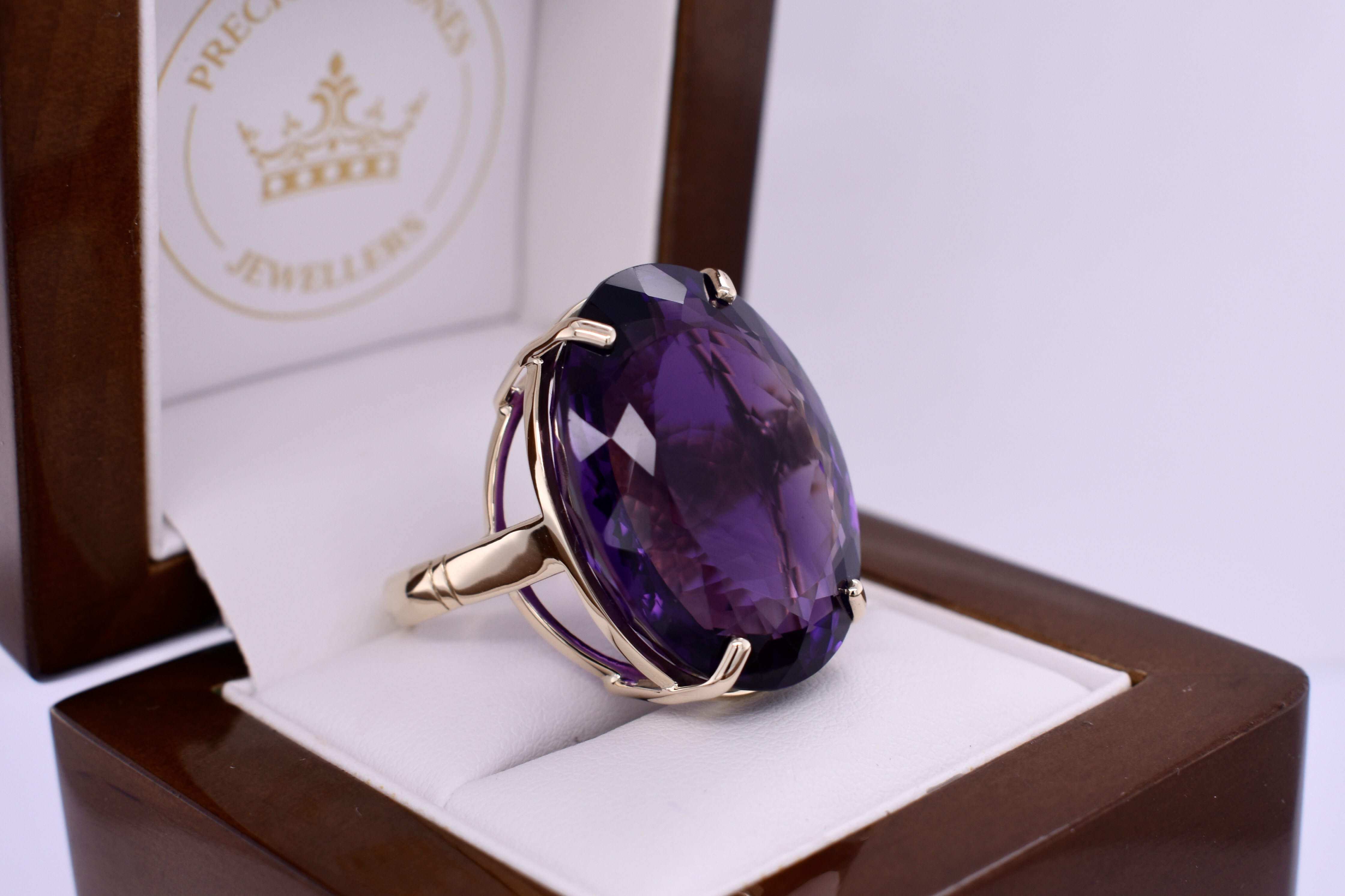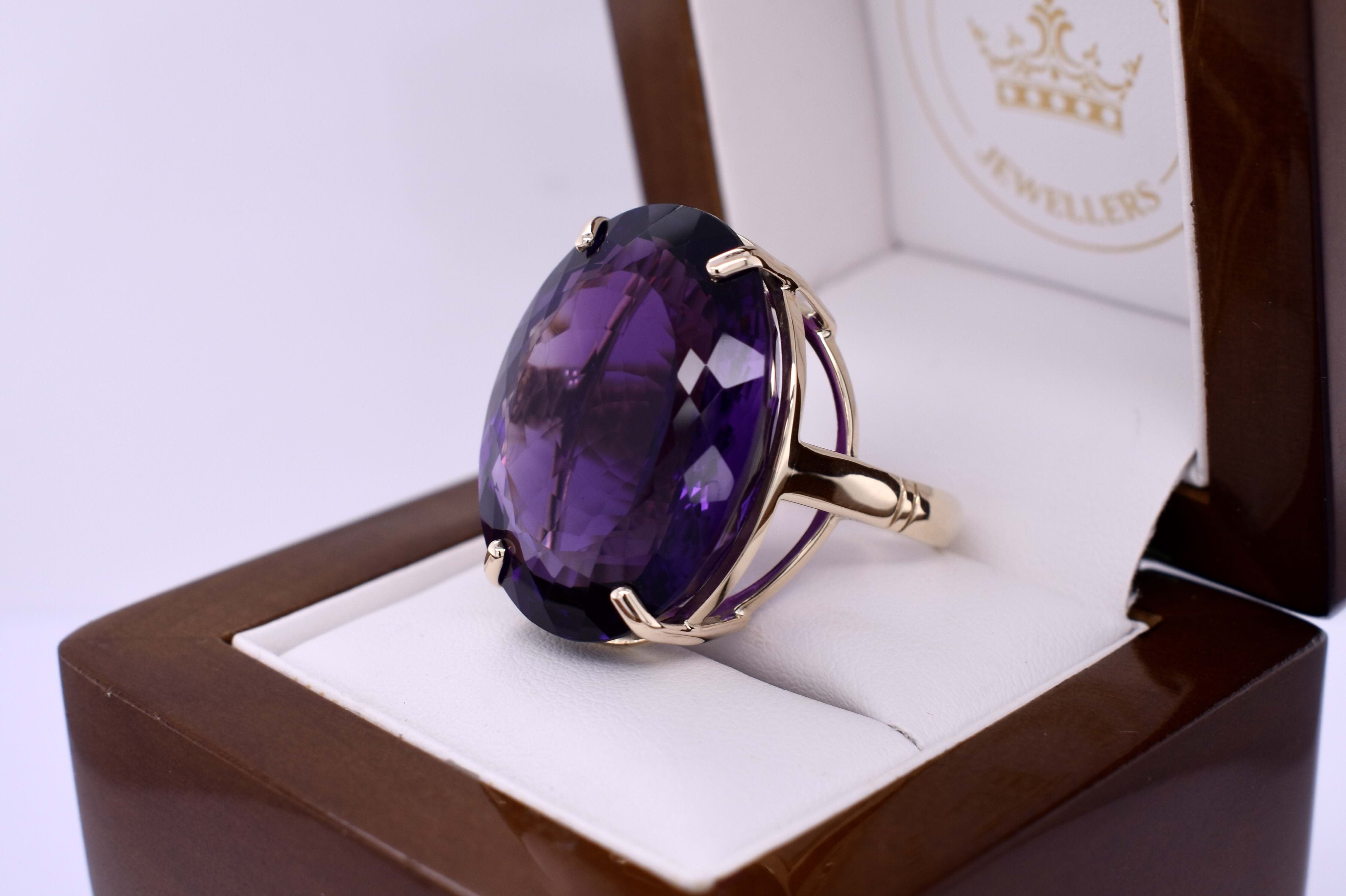 This vivid ring features a giant oval amethyst weighing 41cts and measuring approx. 28x21.2mm. The stone is secured with a 9ct yellow gold four claw setting and is finished on a plain, grooved band. Finger size S. Independent valuation supplied.