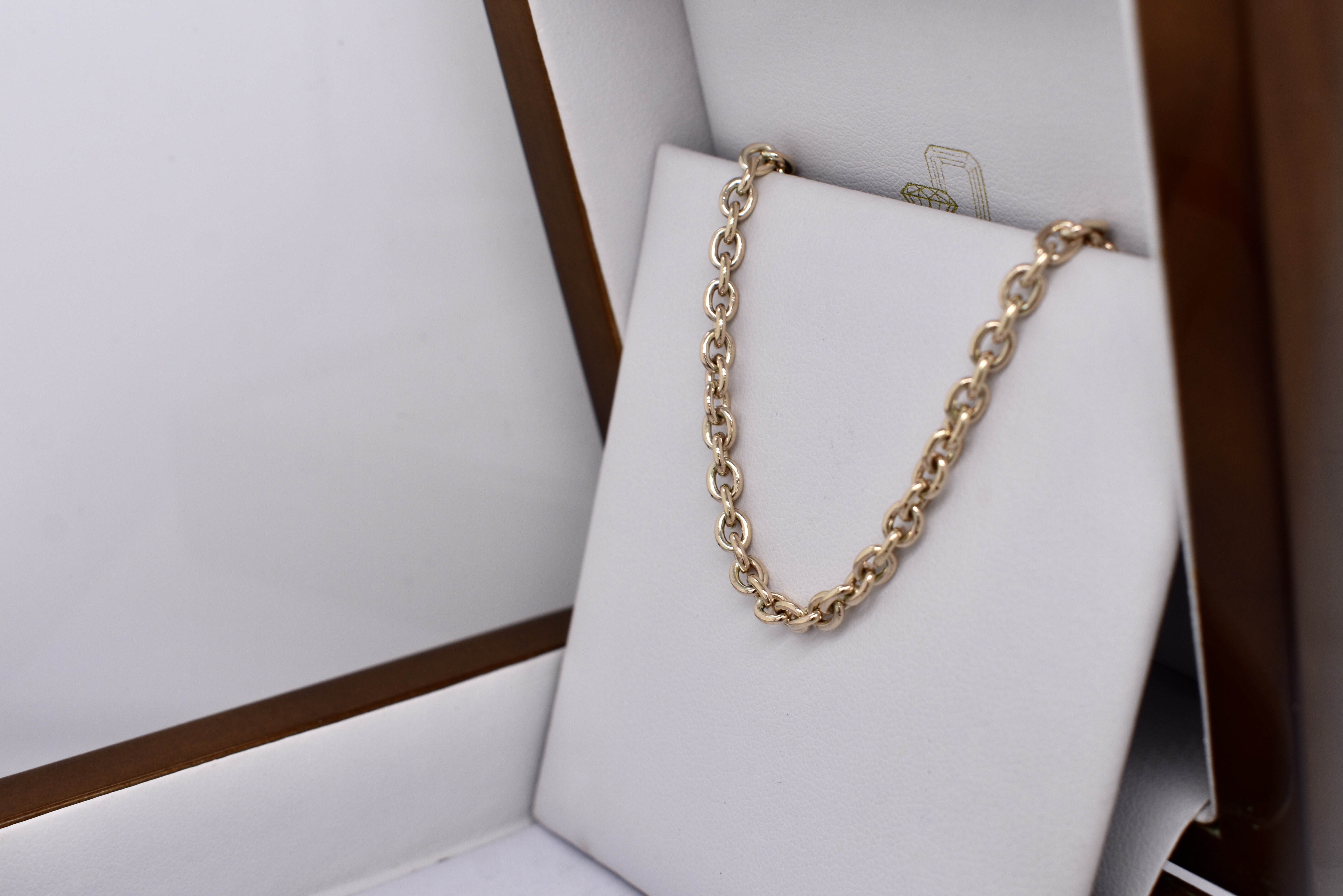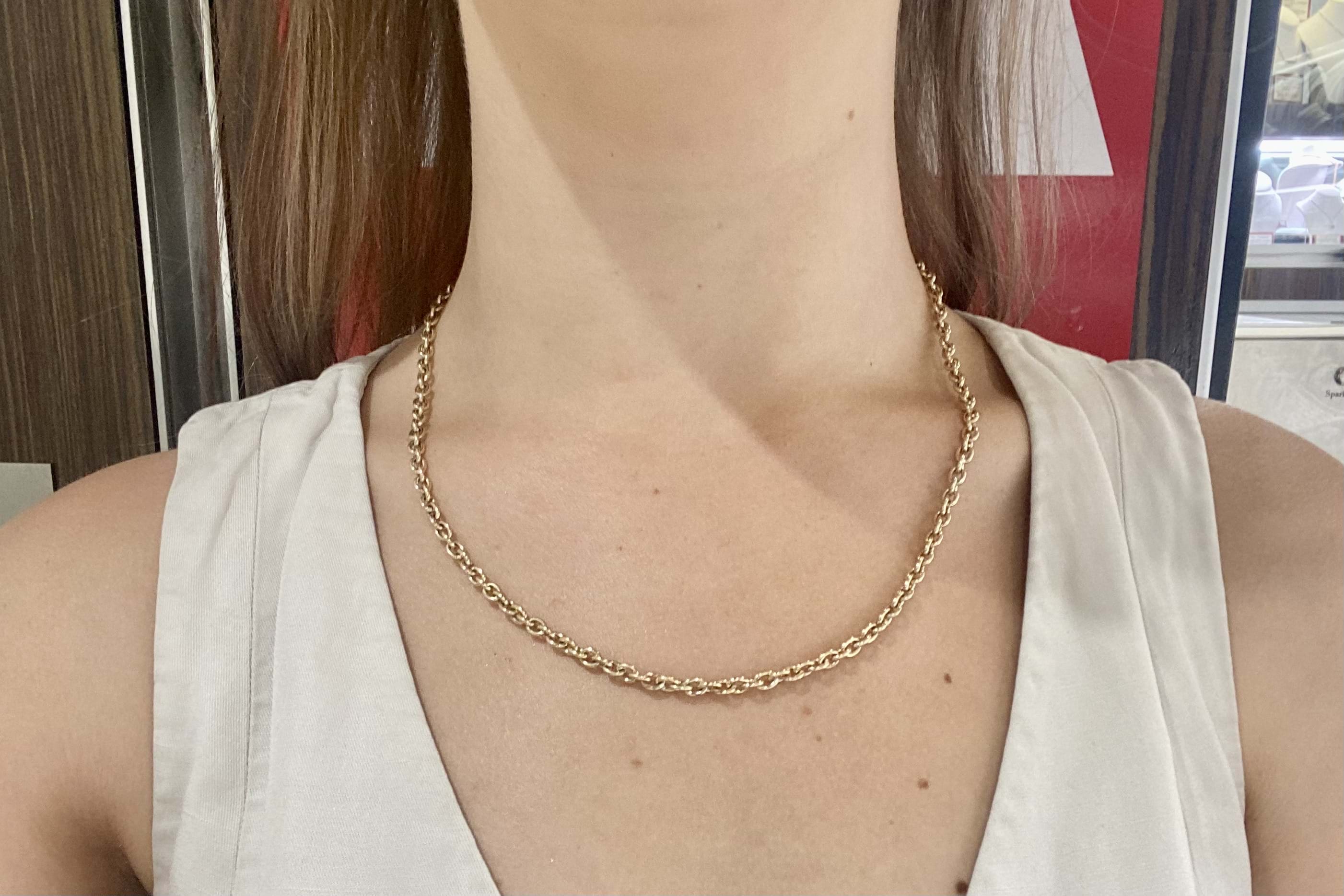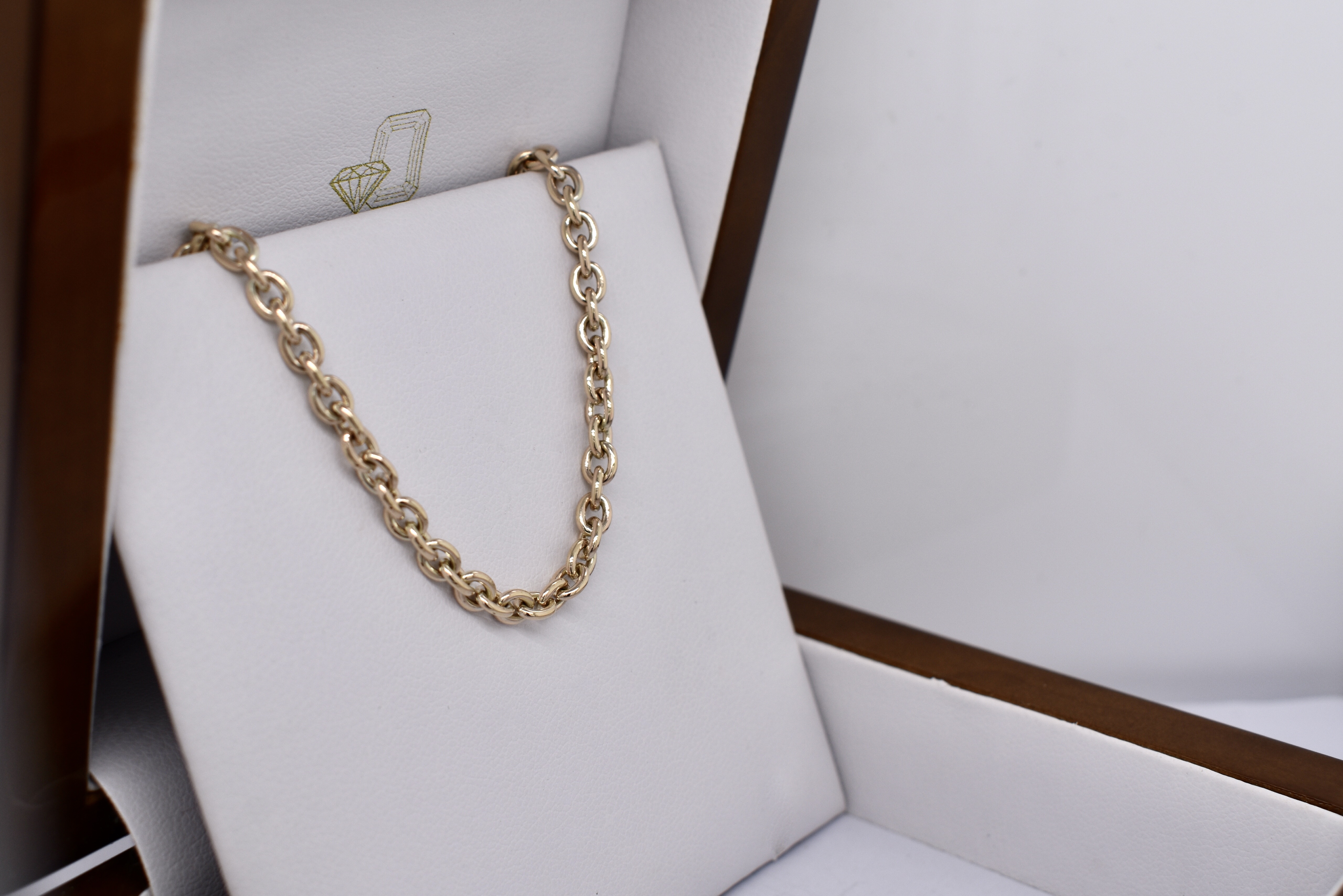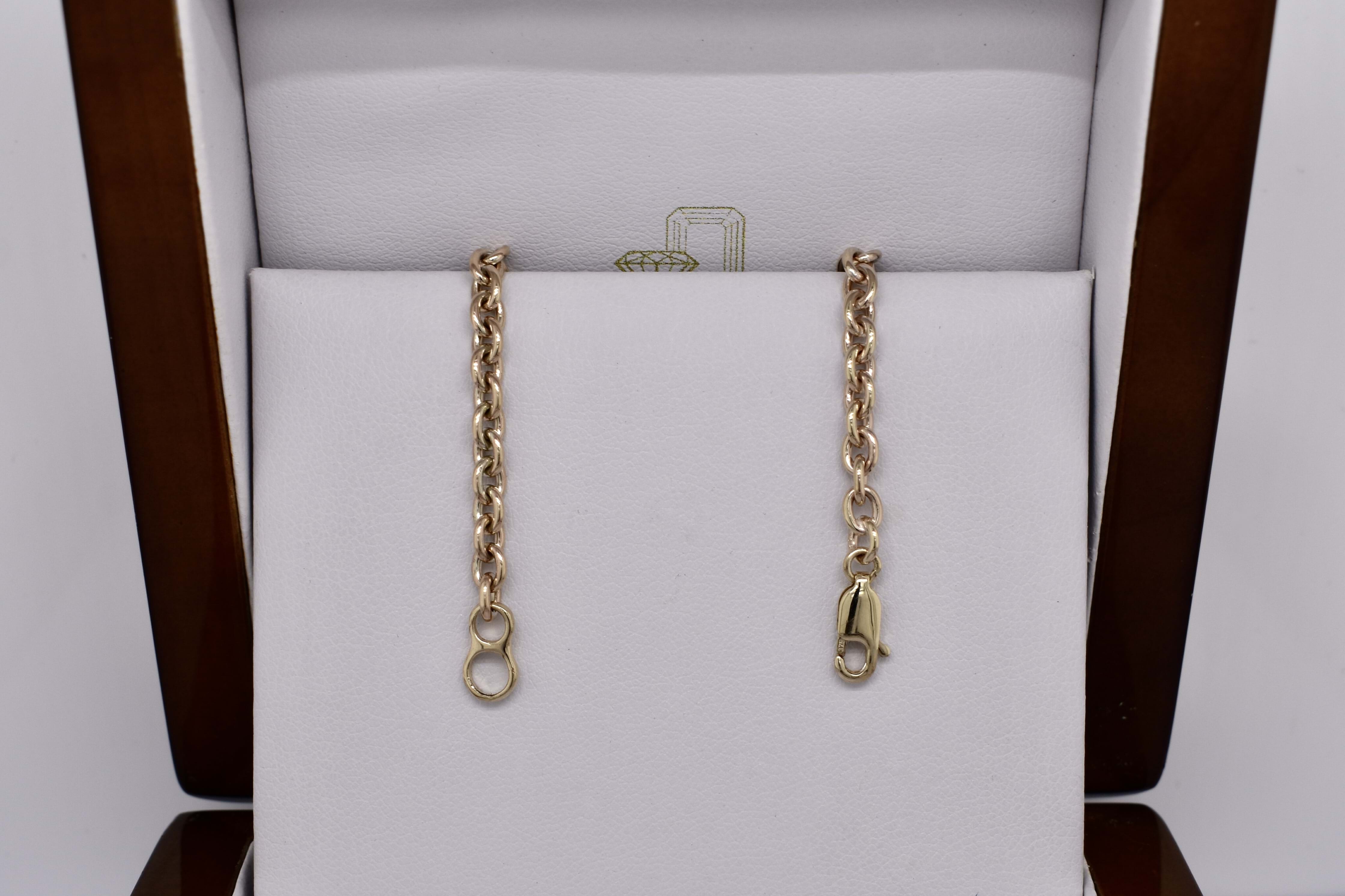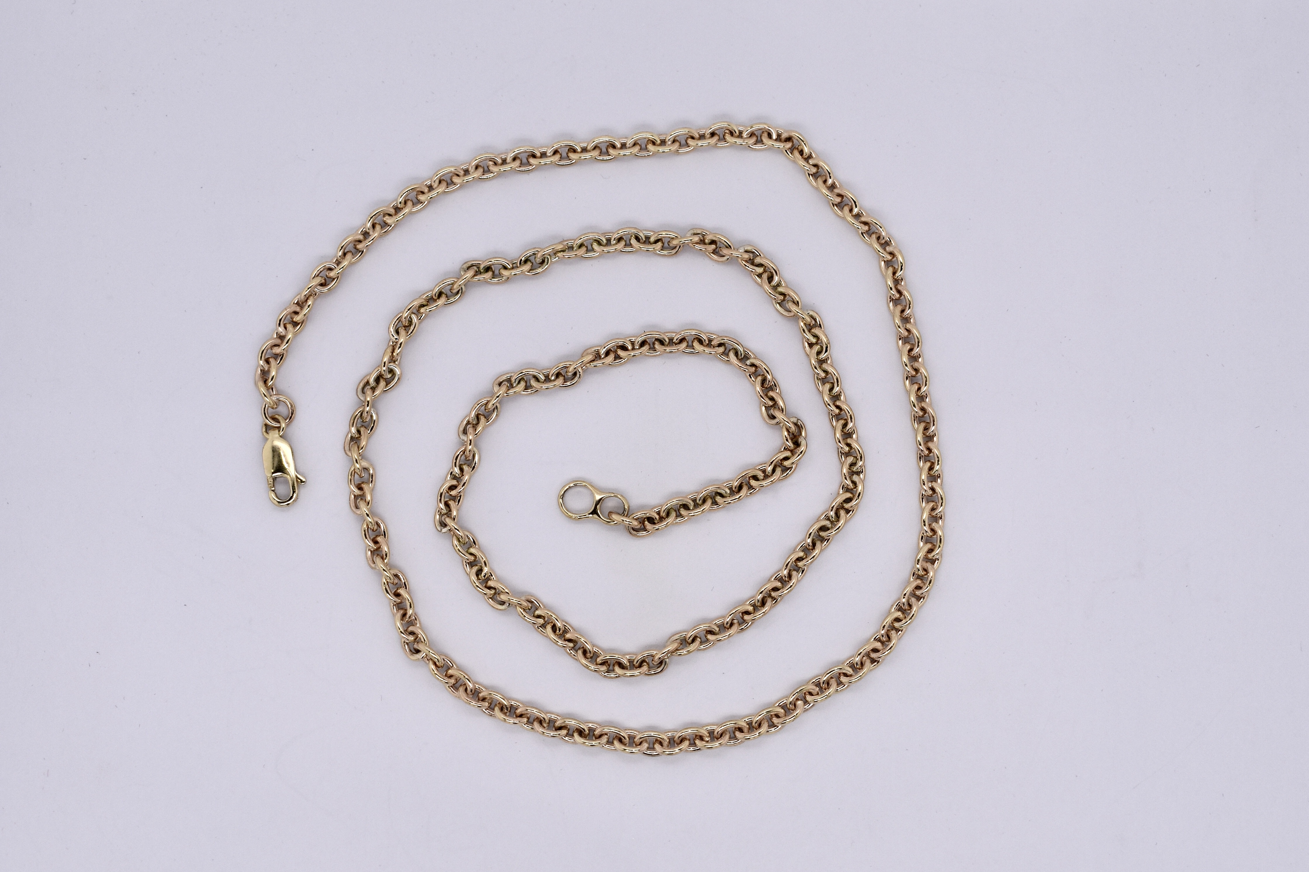 Hand crafted by our amazing goldsmith, this 9ct yellow gold cable link chain measures 56cm long and is completed with a parrot clasp. Weighs 19.1 grams.
