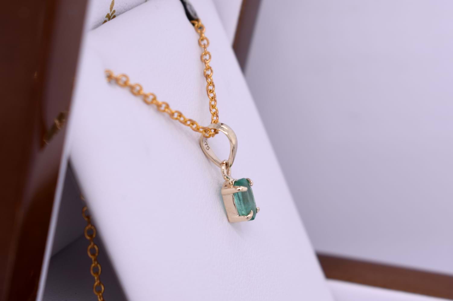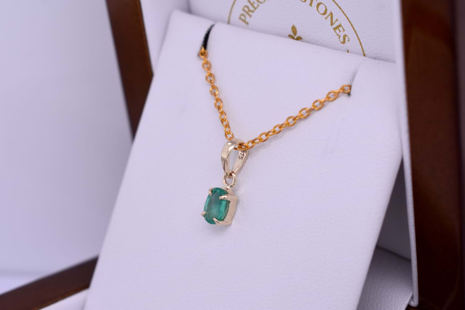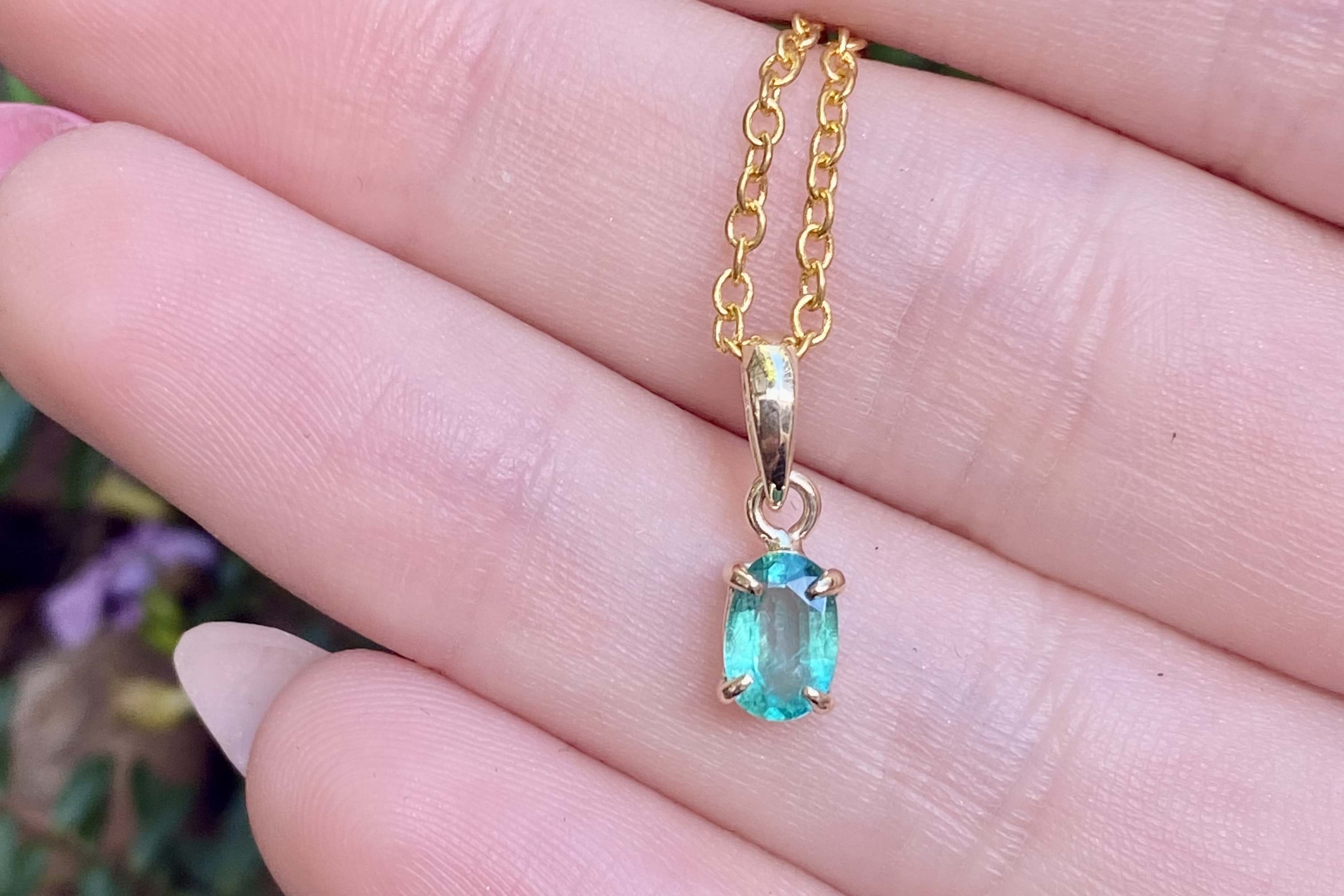 This pretty little emerald originating from Zambia measures approx. 6.1x4.5mm, and is four claw set into a handmade 9ct yellow gold setting. Finished with a plain bale. Chains are available for separate purchase.