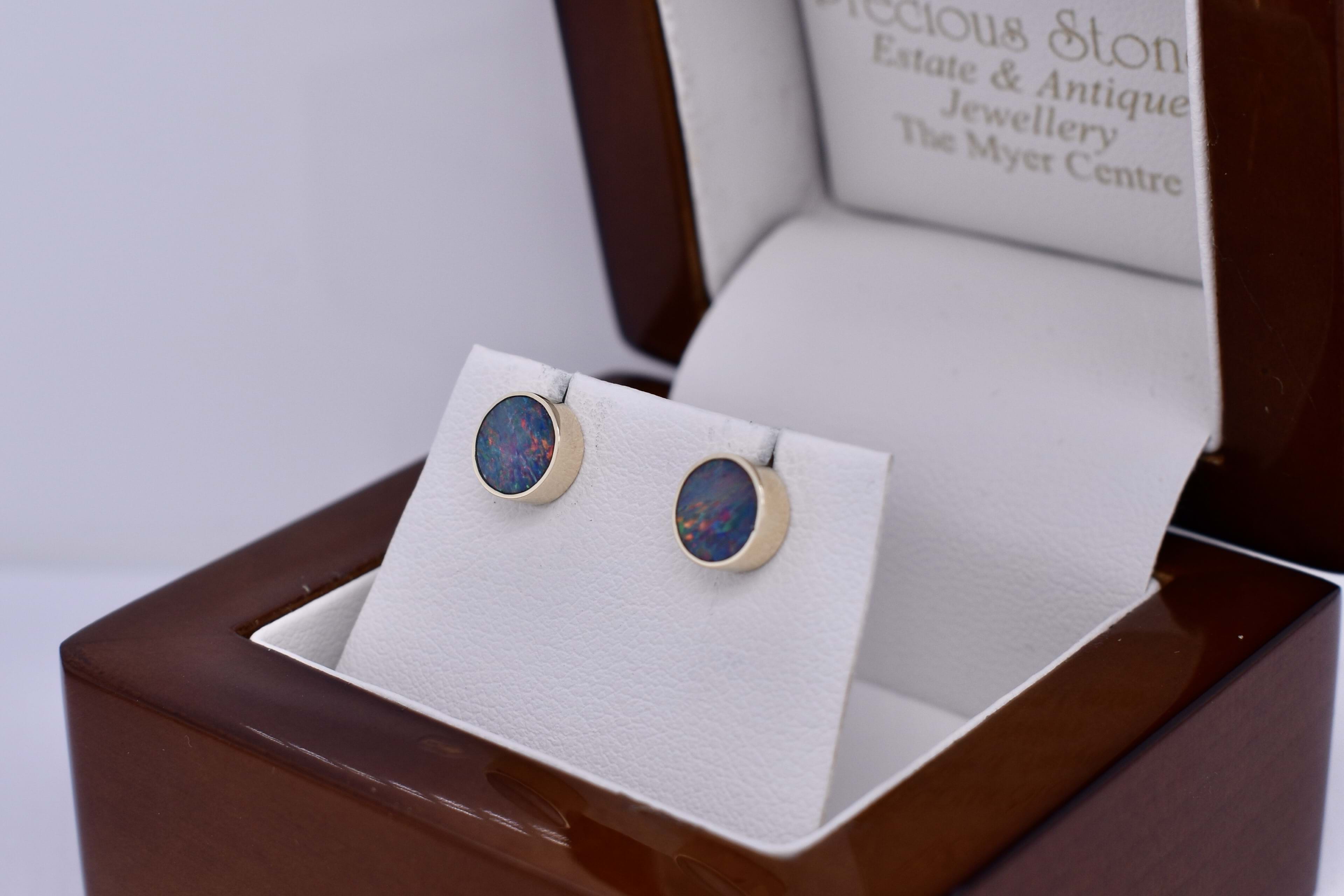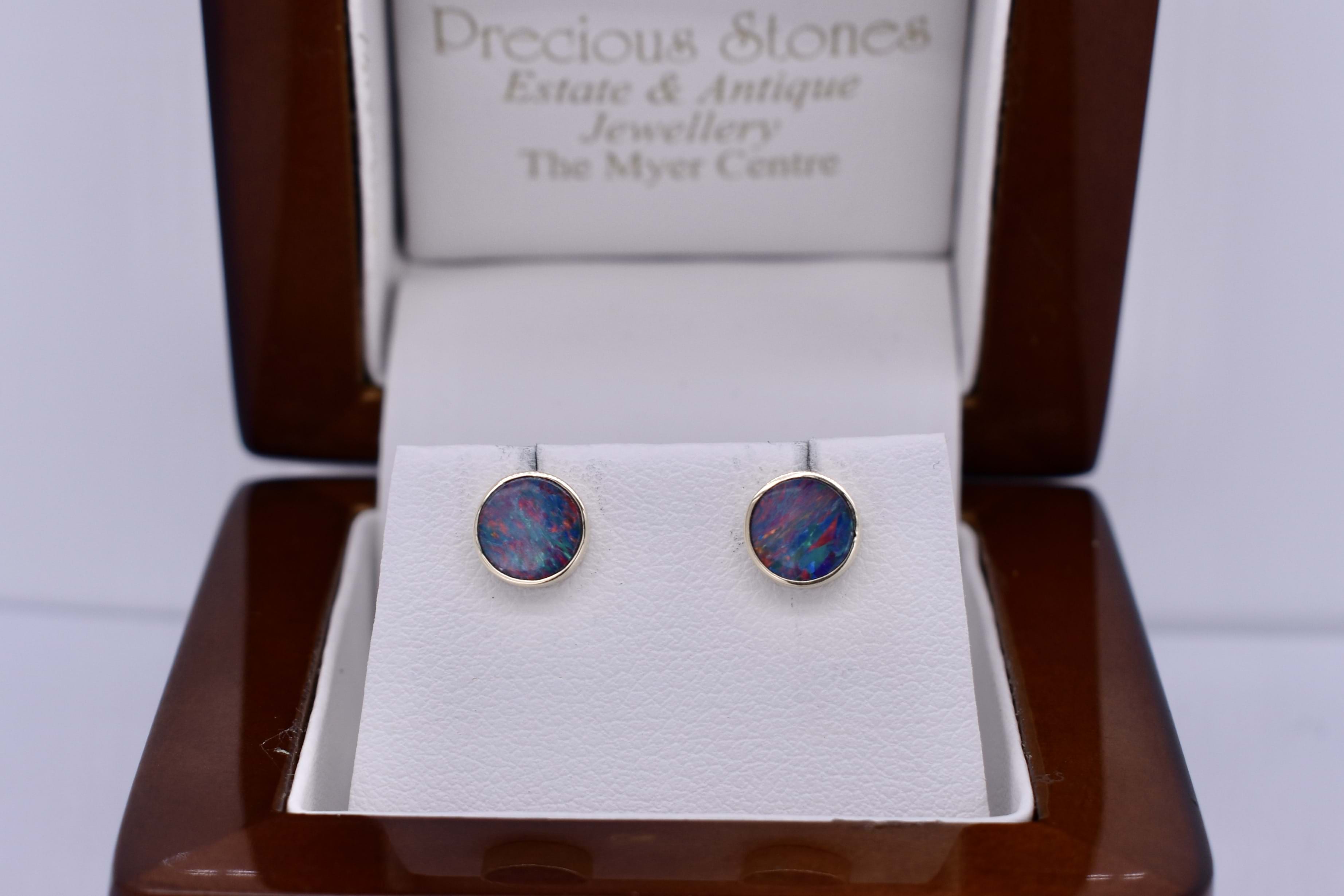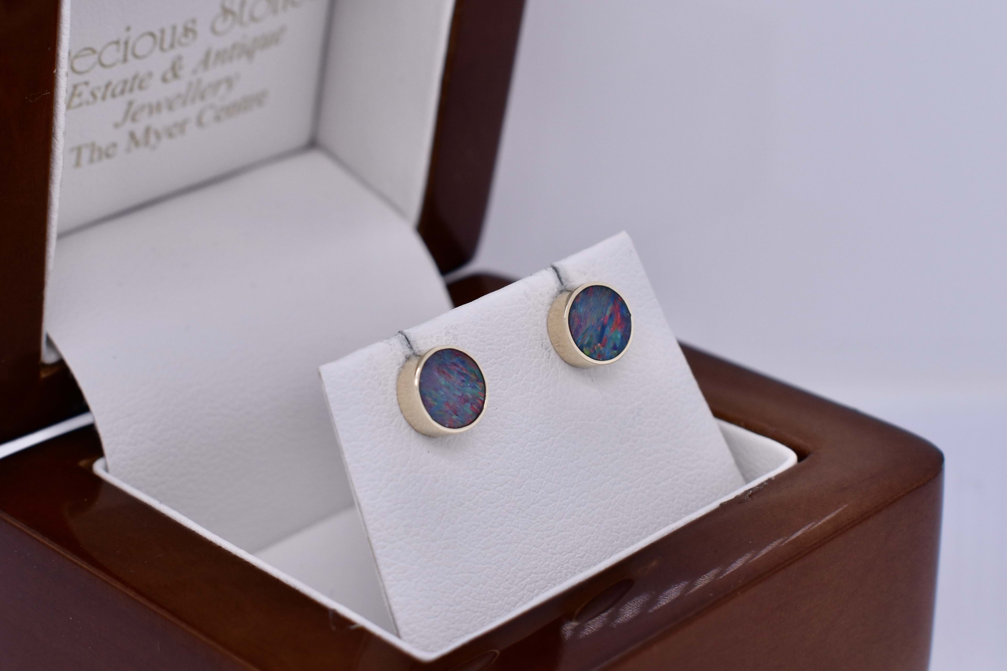 The sweetest pair of studs crafted in 9ct yellow gold, with two dark Coober Pedy opal doublets with flashes of green, orange and yellow throughout. The doublet consisting of Coober Pedy opal (on top) with a boulder opal backing. Studs measuring approx. 6.8mm round and are bezel set, with post and butterfly fittings.