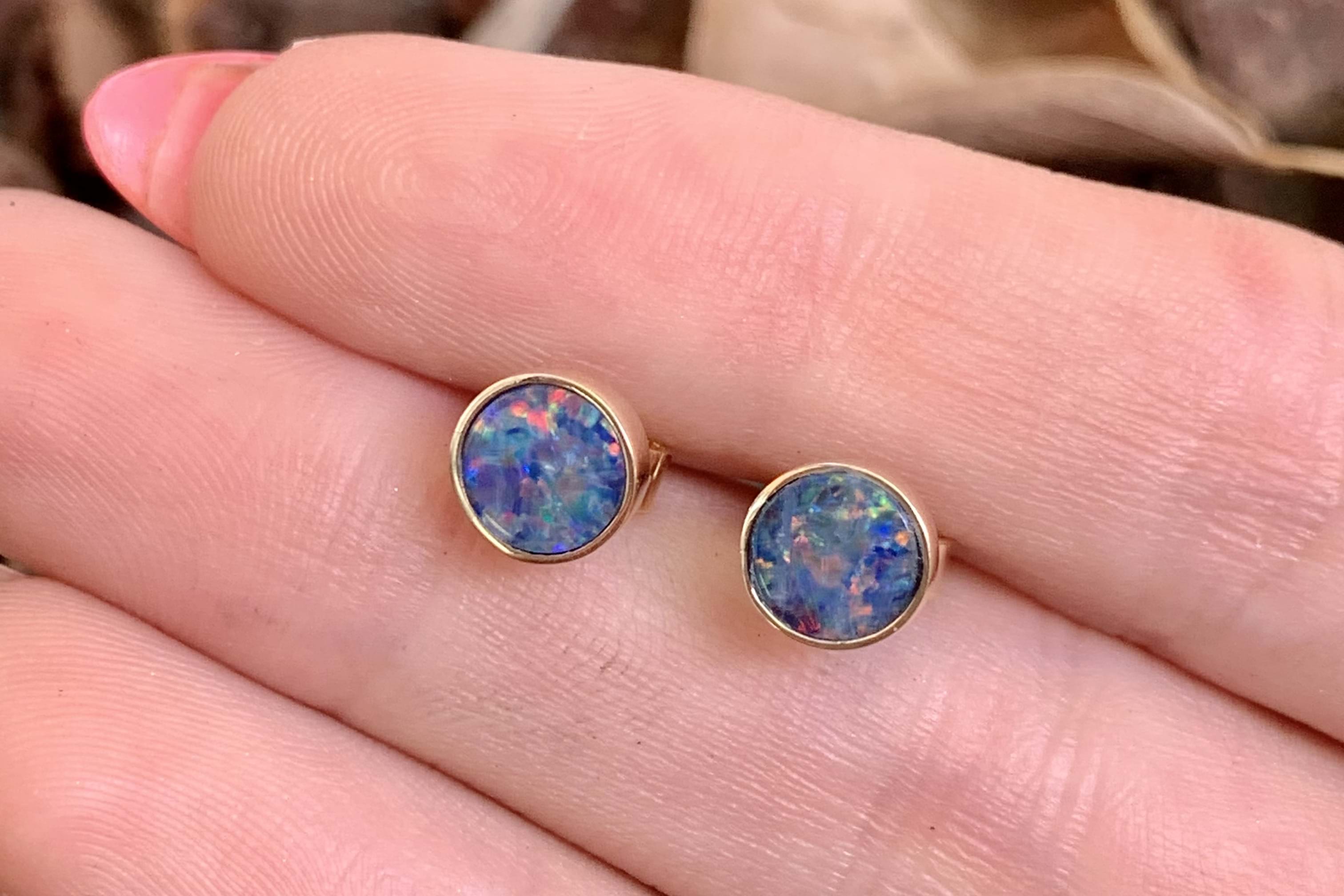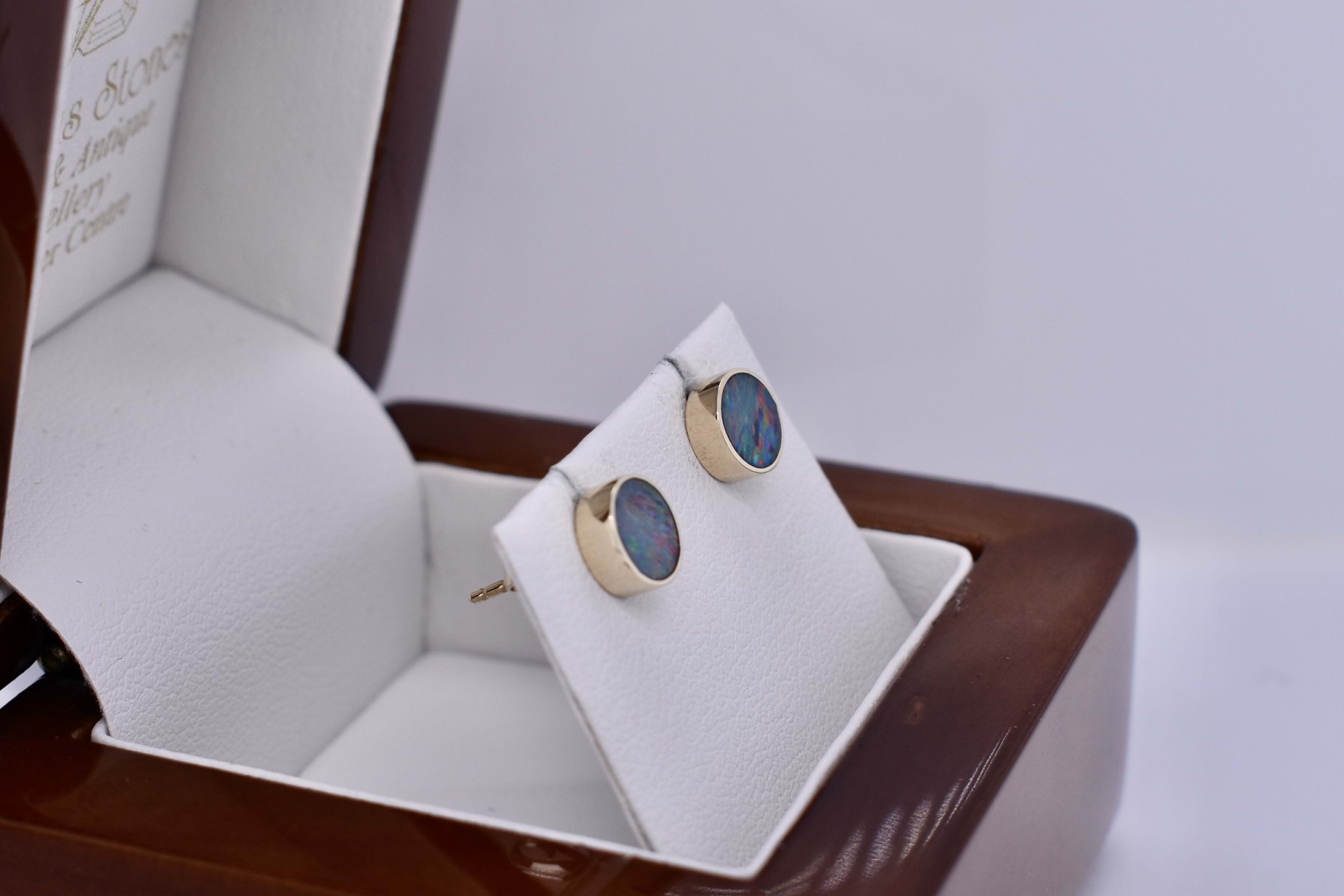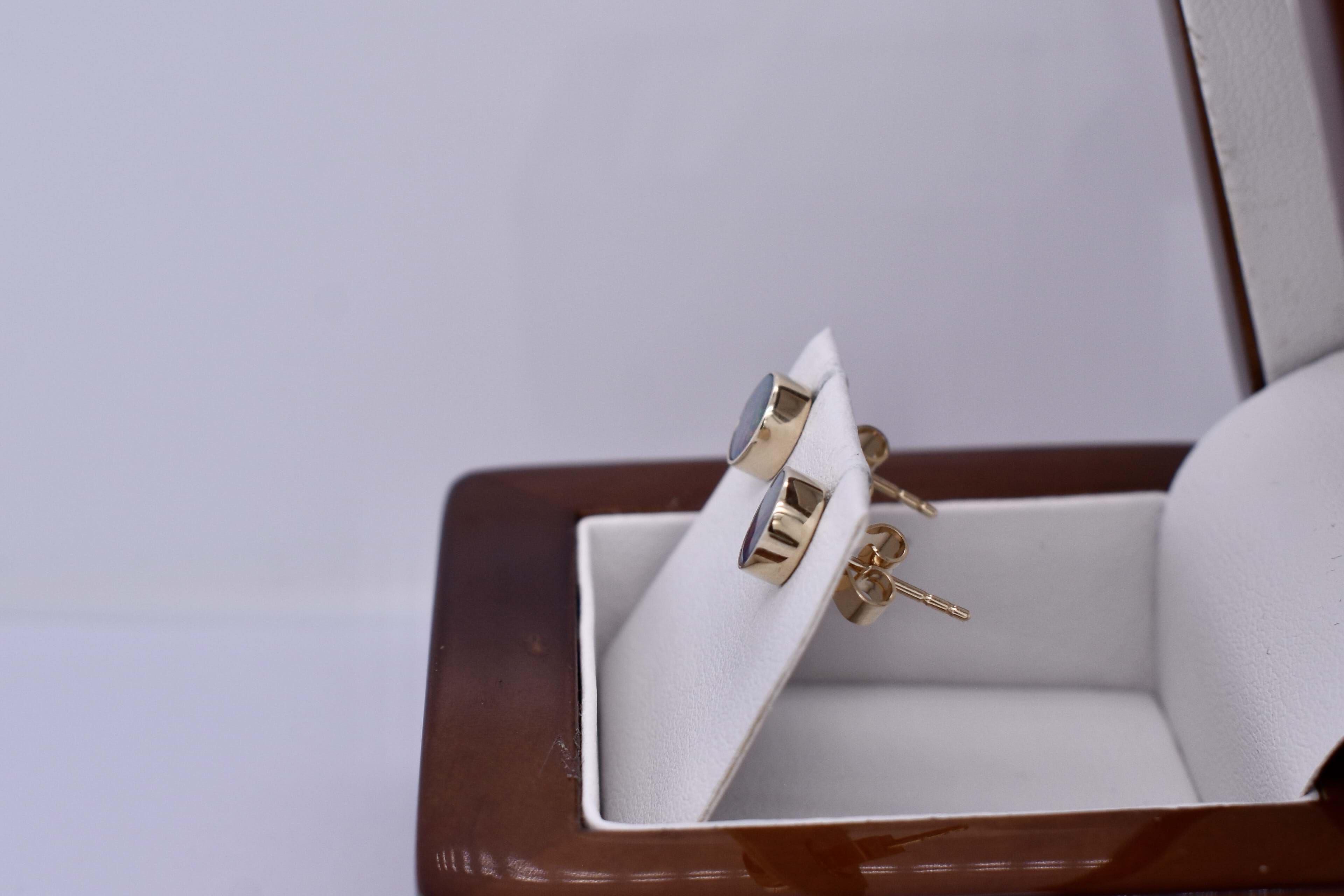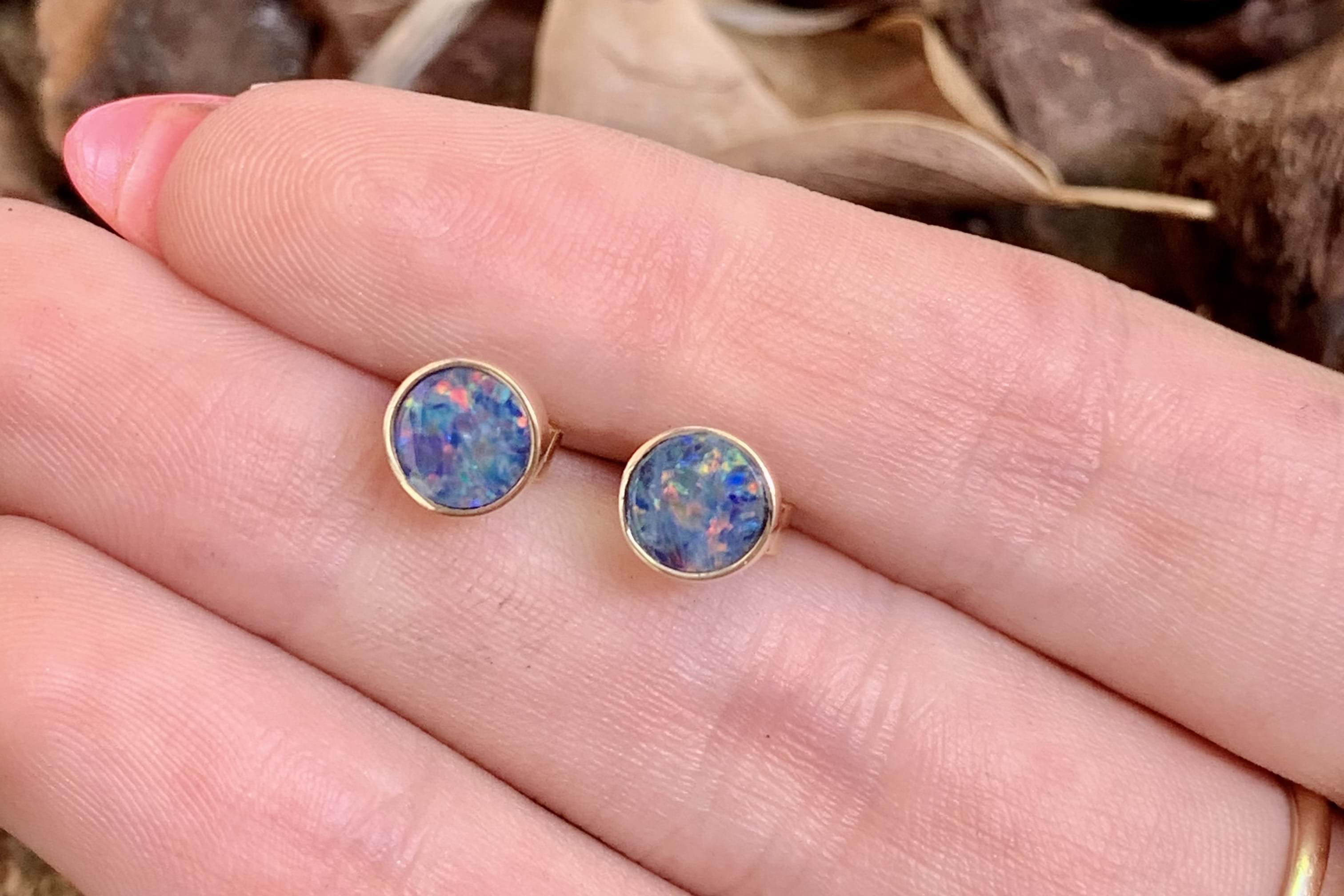 The sweetest pair of studs crafted in 9ct yellow gold, with two dark Coober Pedy opal doublets with flashes of green, orange and yellow throughout. The doublet consisting of Coober Pedy opal (on top) with a boulder opal backing. Studs measuring approx. 6.8mm round and are bezel set, with post and butterfly fittings.