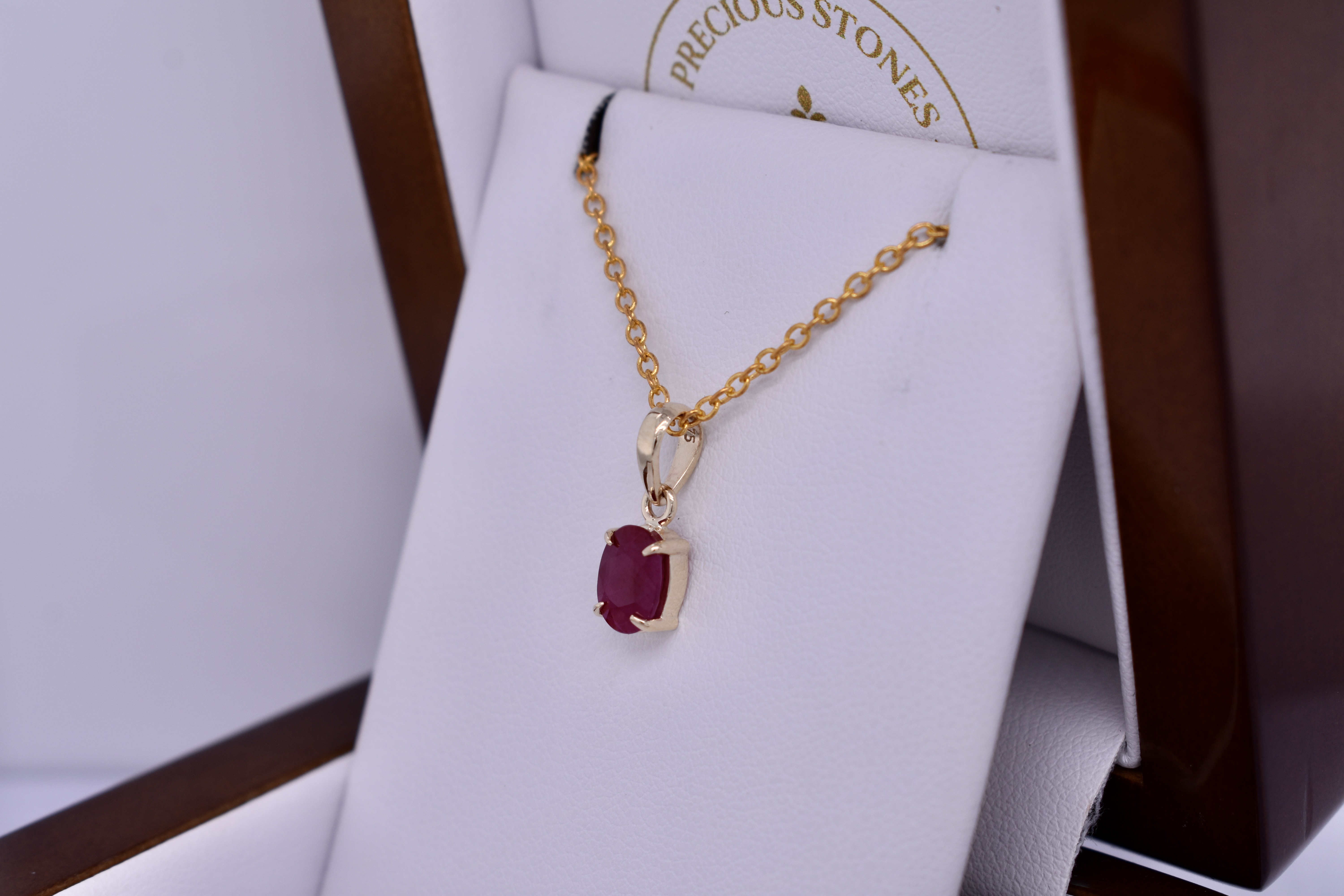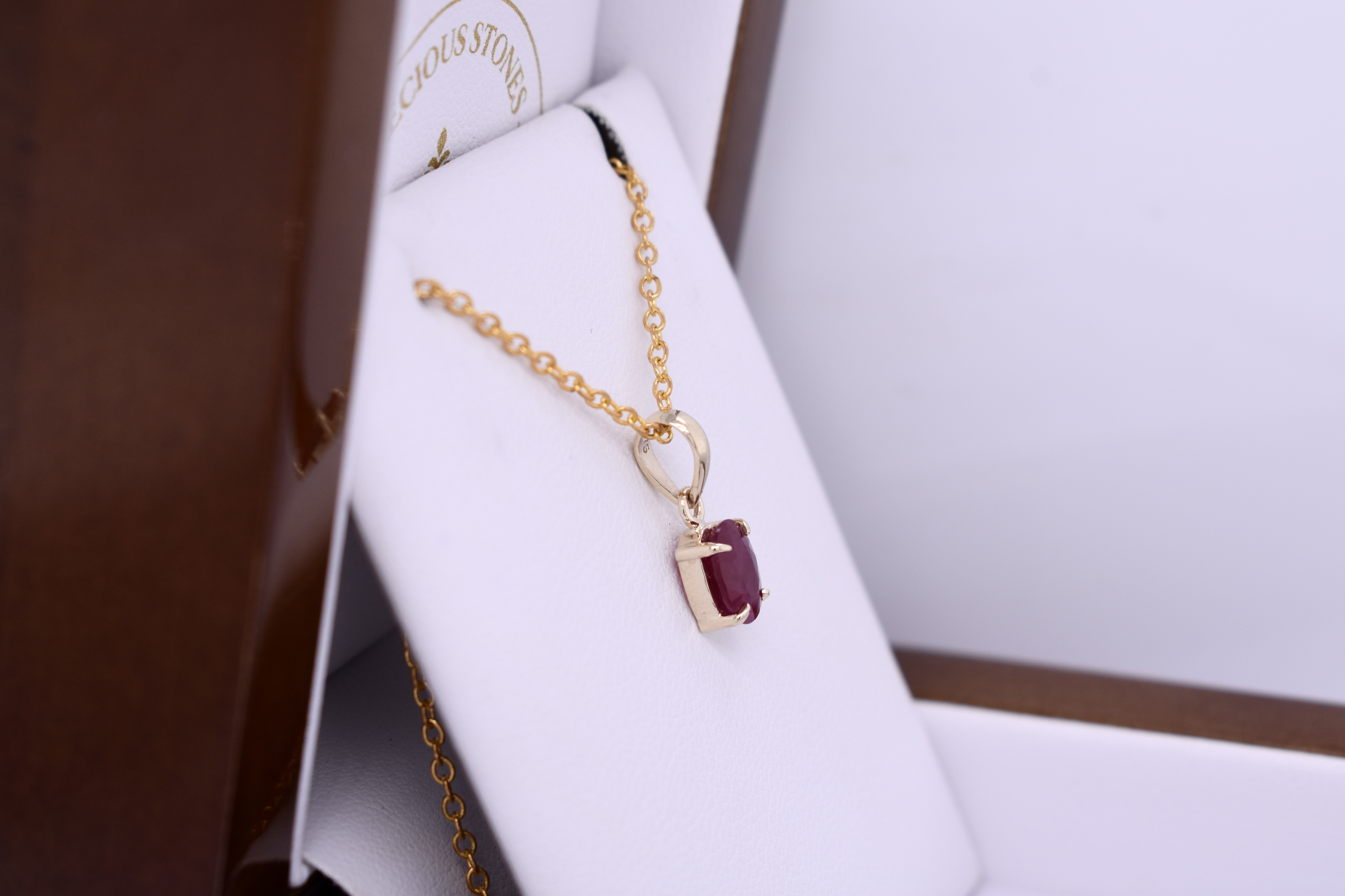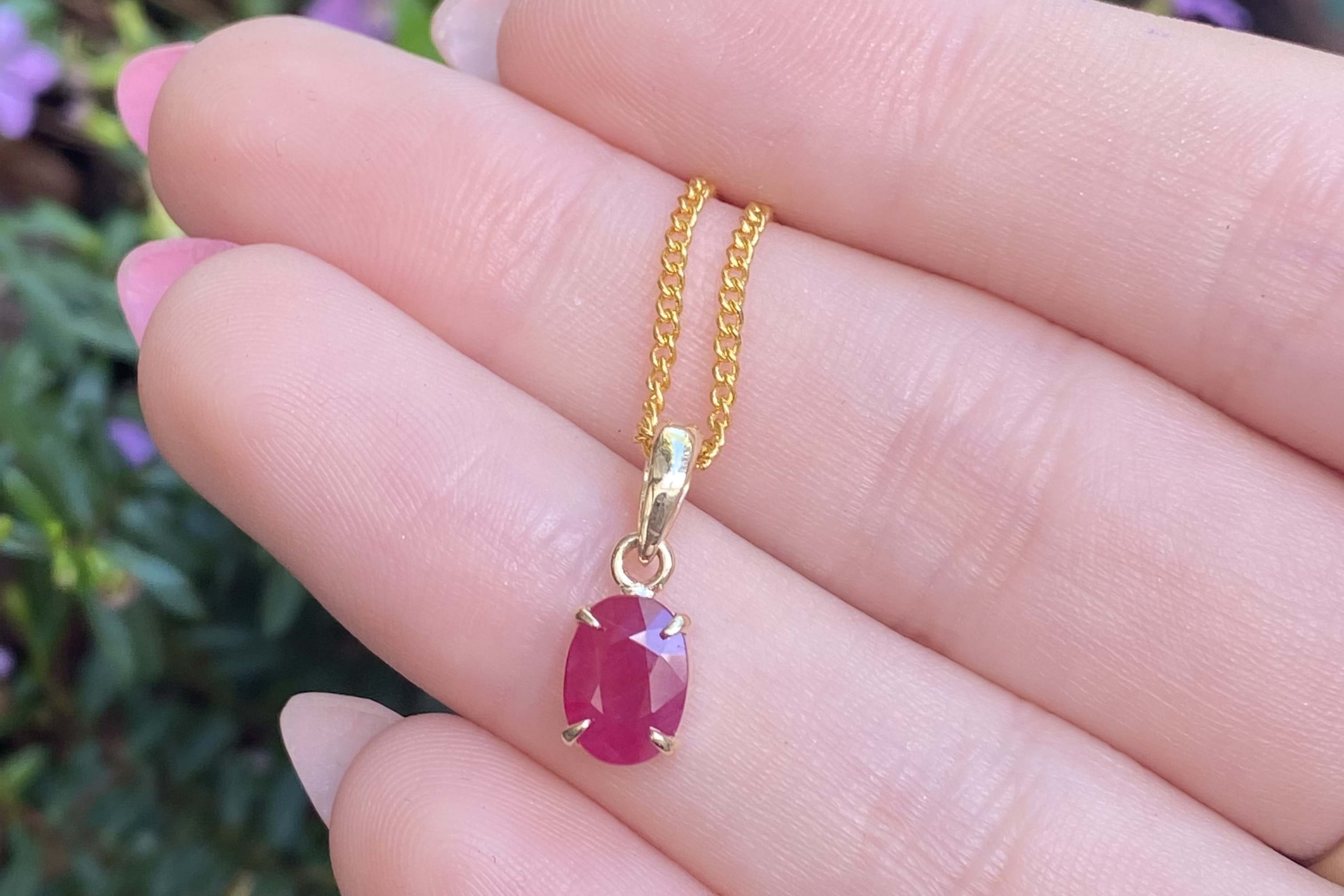 This simple yet gorgeous pendant features an oval ruby measuring approx. 7.8x5mm, four claw set into a handmade 9ct yellow gold setting. Finished with a plain bale. Chains are available for separate purchase.