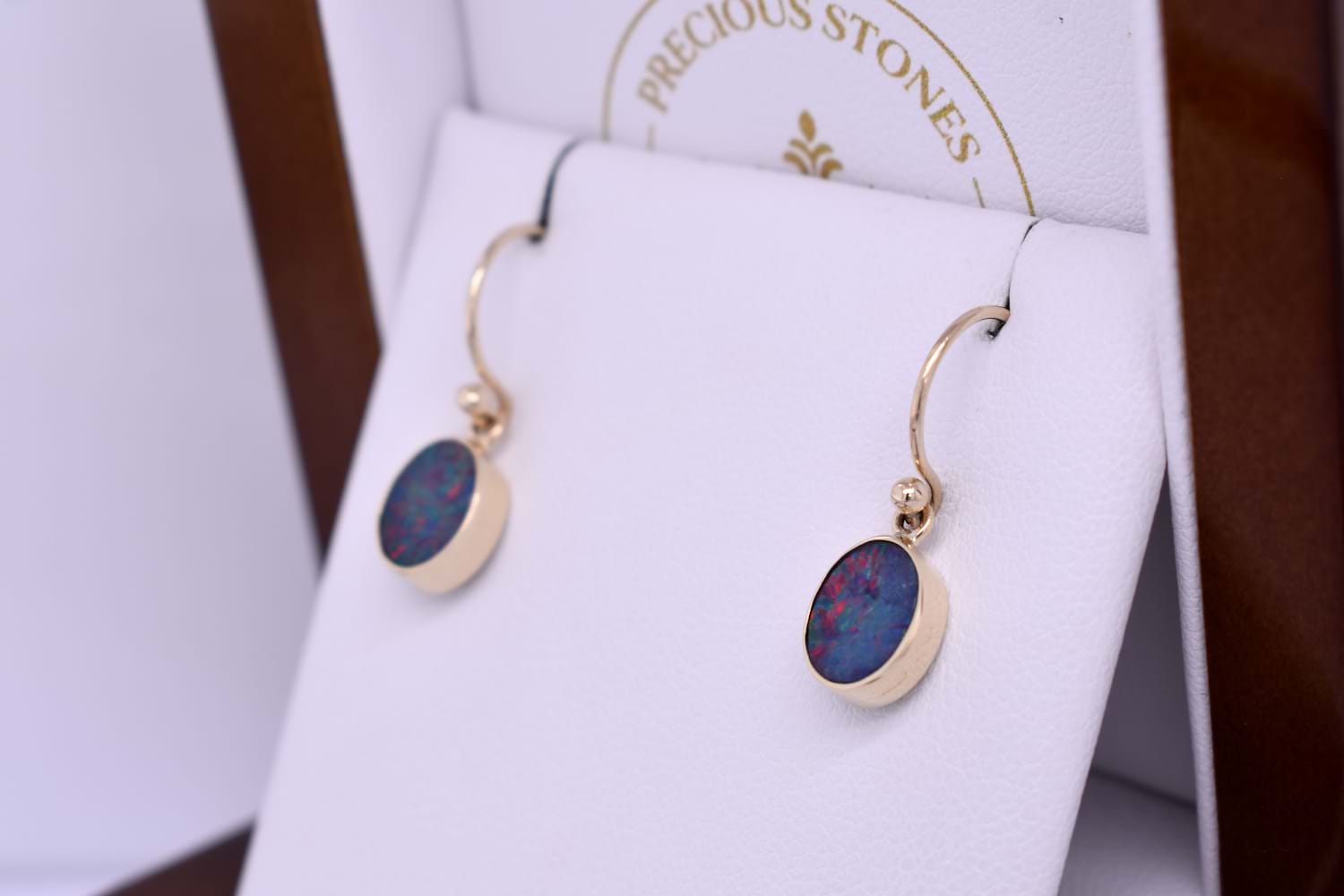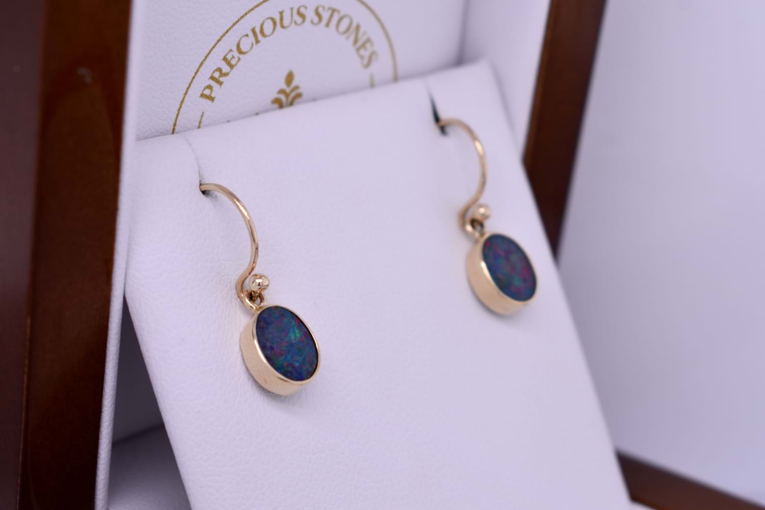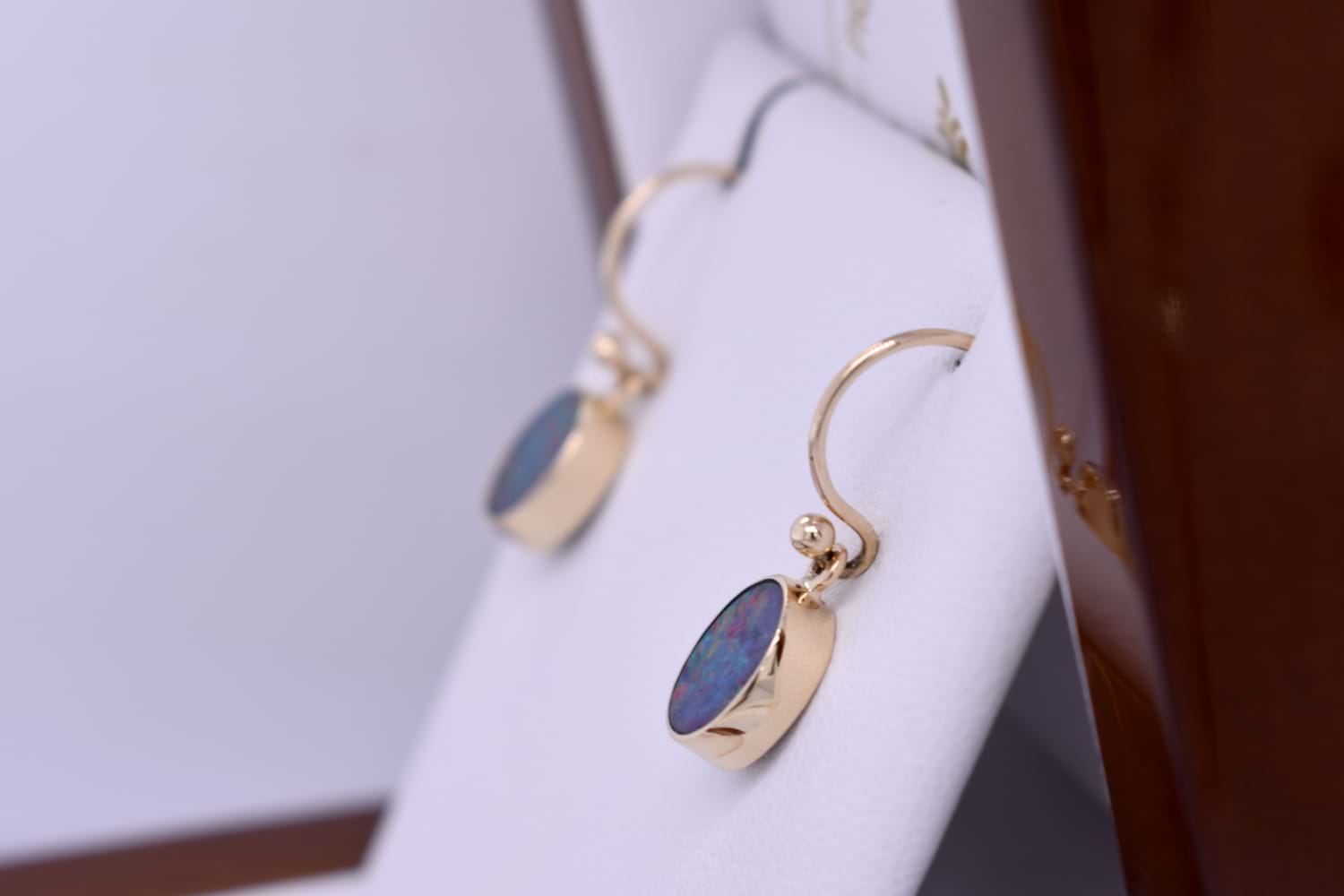 Gorgeous oval Coober Pedy opals measuring approx. 8.8x7mm, bezel set into a handmade 9ct yellow gold setting. The opal is a doublet, with a boulder opal backing and has flashes of green and red throughout. Finished with shepherd hook fittings.