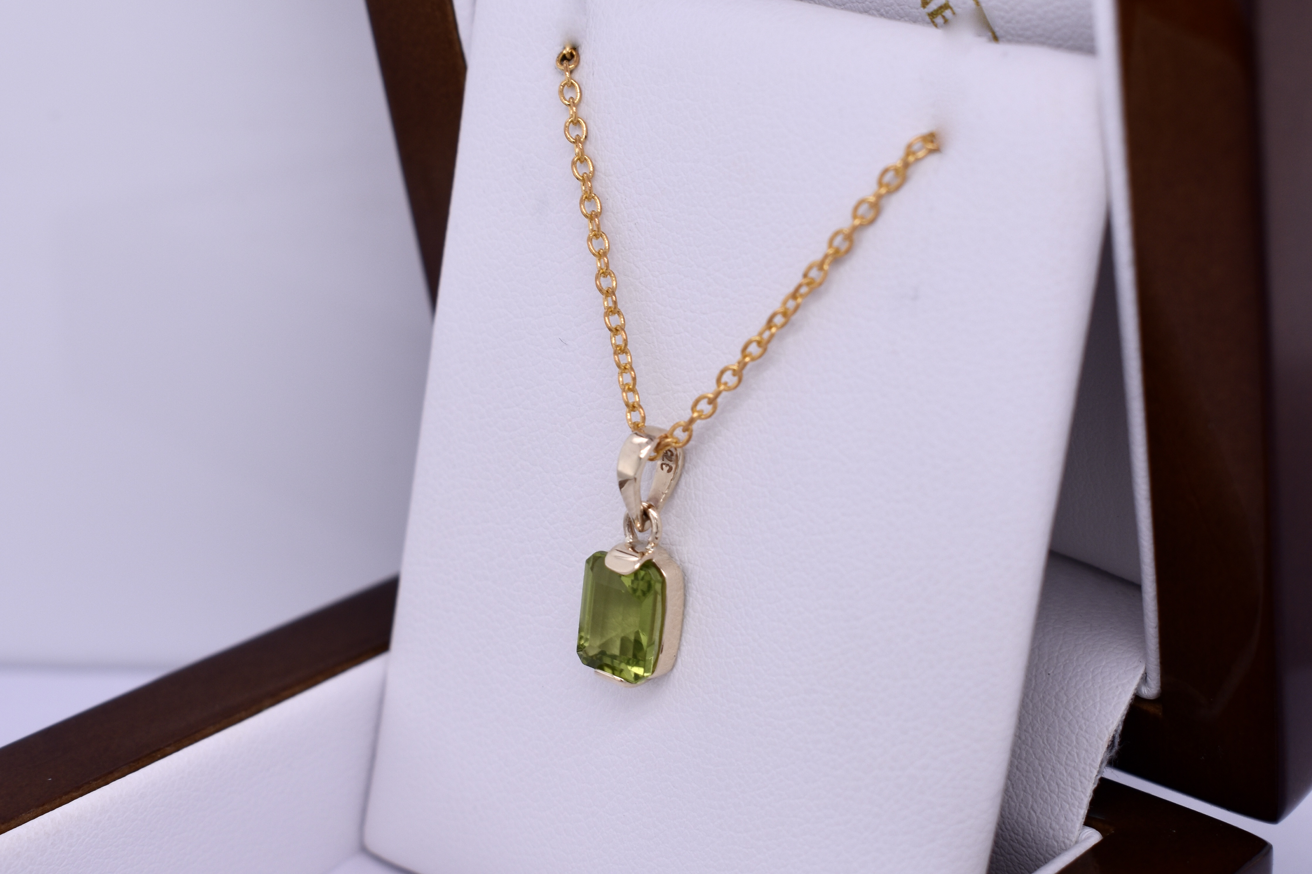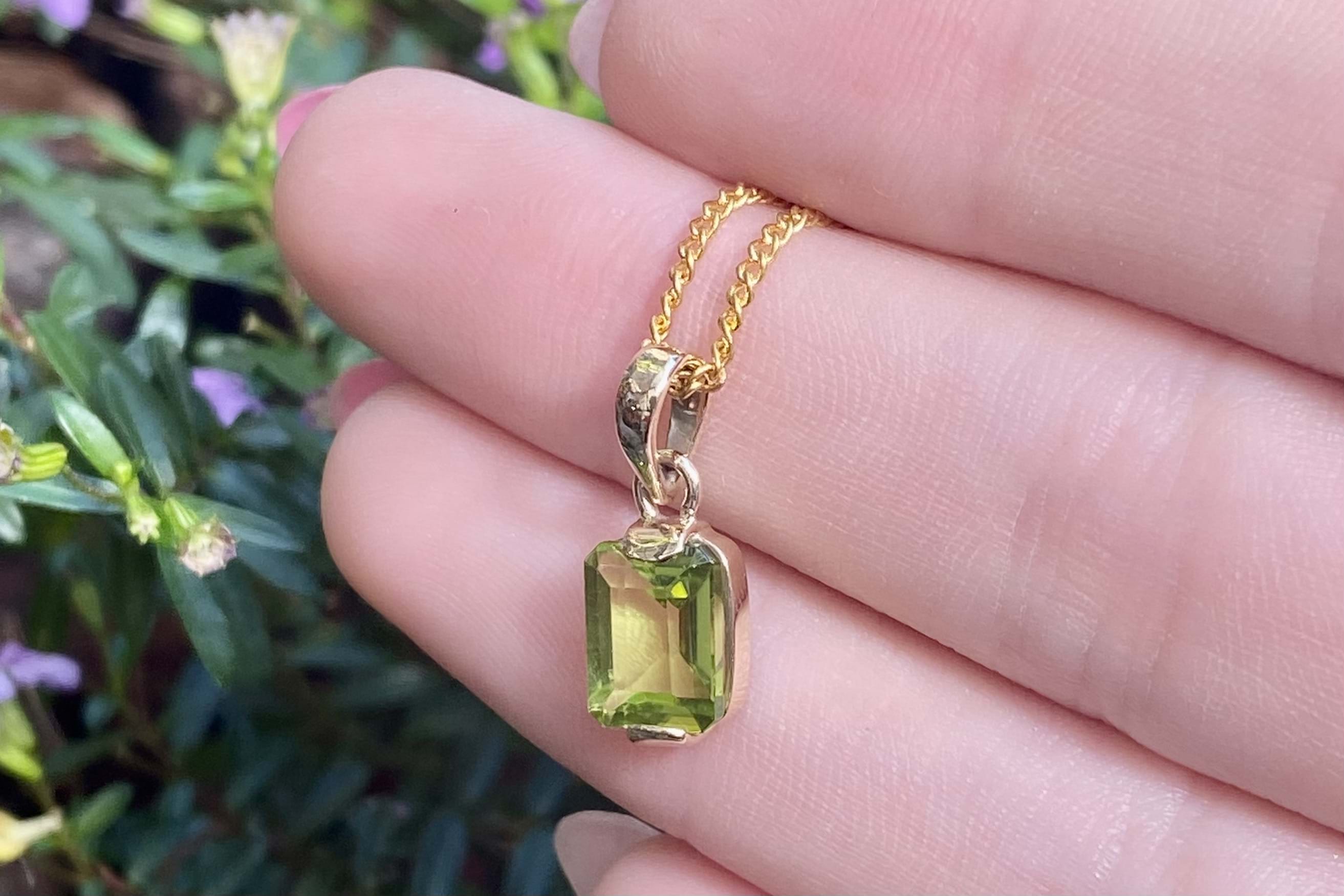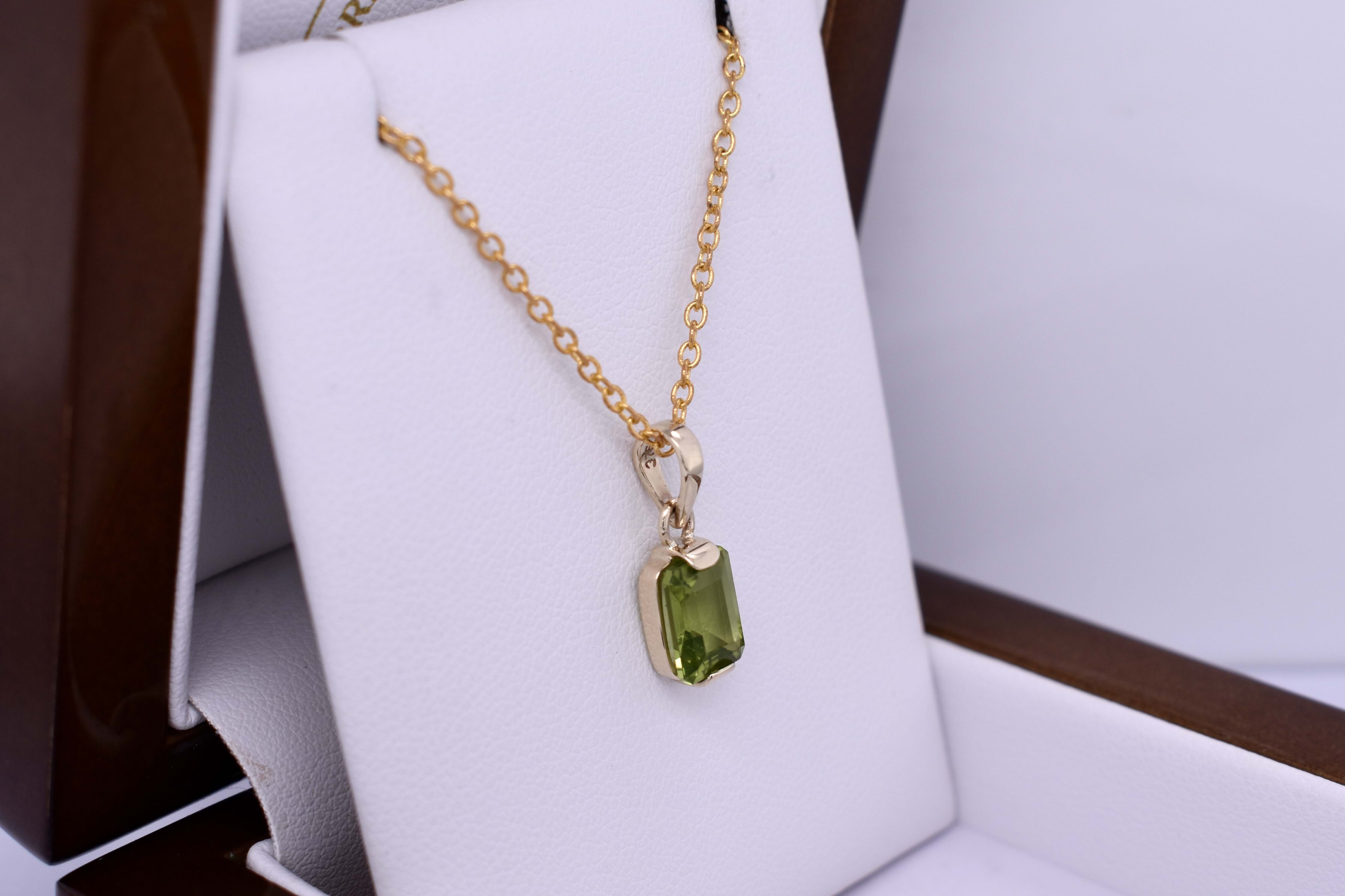 This gorgeous pendant features an emerald cut peridot measuring approx. 9.75x6.55mm, semi-bezel set into a handmade 9ct yellow gold setting. Finished with a plain bale. Chains are available for separate purchase.