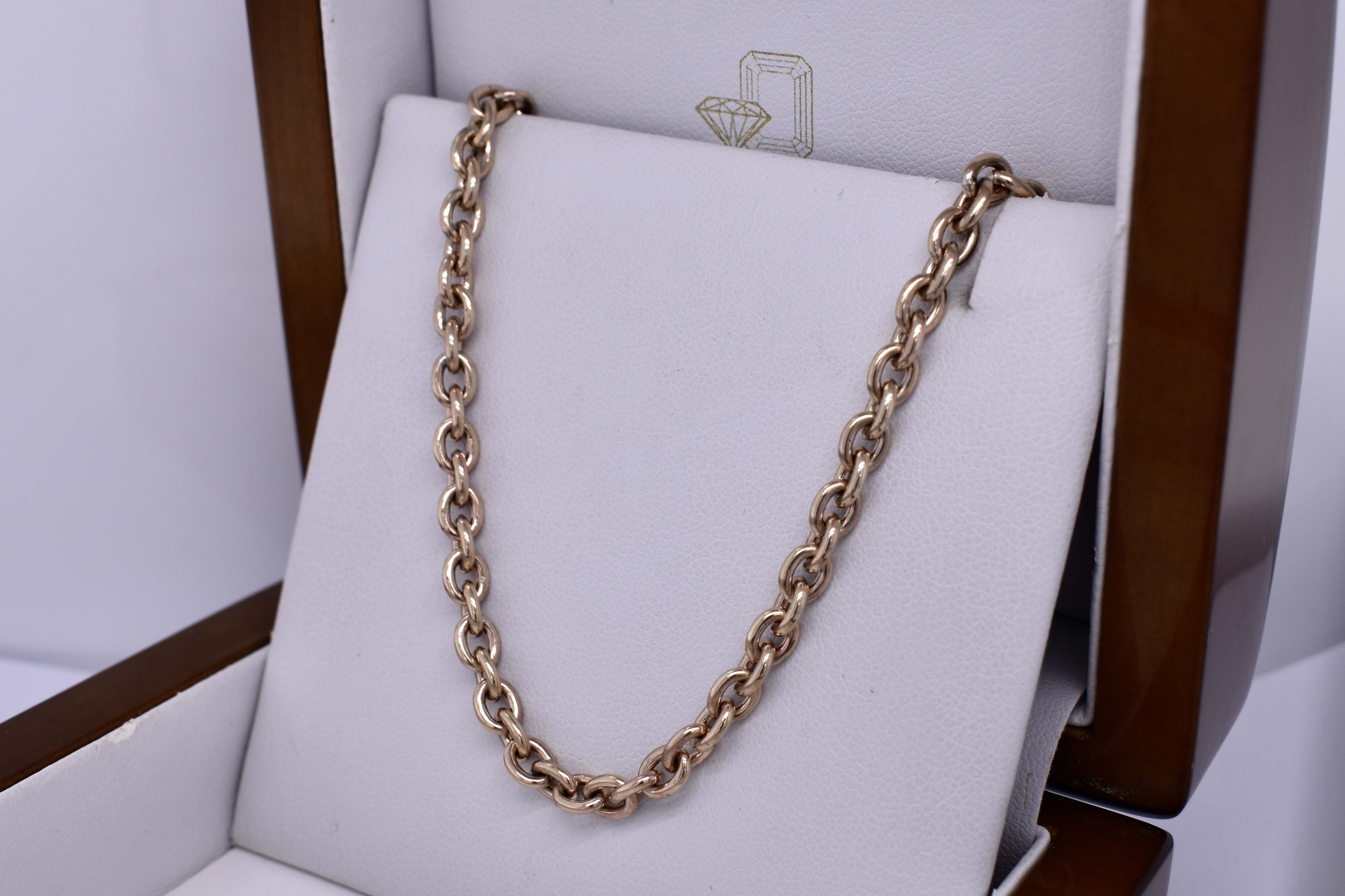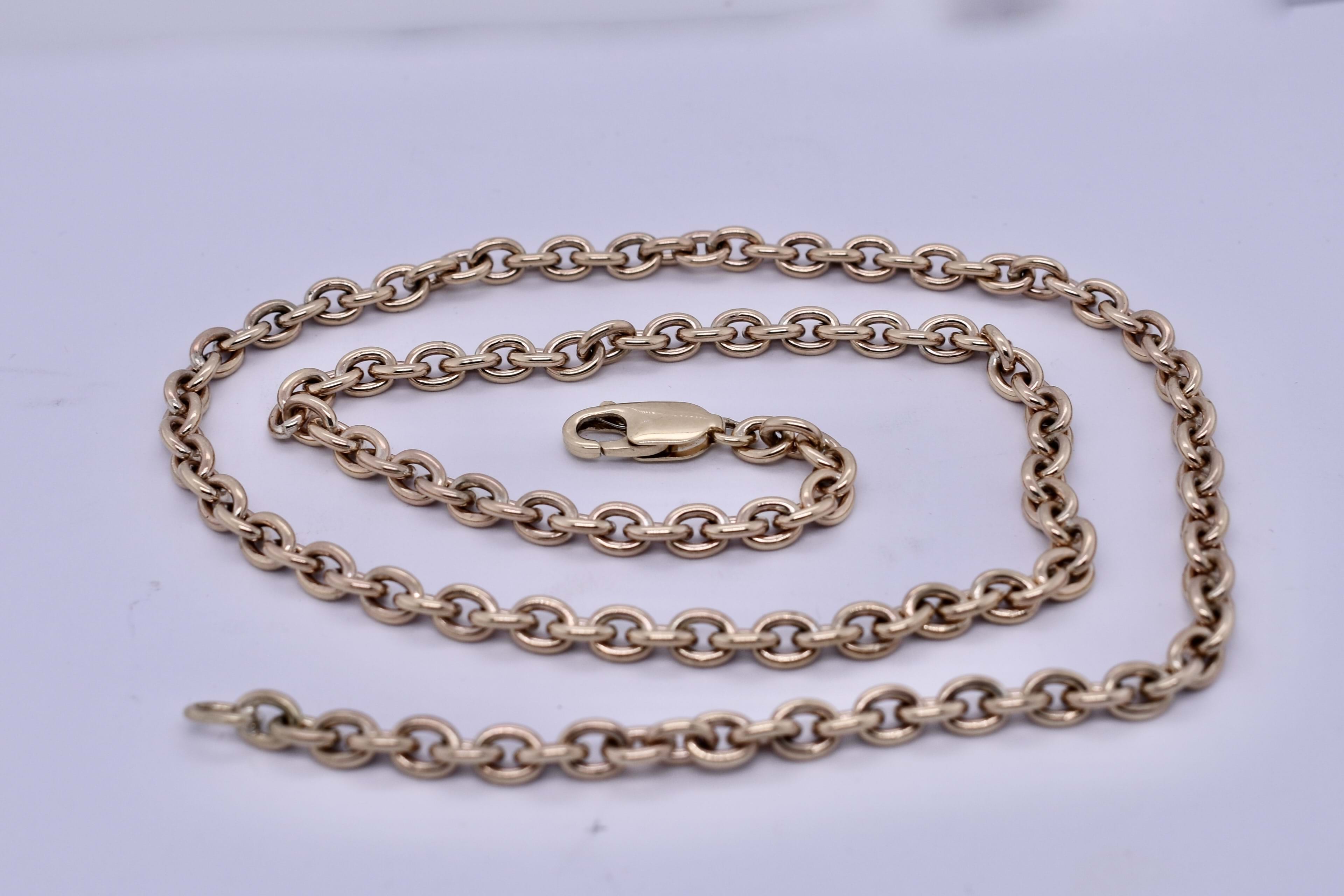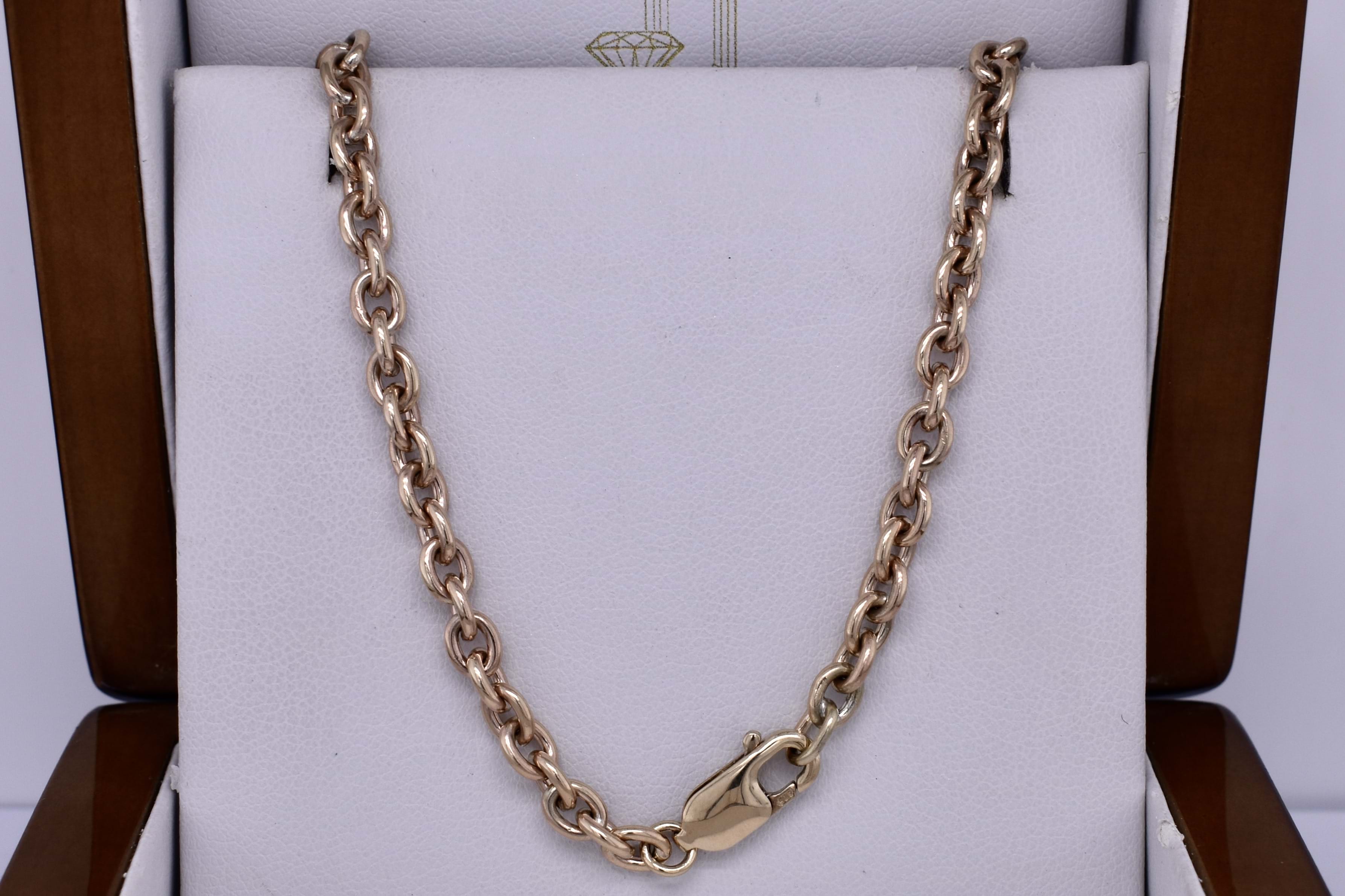 This beautiful chain was handmade by our goldsmith in 9ct yellow gold in this pretty BB cable link, measuring 1.1mm wide, this chain is made thicker to withstand wear. It has a parrot clasp and measures 48cm long and weighs 24.53grams. This chain is perfect to hang a pendant from or looks amazing alone.