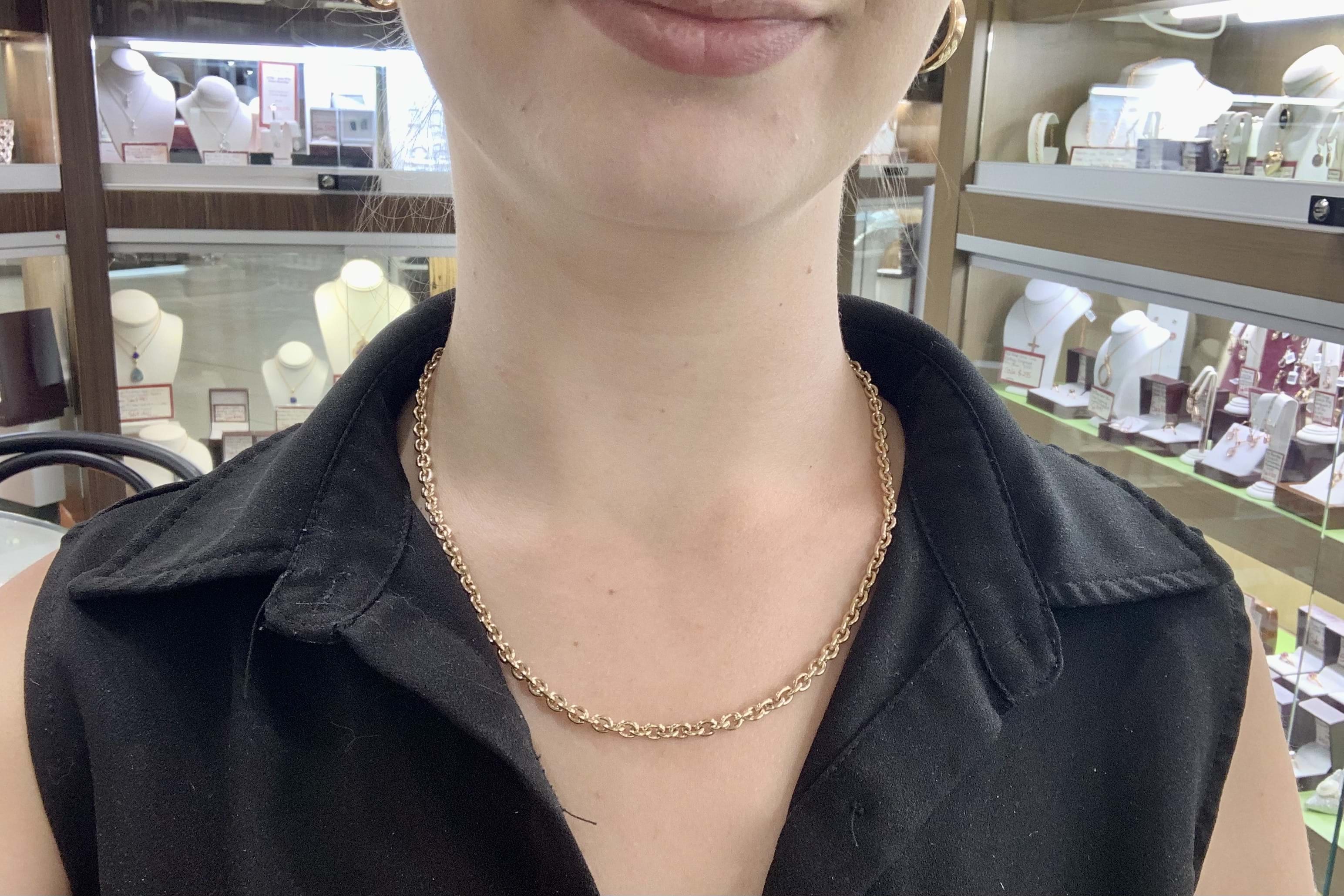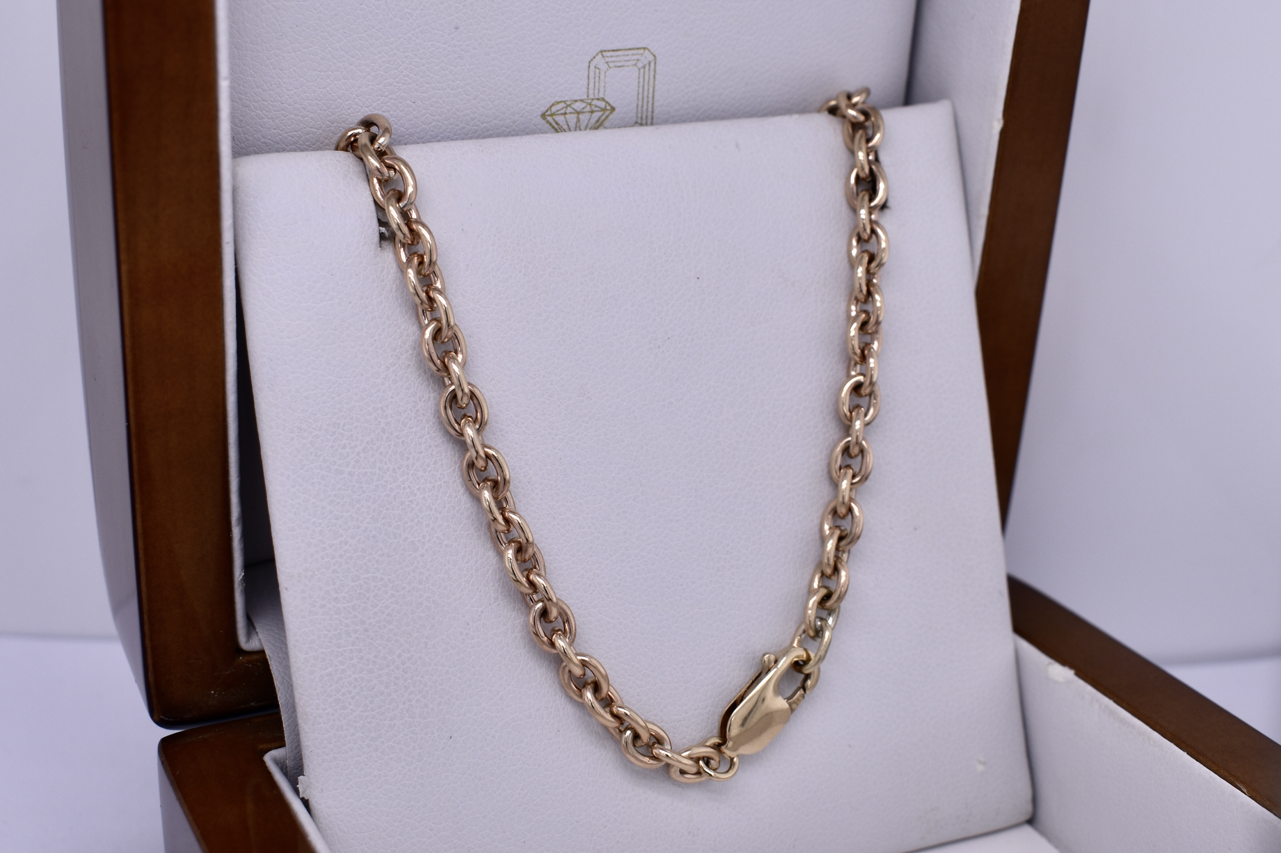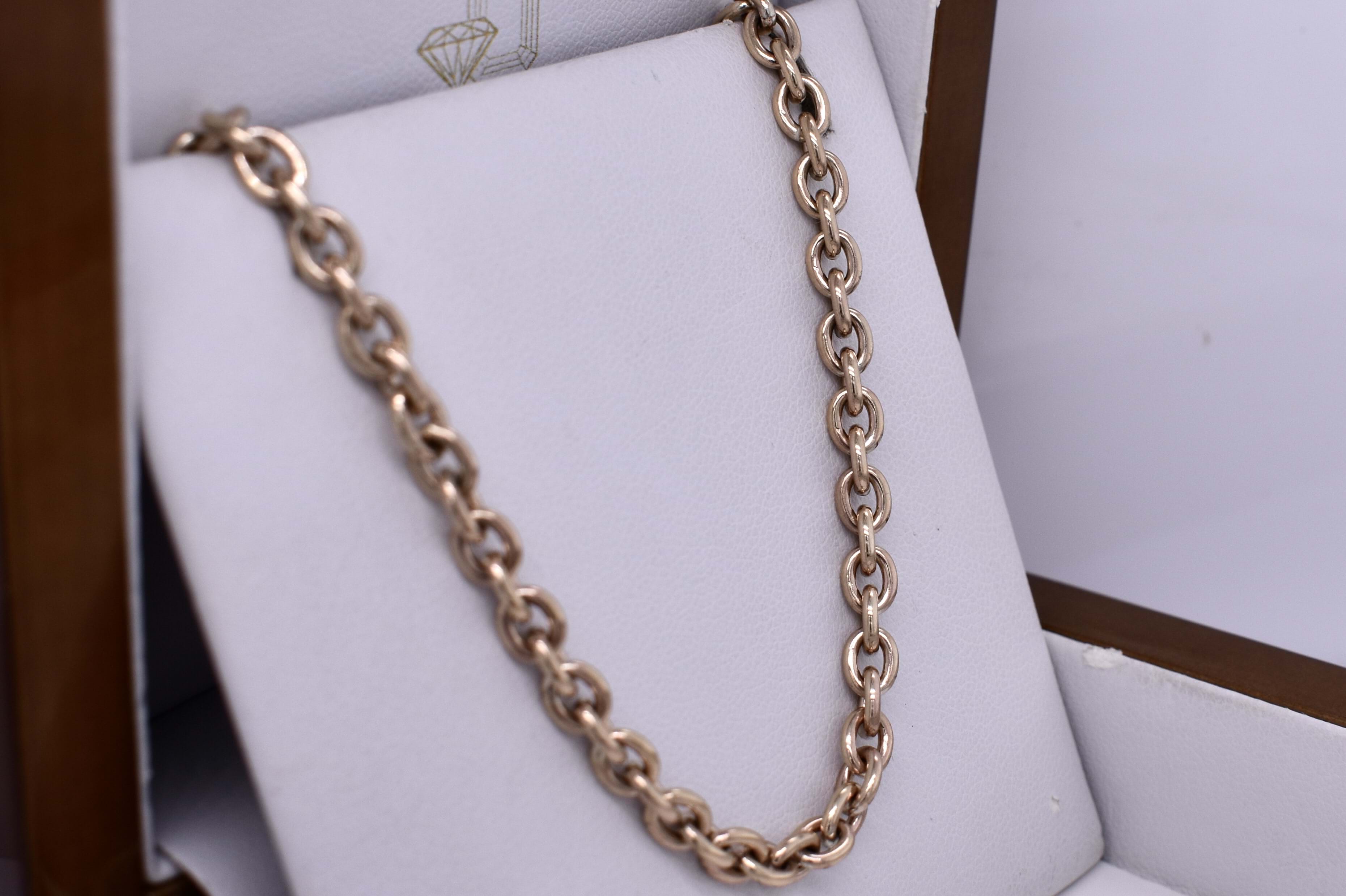 This beautiful chain was handmade by our goldsmith in 9ct yellow gold in this pretty BB cable link, measuring 1.1mm wide, this chain is made thicker to withstand wear. It has a parrot clasp and measures 48cm long and weighs 24.53grams. This chain is perfect to hang a pendant from or looks amazing alone.