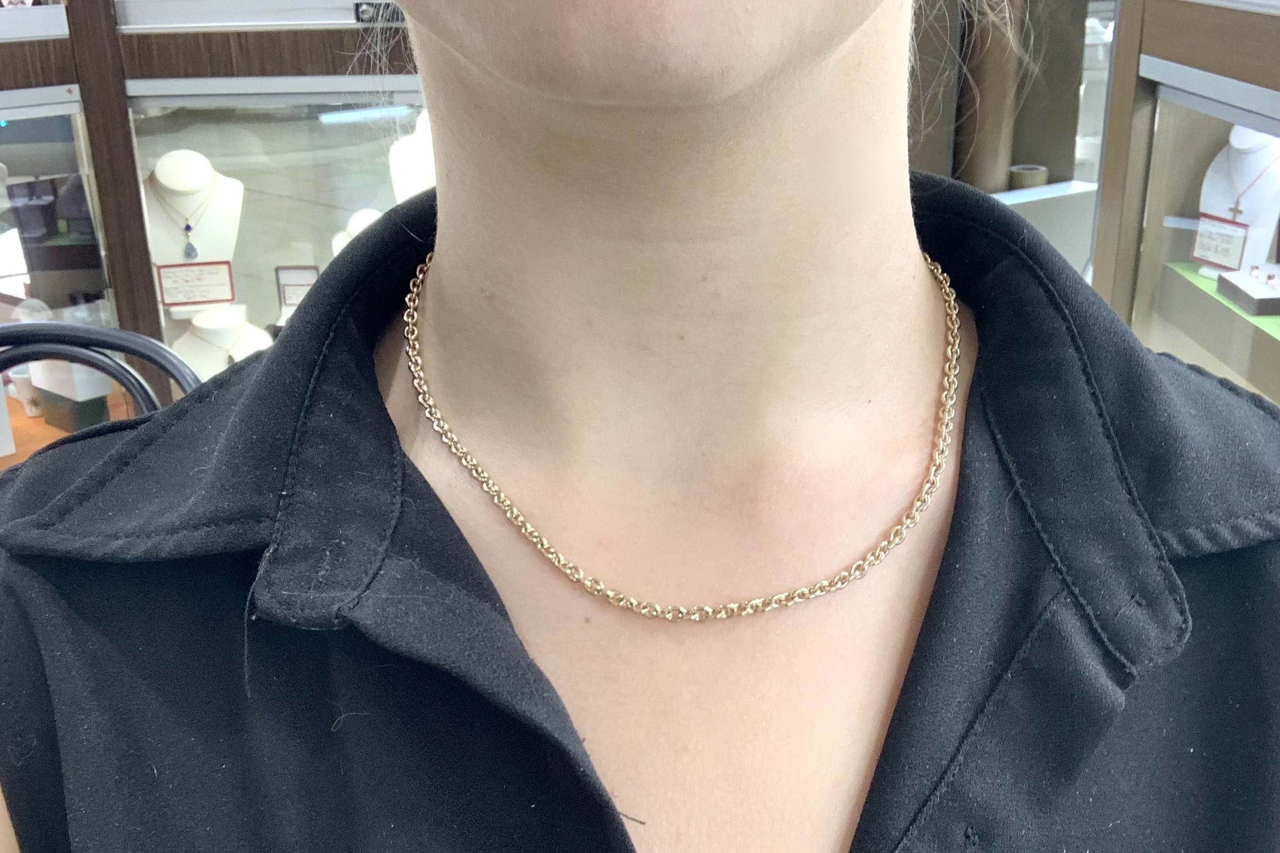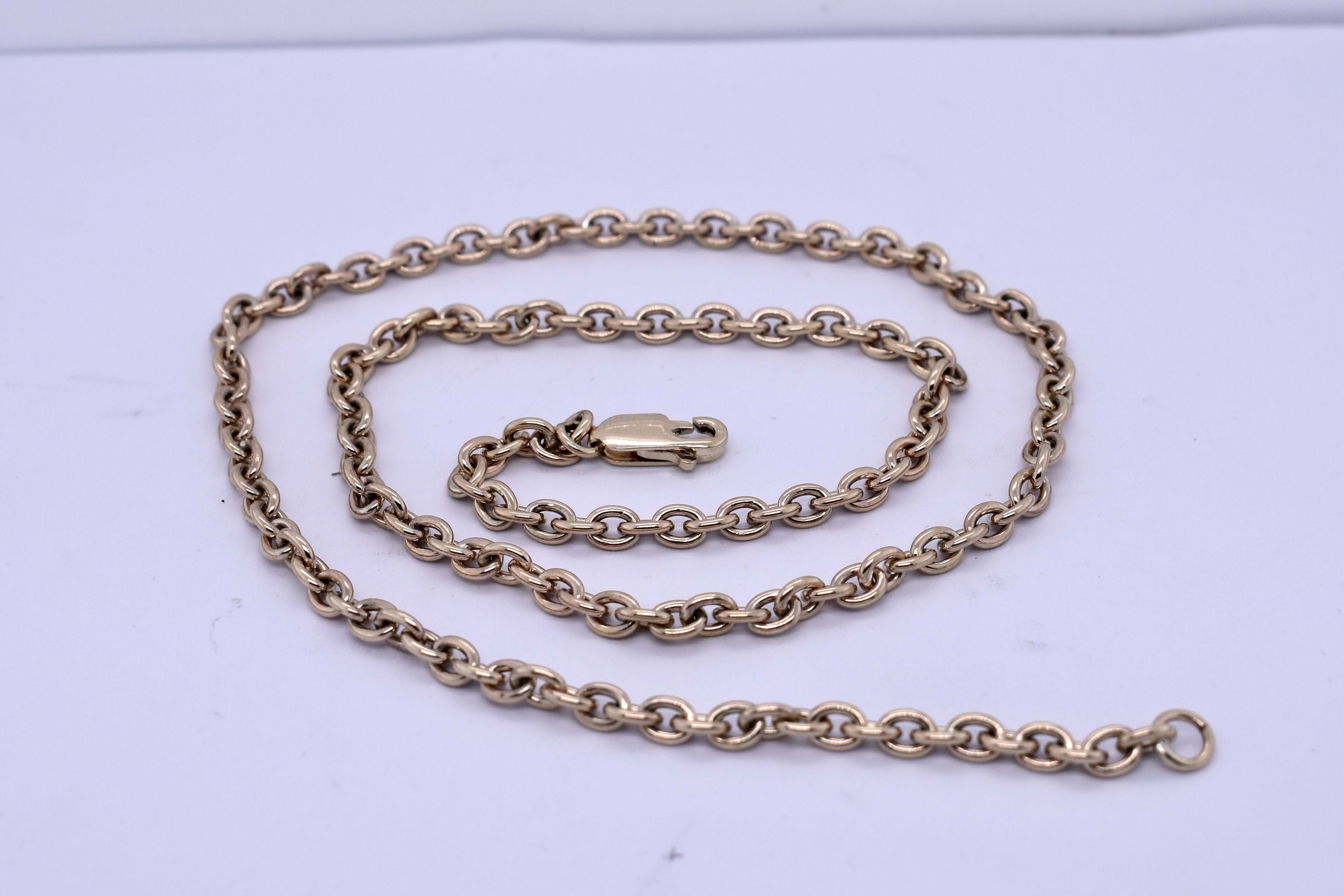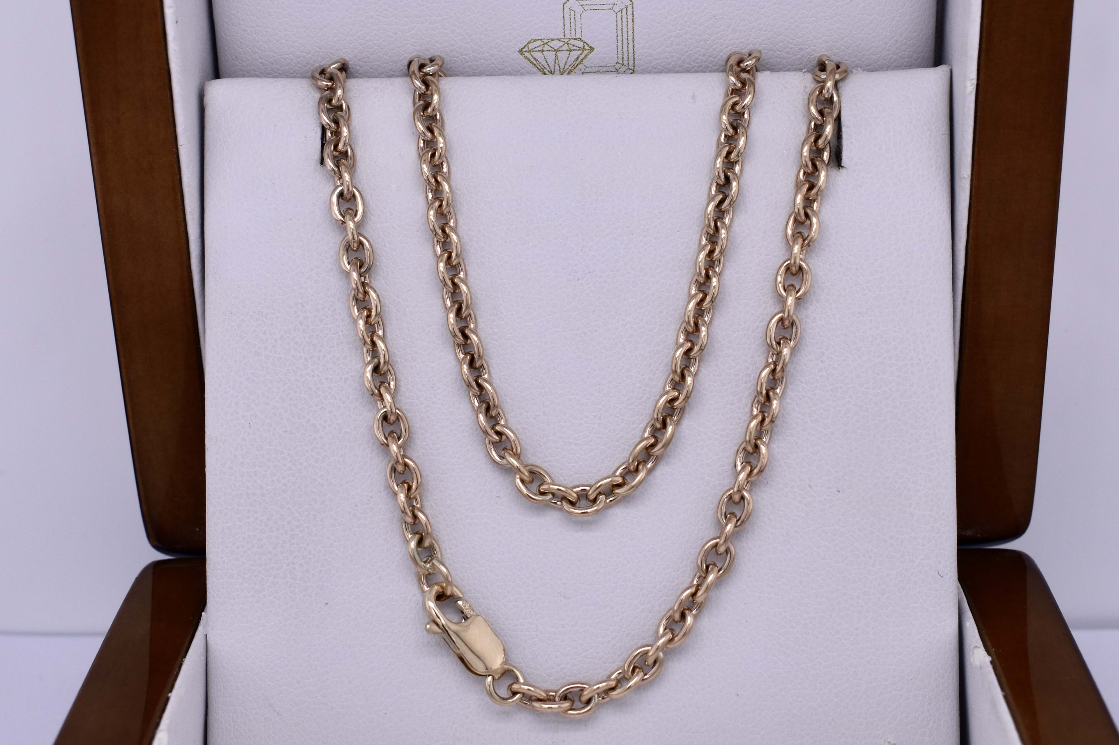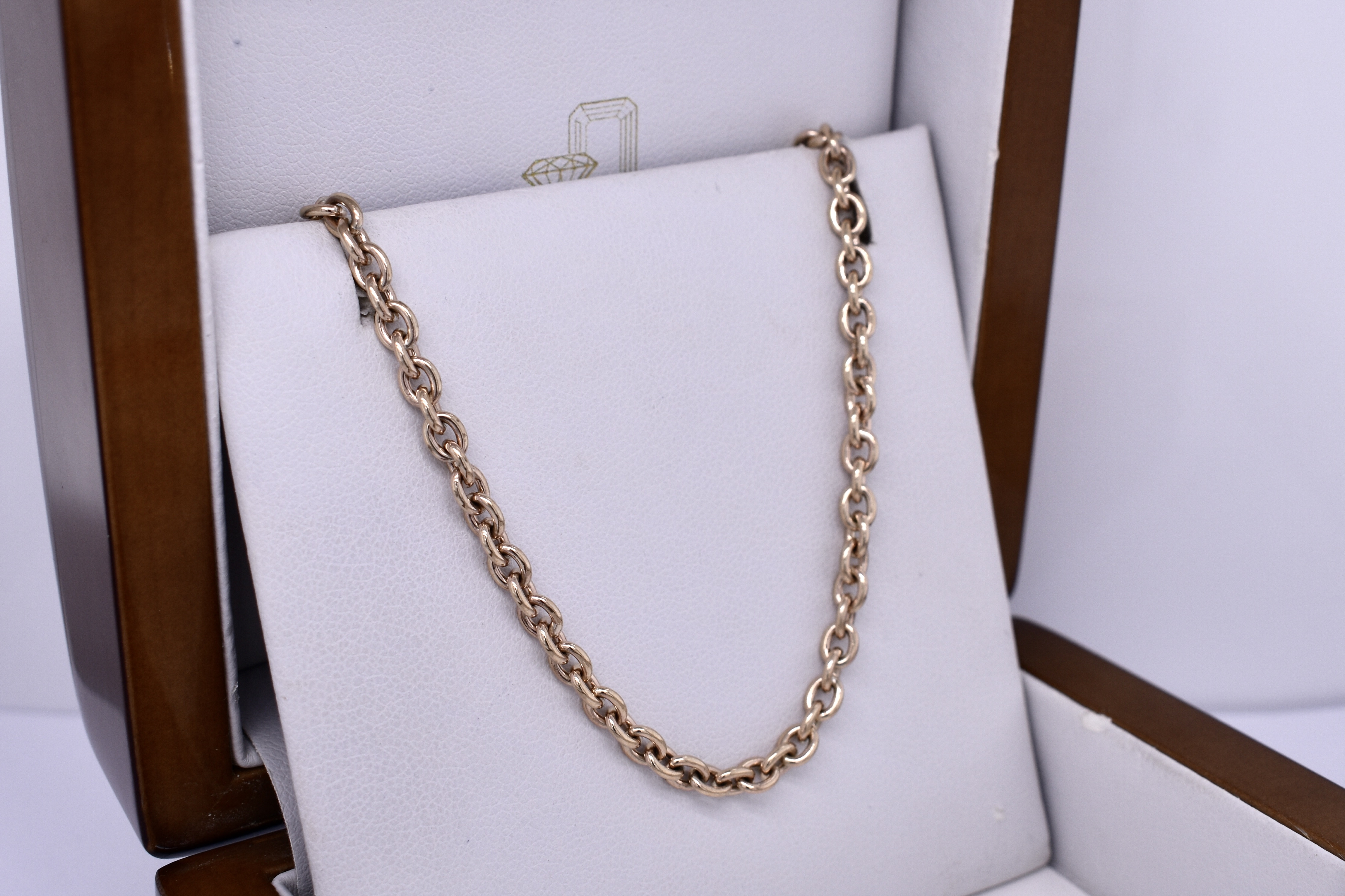 This beautiful chain was handmade by our goldsmith in 9ct yellow gold in a cable link, finished with a parrot clasp. It measures 44cm long and weighs 15.38grams. This chain is perfect to hang a pendant from or looks amazing alone.