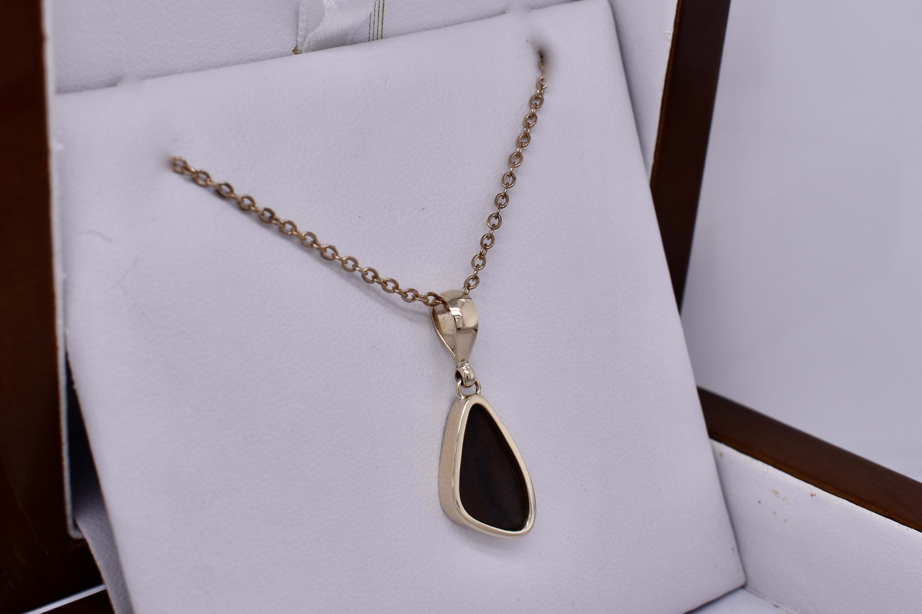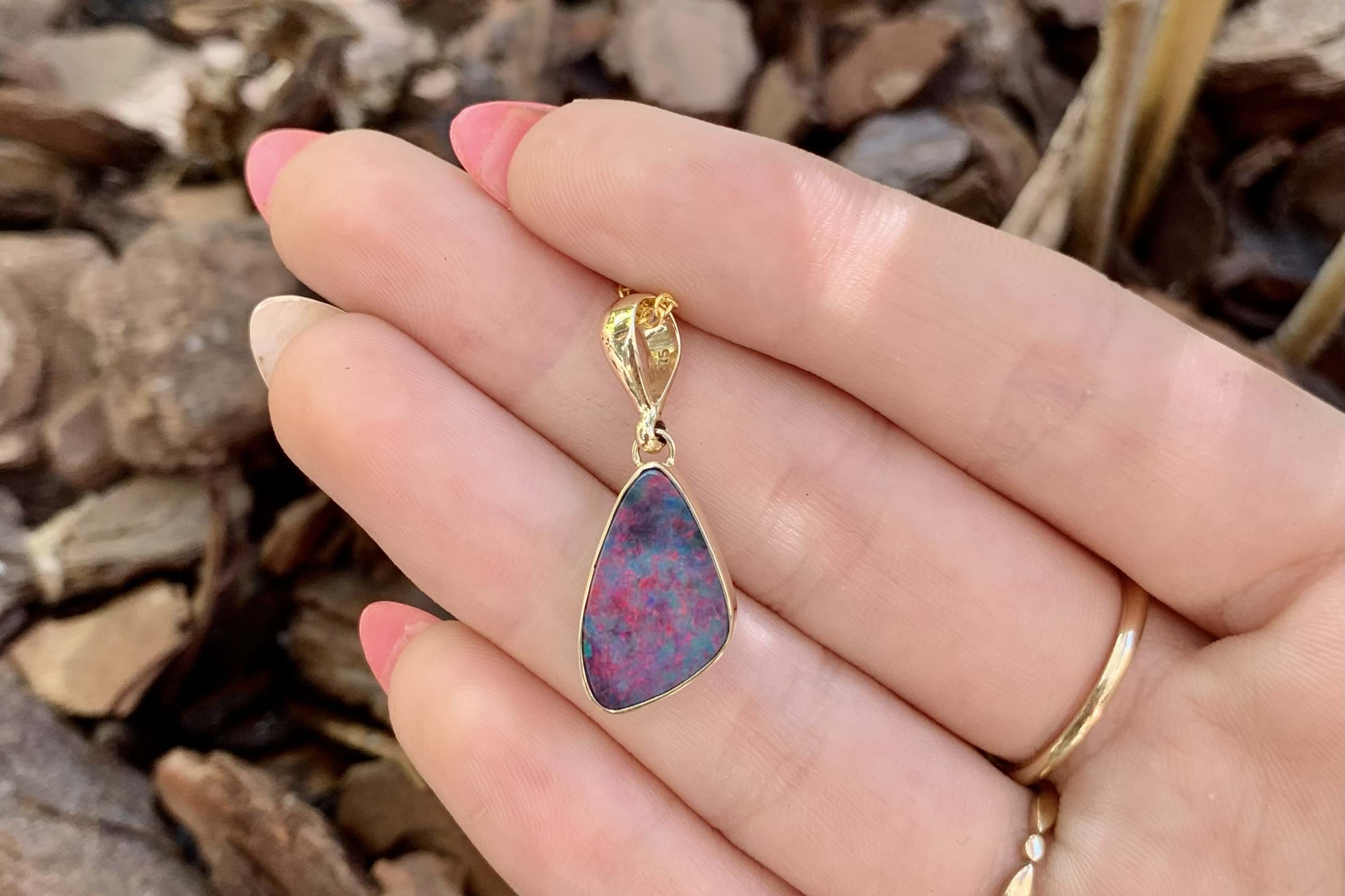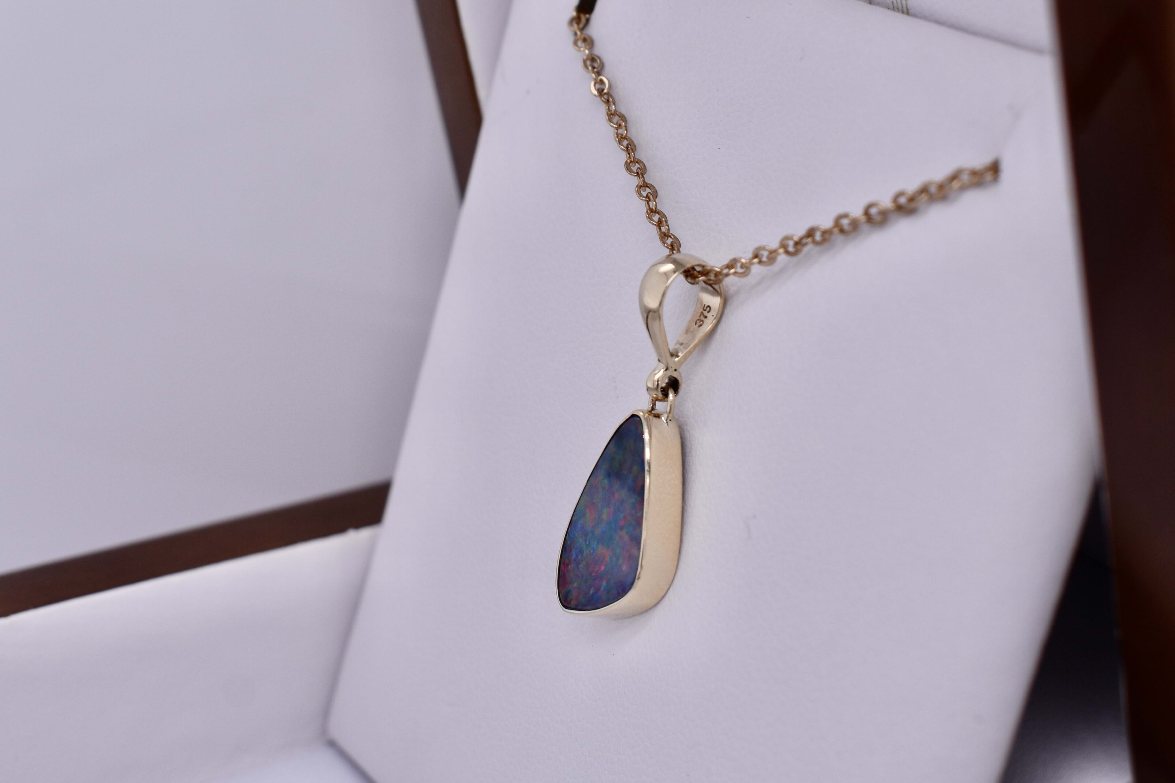 This beautiful freeform opal pendant, featuring a Coober Pedy opal doublet, measuring 17.8x10.6mm, with flashes of red, blue and pink throughout. The doublet consisting of Coober Pedy opal (on top) with a boulder opal backing. It is bezel set in 9ct yellow gold with a plain gold bale. Chains are available for separate purchase.