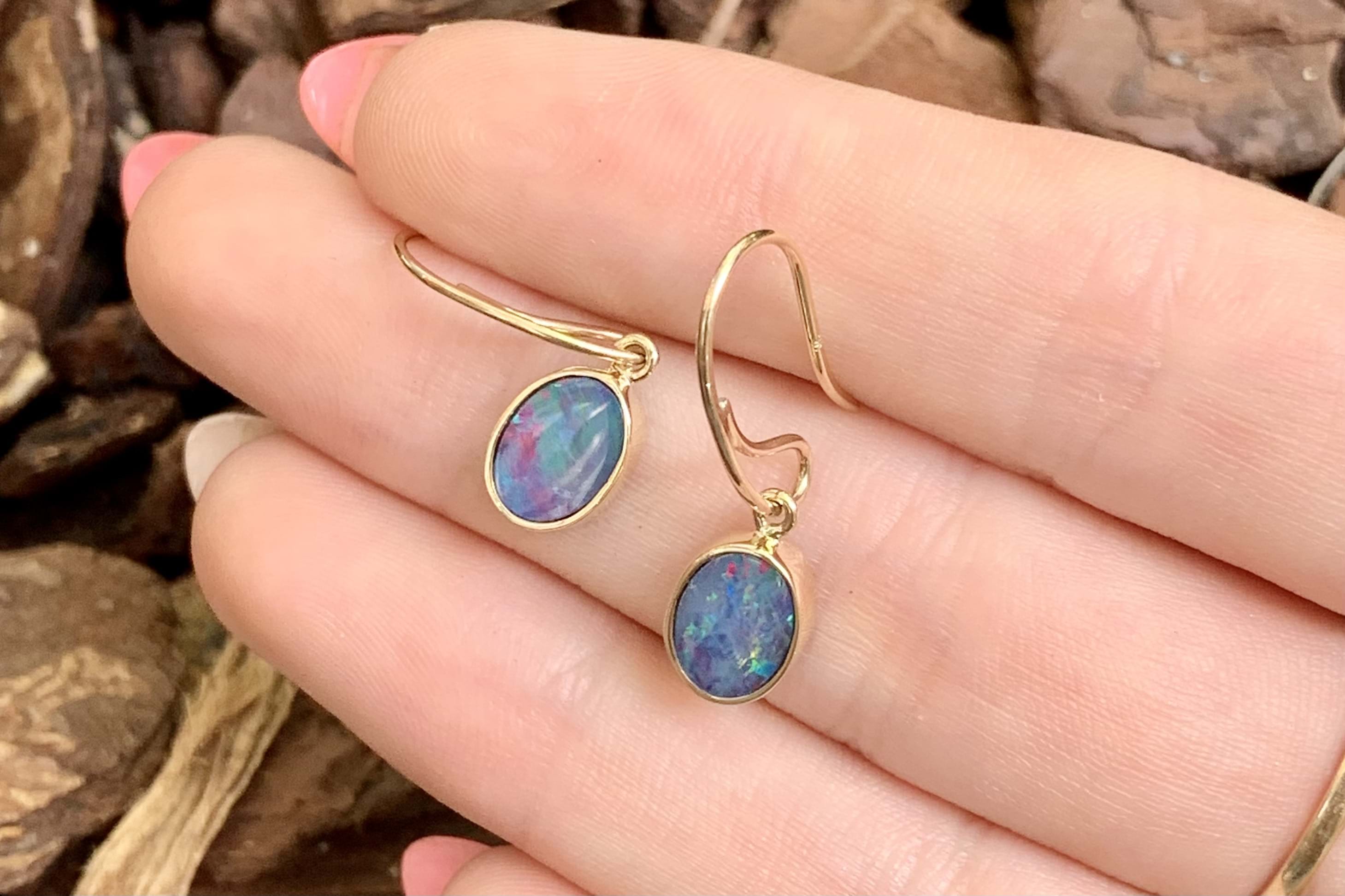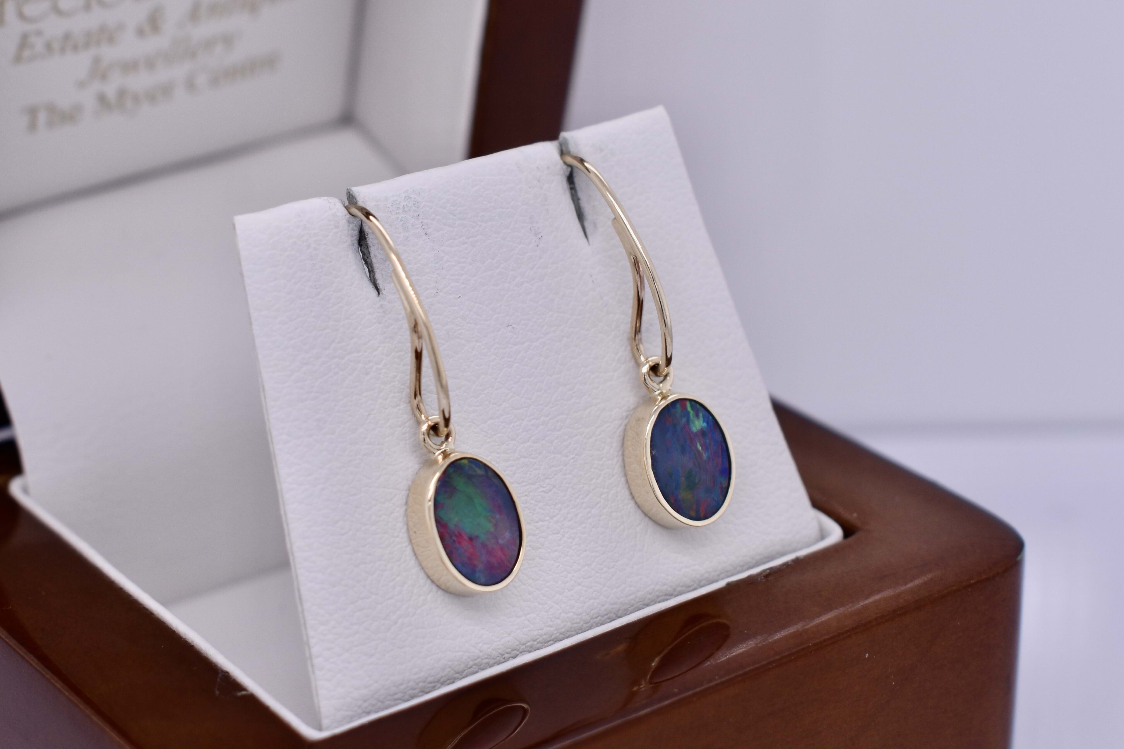 Beautiful pair of oval shaped drops, featuring approx. 7.9x6.9mm Coober Pedy opal doublets. The doublet consisting of Coober Pedy opal (on top) with a boulder opal backing. These opals are dark with pretty flashes of red and green throughout. They are bezel set in 9ct yellow gold with shepherd hook fittings.
