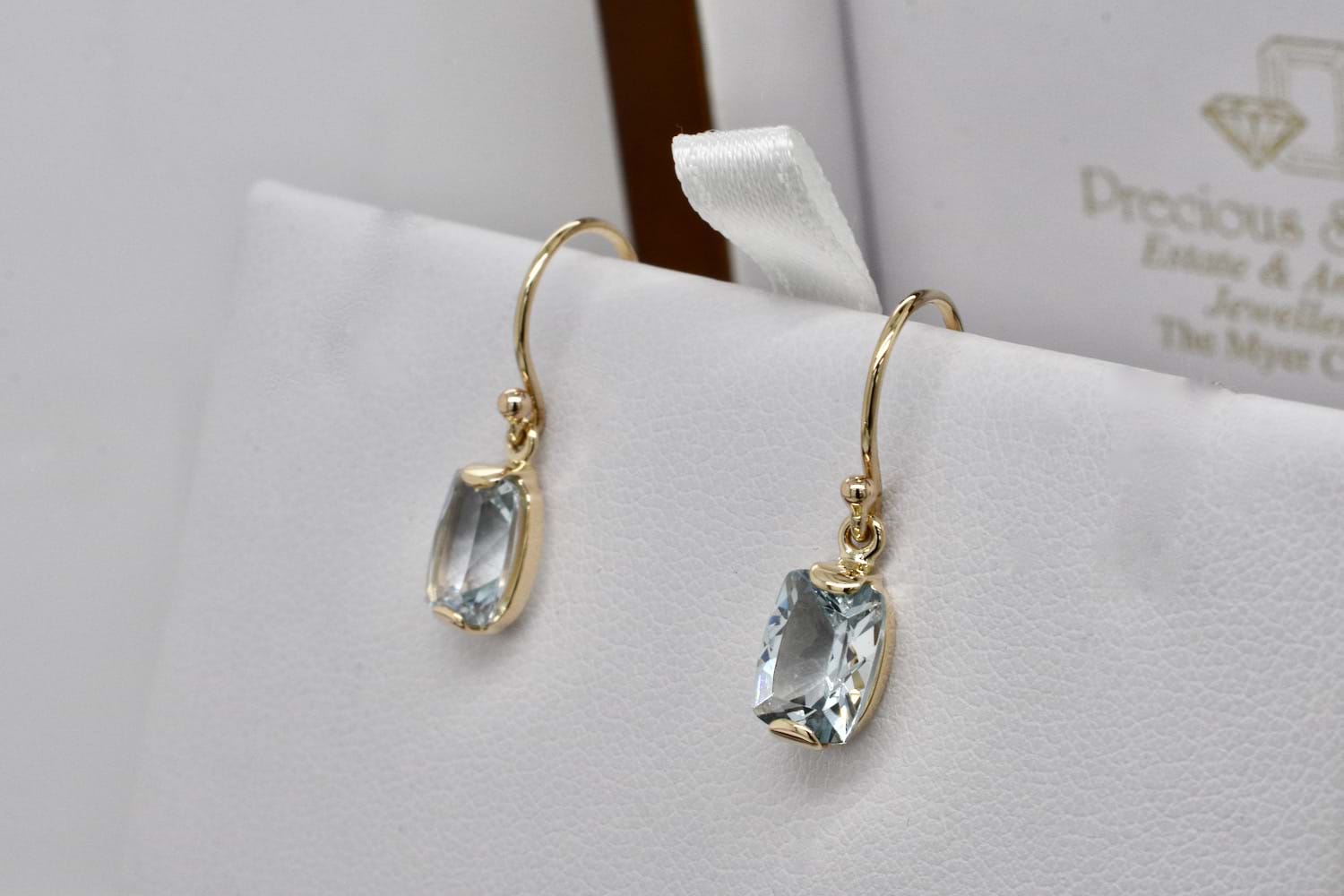 A lovely matching pair of cushion shape aquamarines measuring approx. 9.5x6mm set into handmade 9ct yellow gold semi-bezel settings suspended from shepherd hook fittings