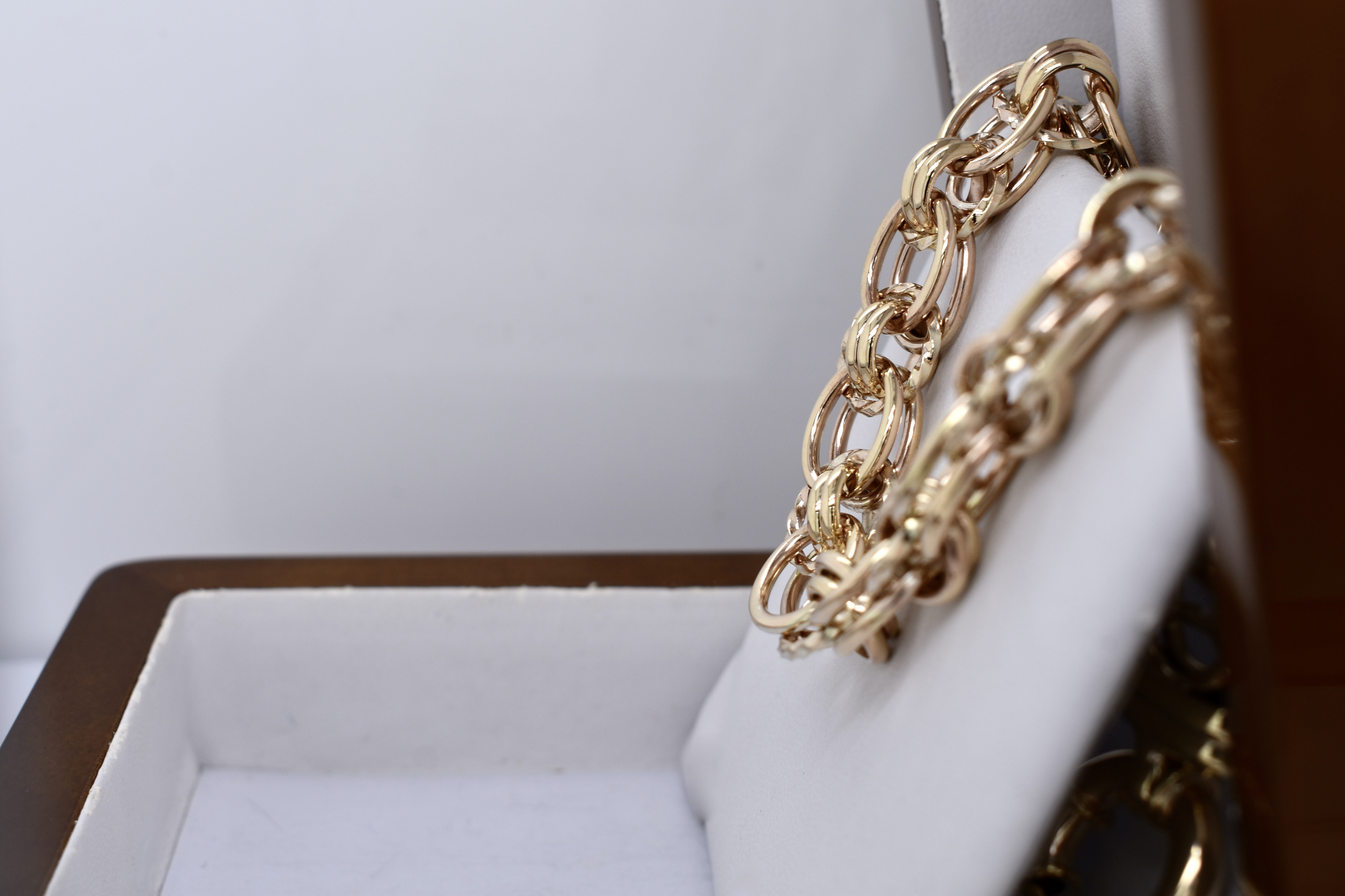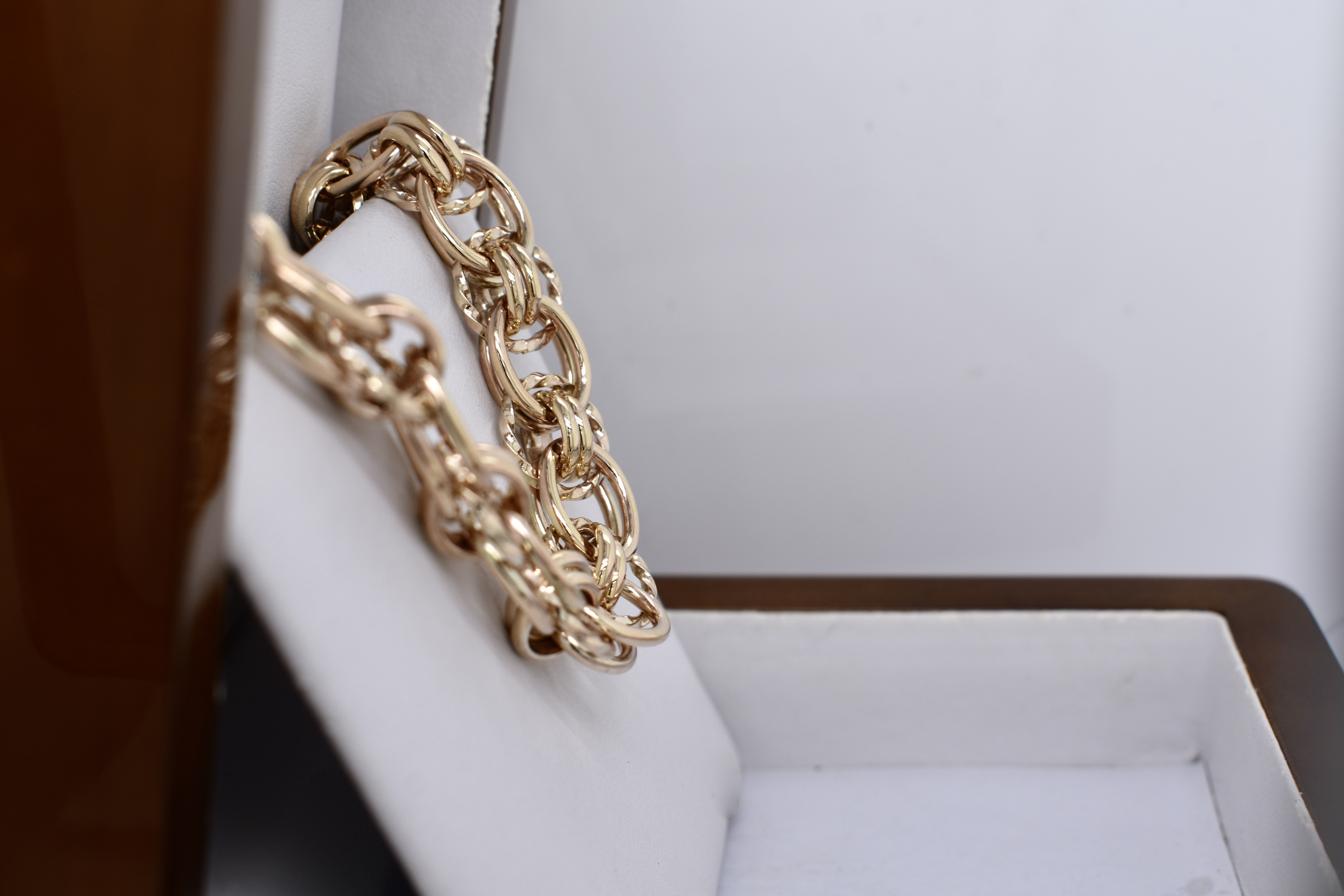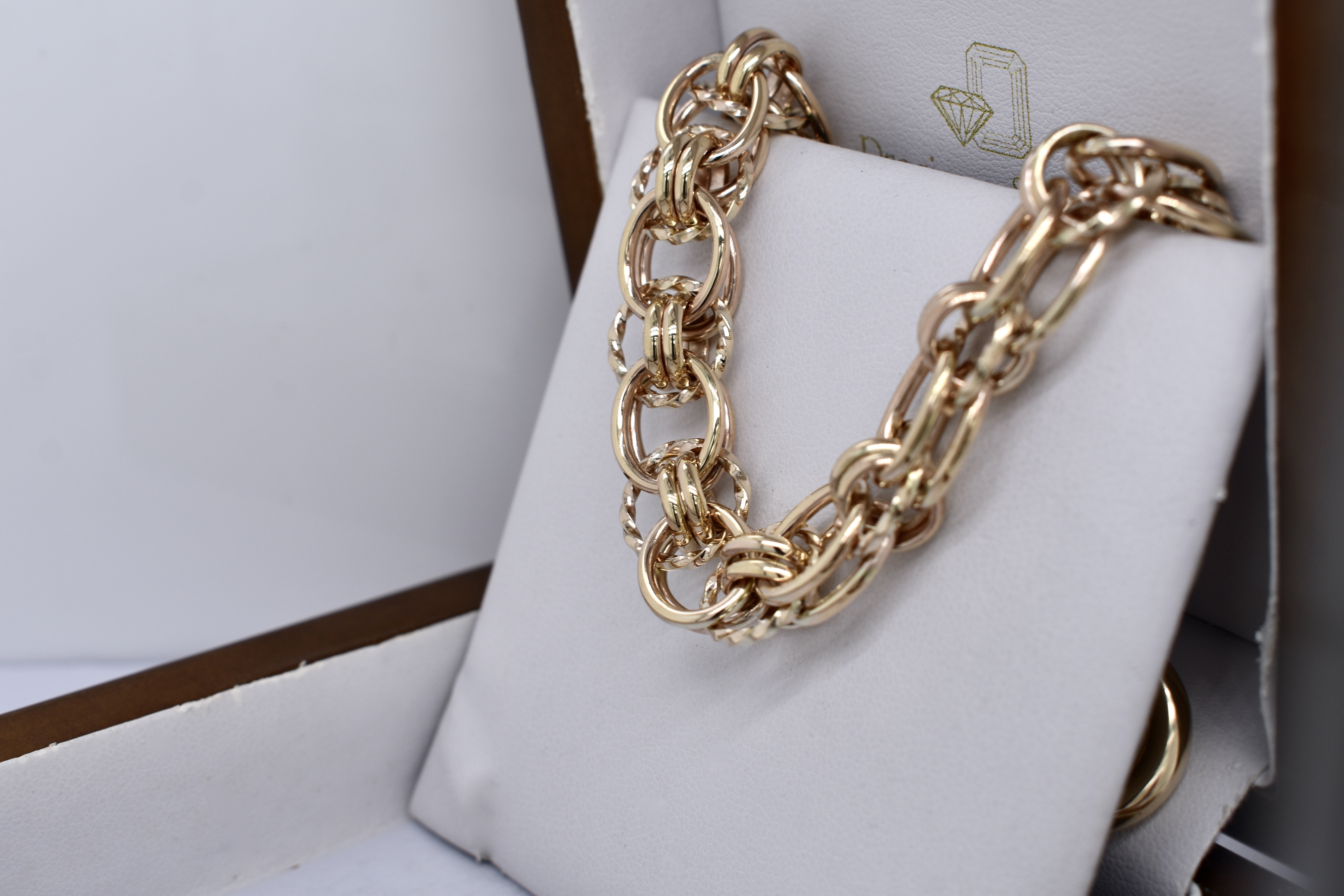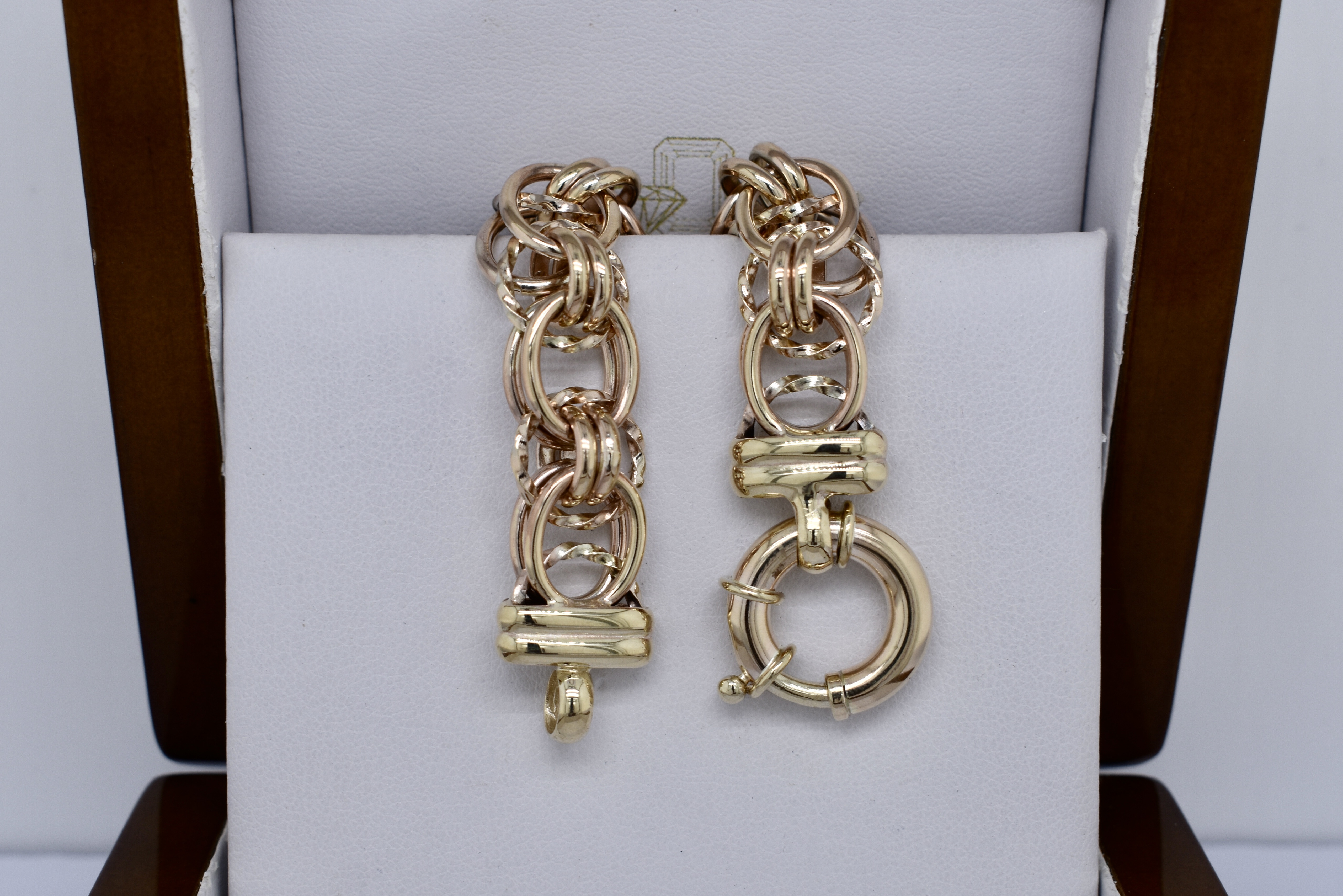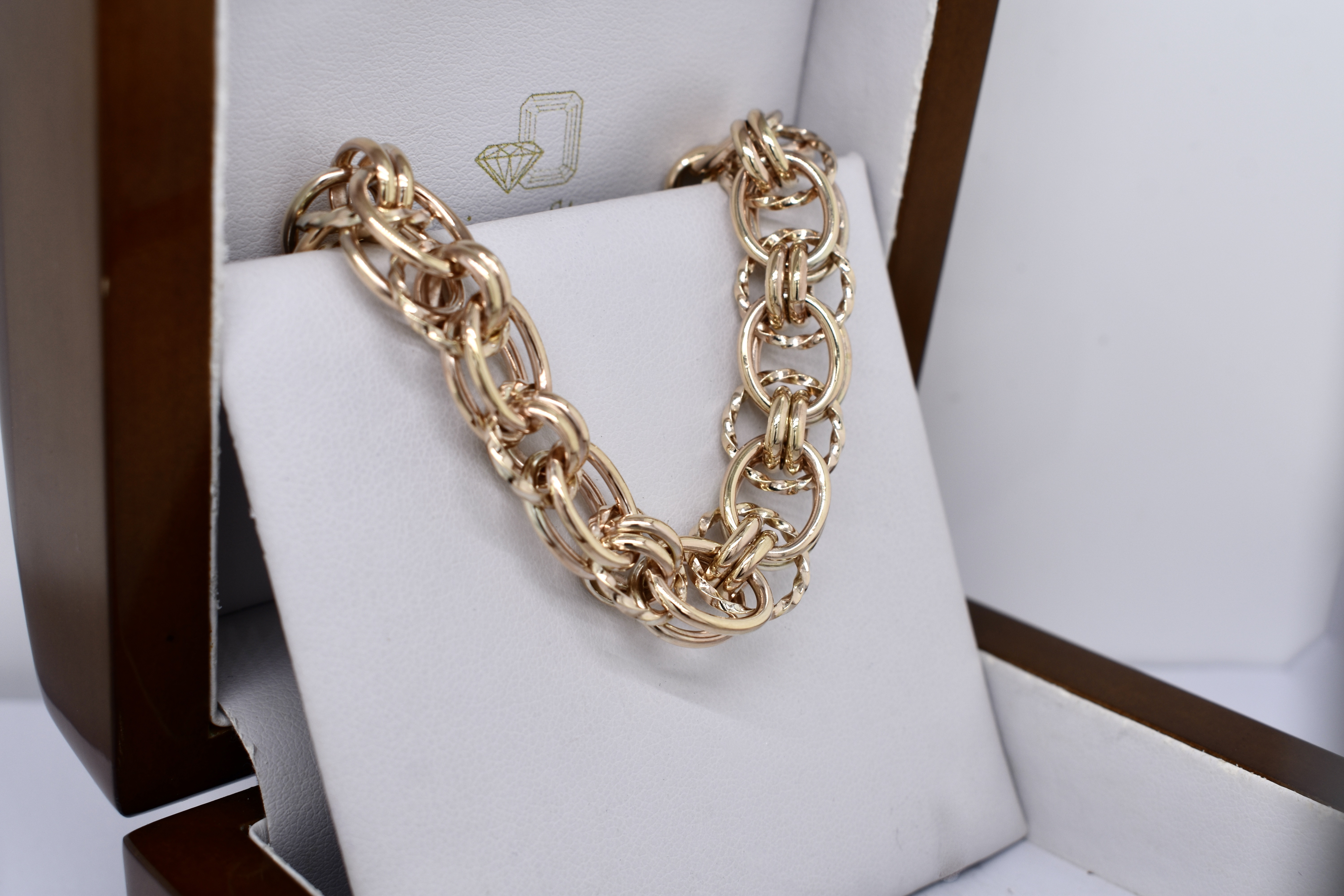 Handmade by our goldsmith in 9ct yellow gold, this stunning Italian link bracelet weighs 38.97grams and is 21cm long, with a bolt ring clasp. This link can be custom made in any length and in two tone or single tone 9ct, 18ct or sterling silver to order.