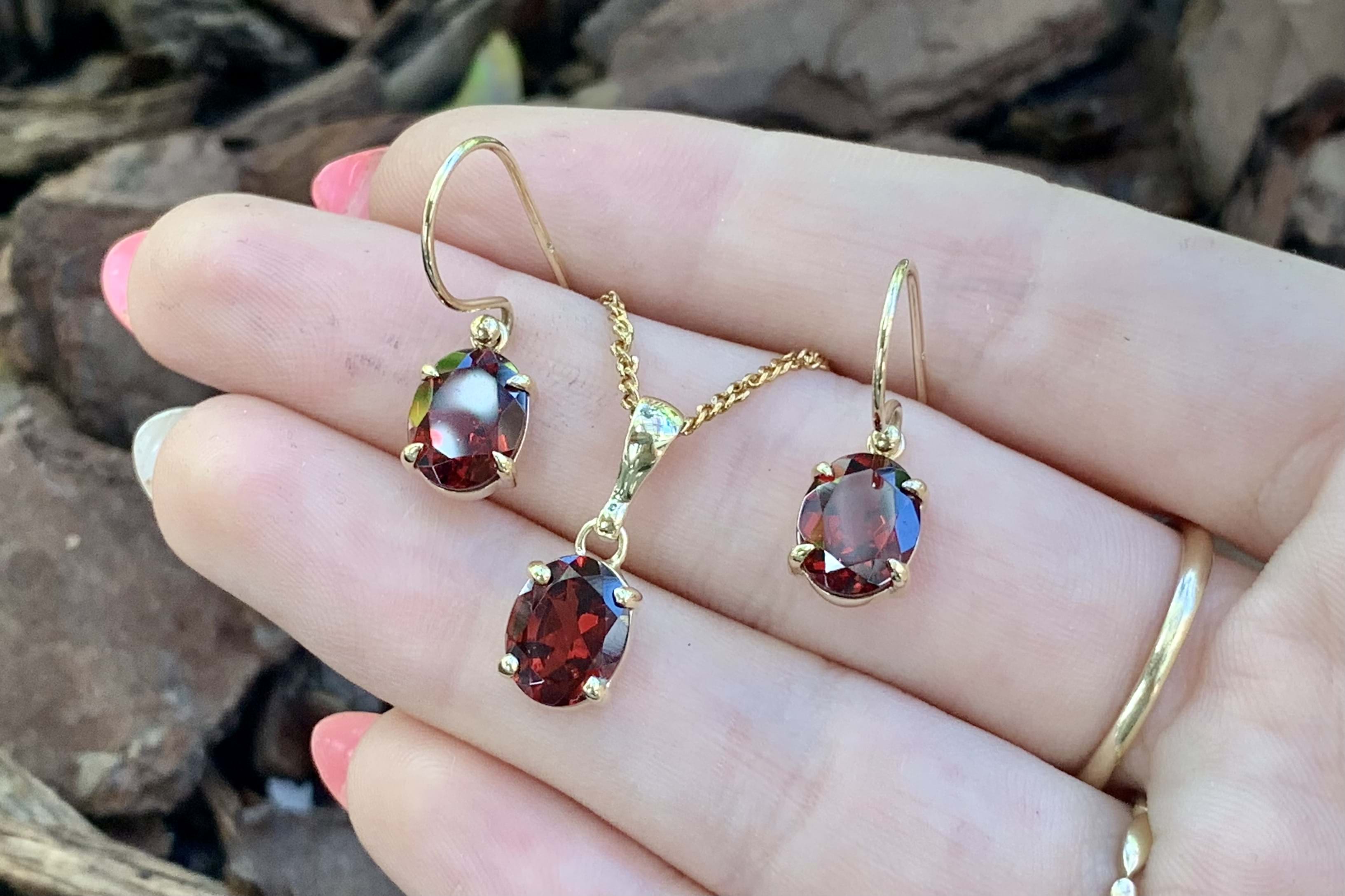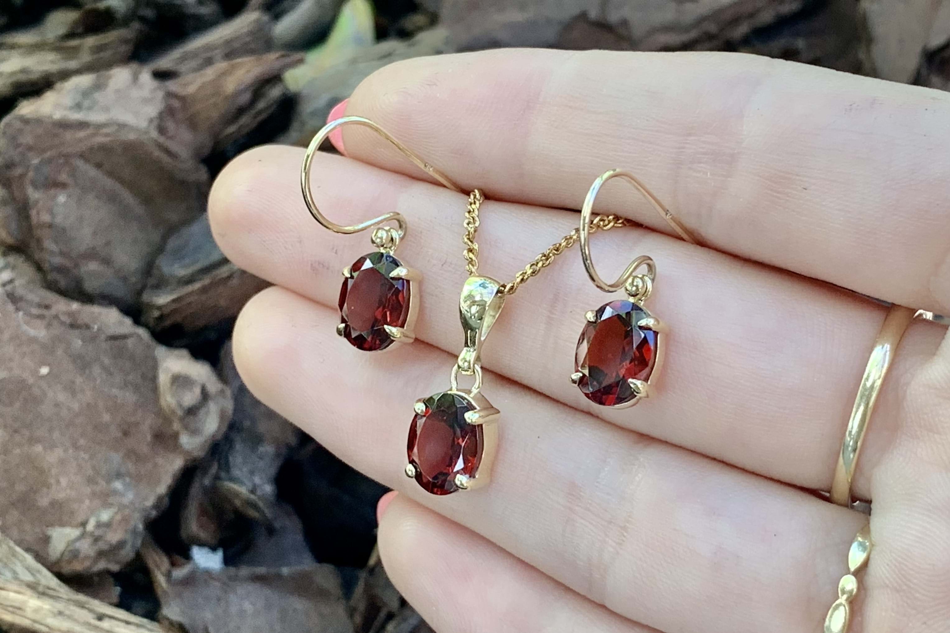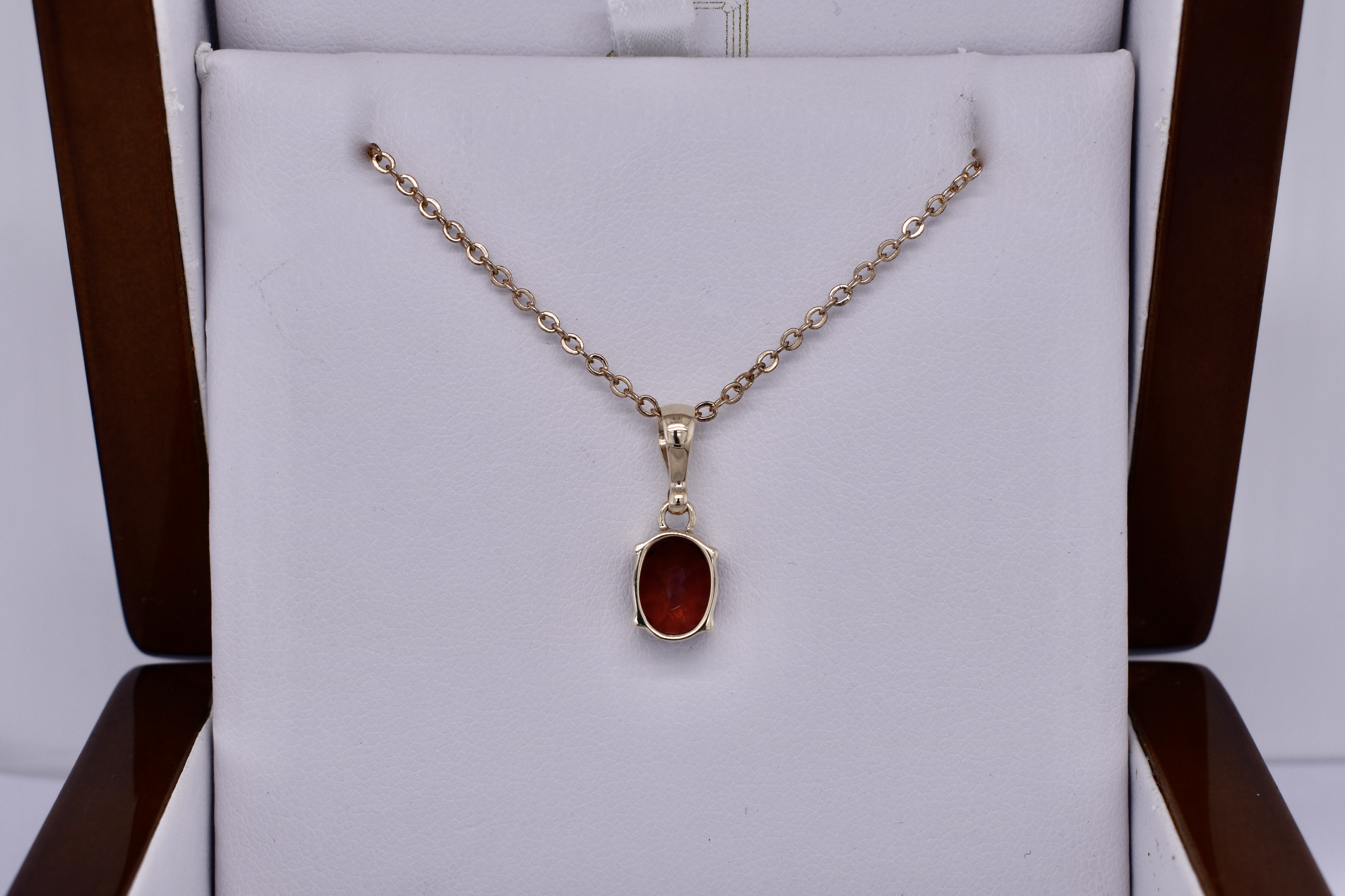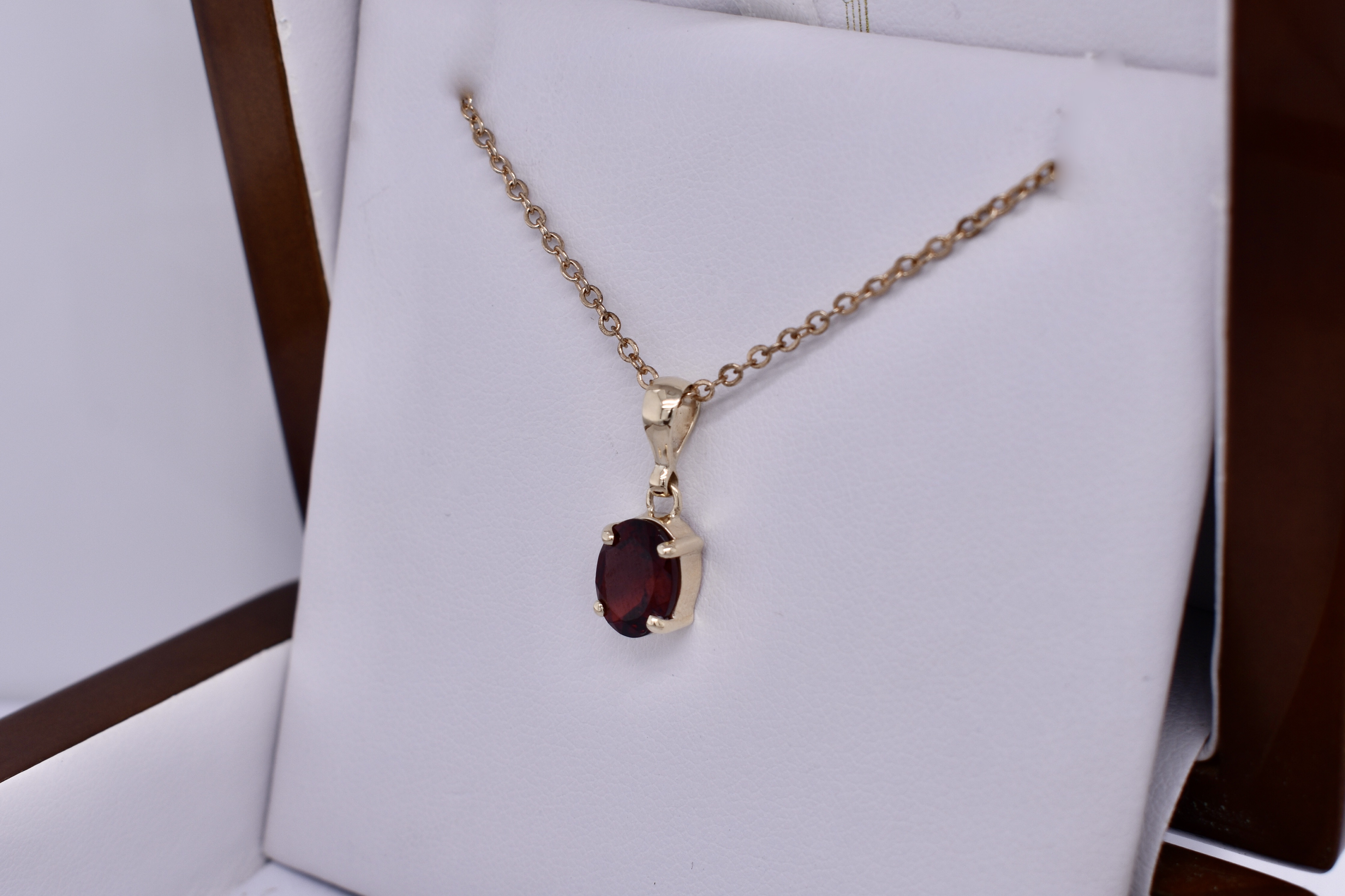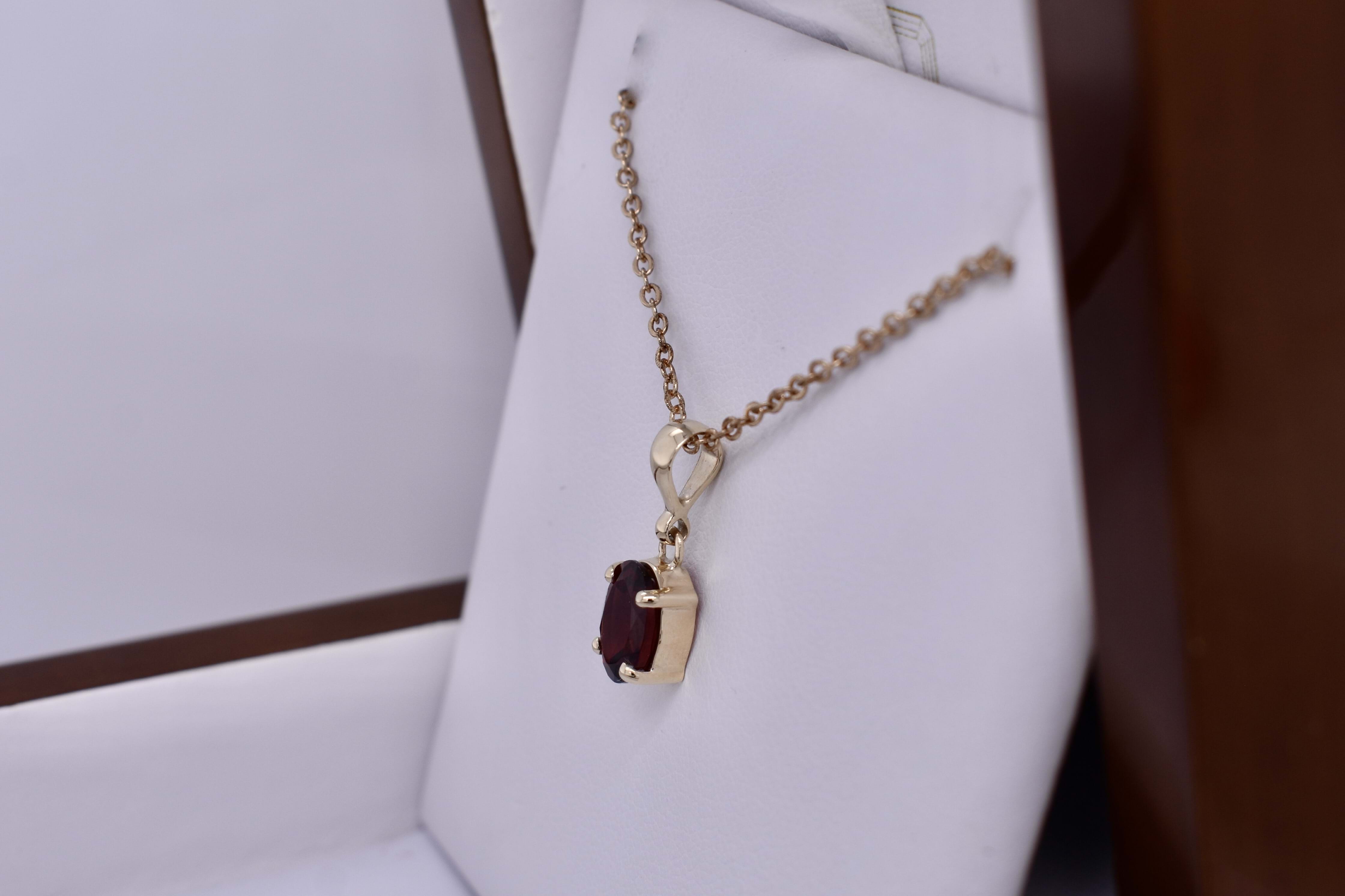 This classic handmade garnet pendant is oval shaped and four claw set in 9ct yellow gold, measuring 9.0x7.1mm. Finished with a plain bale. Chains available for separate purchase.