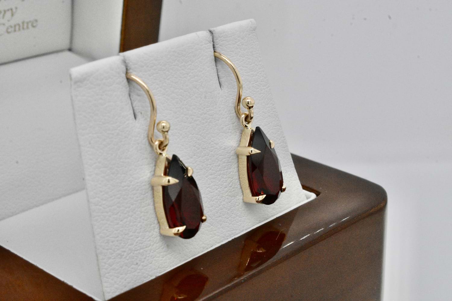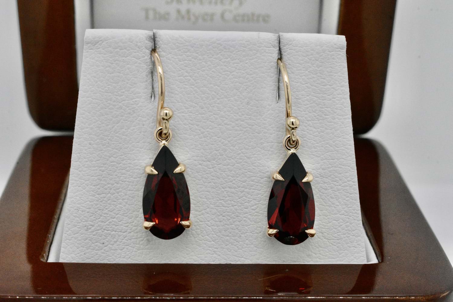 Lovely pearshape garnets measuring approx. 13x7mm set into handmade 9ct yellow gold four claw settings and suspended from shepherd hook fittings