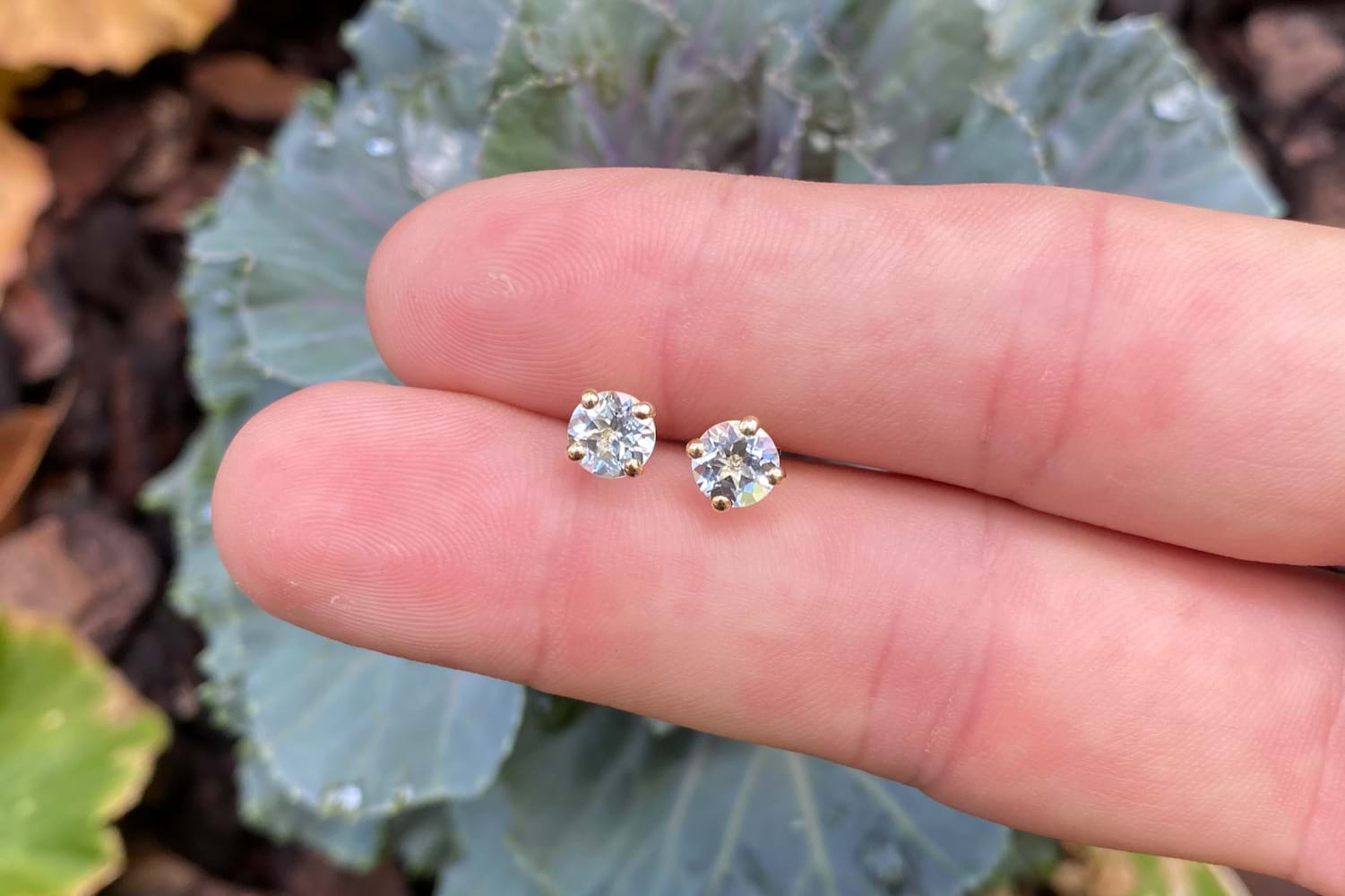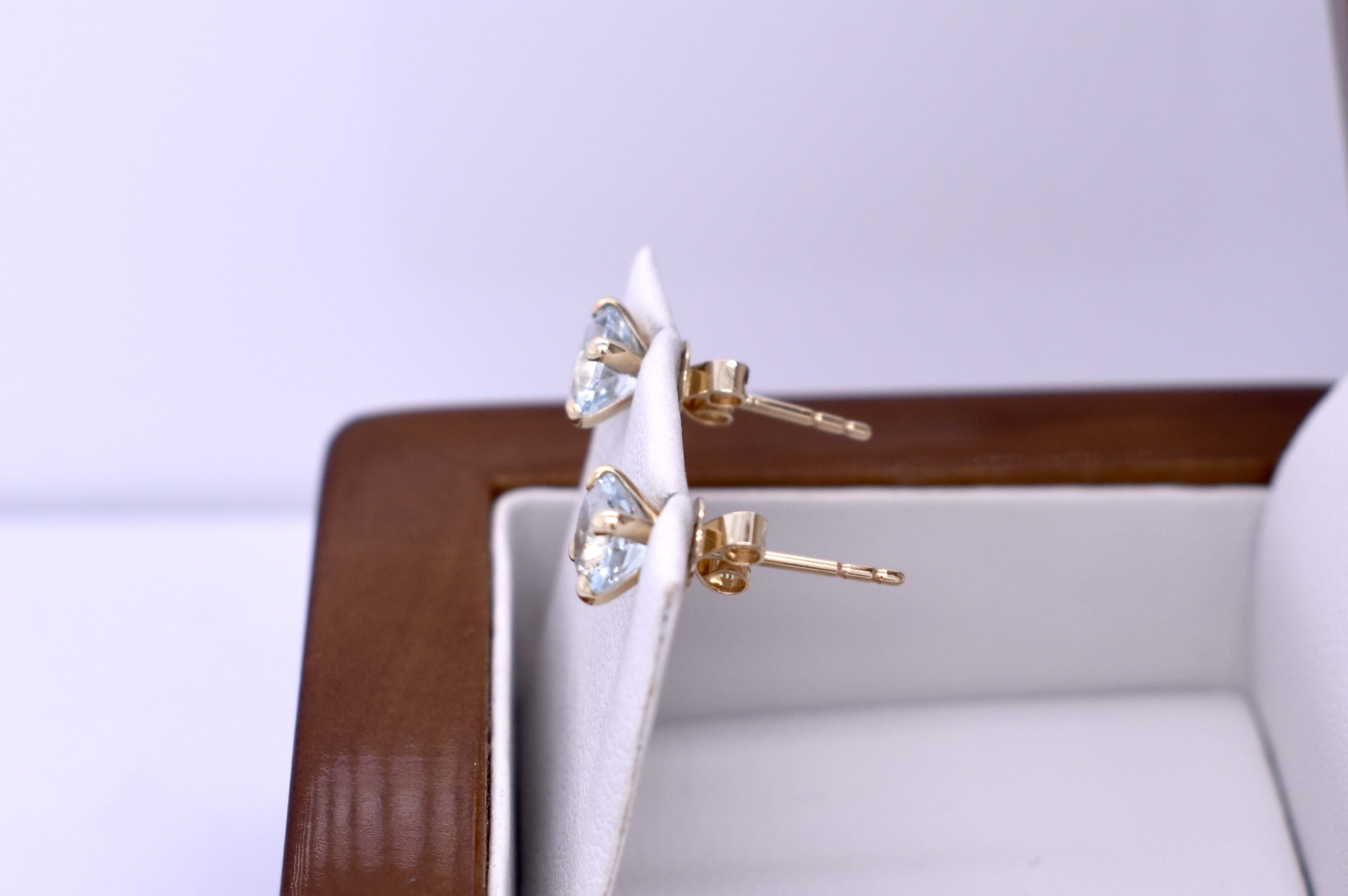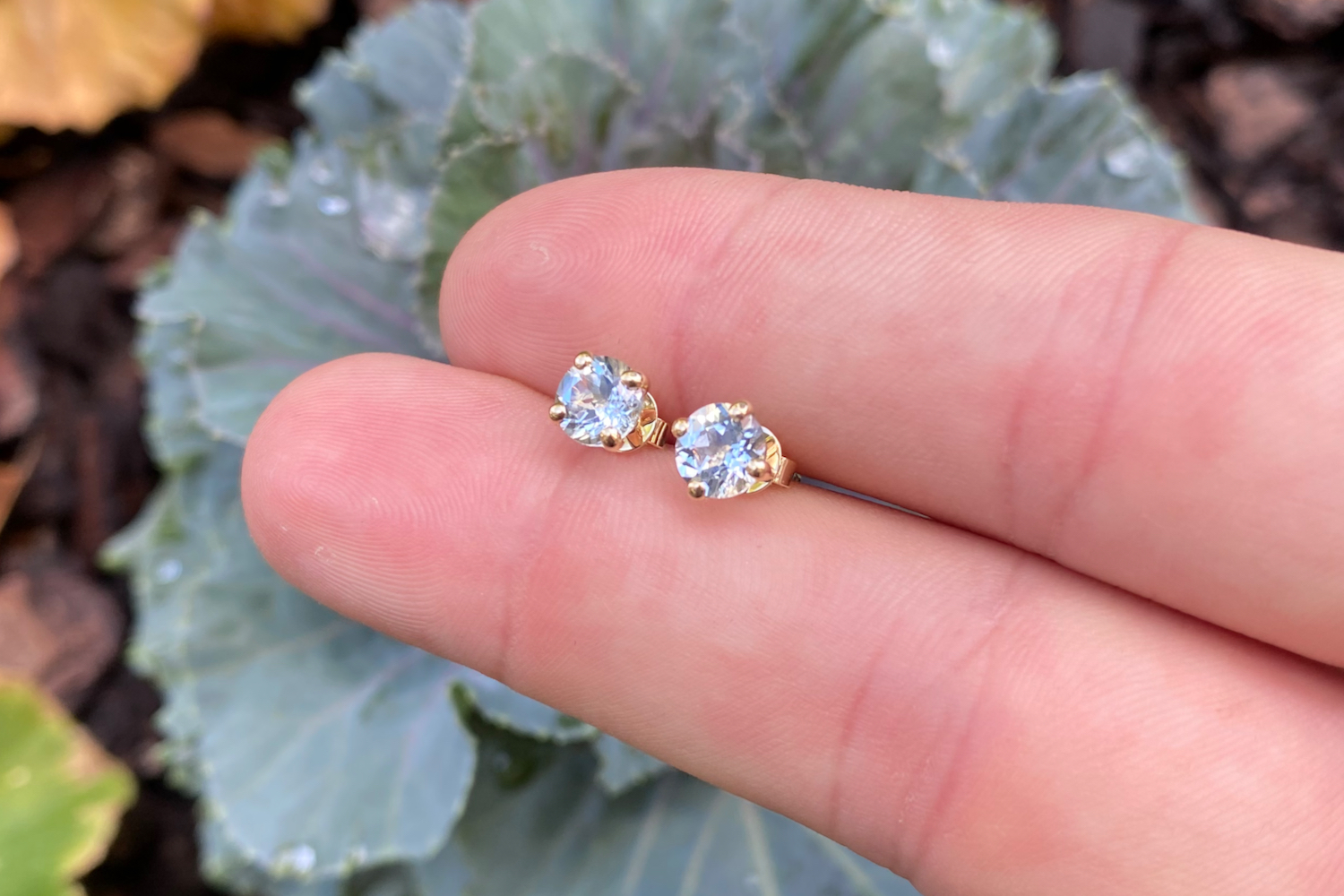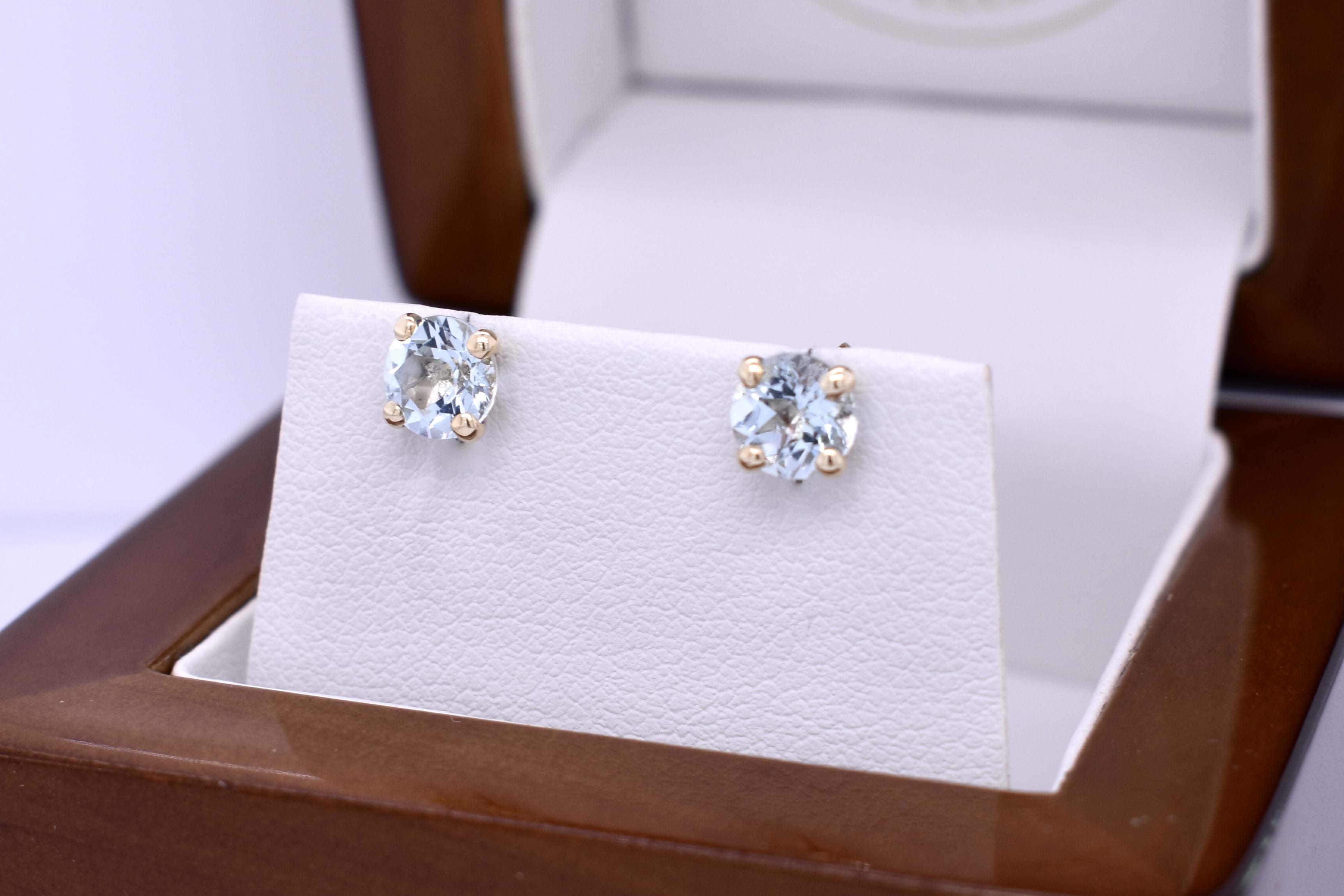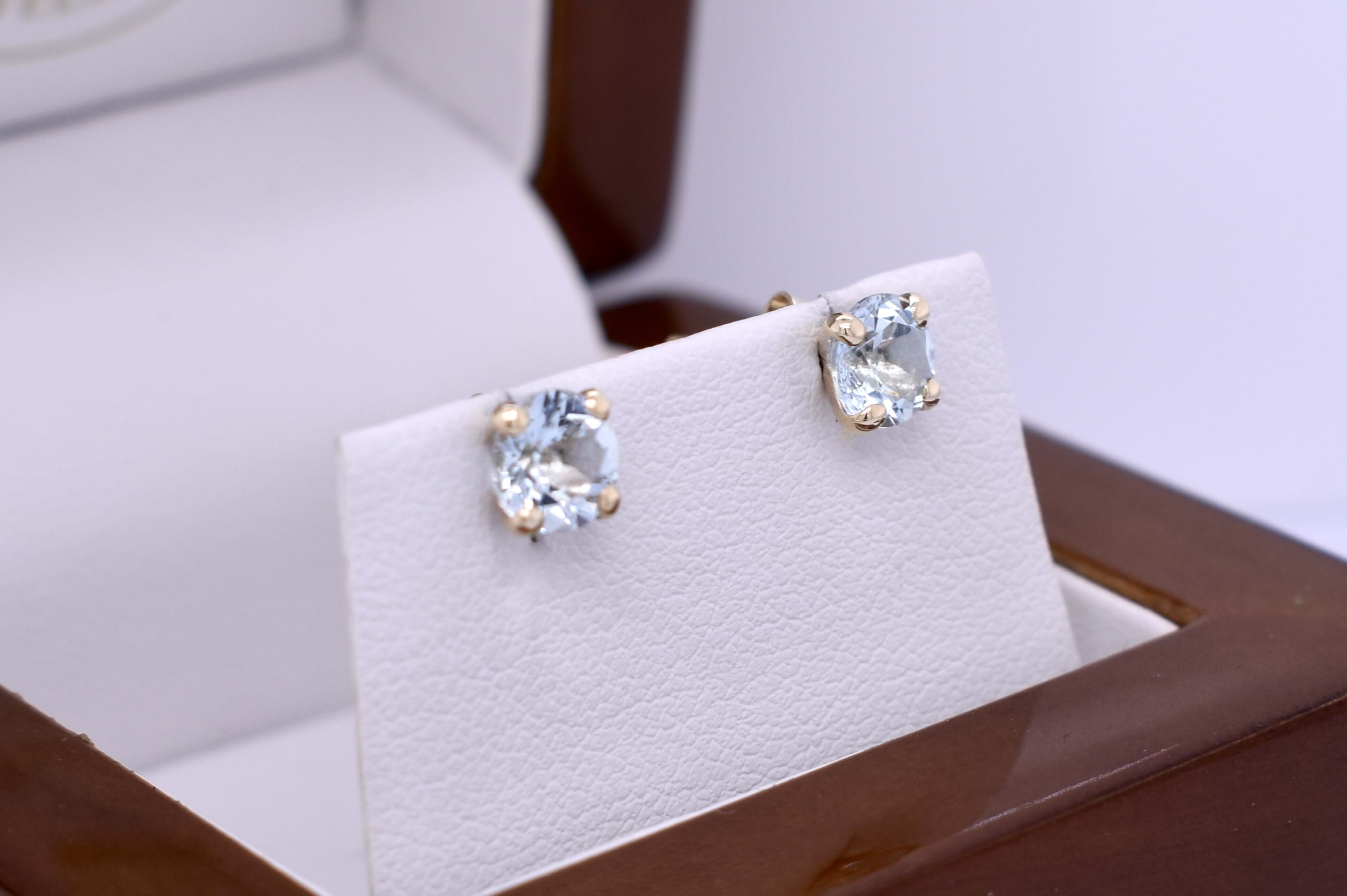 The cutest pair of approx. 5.5mm round aquamarine studs set into classic 9ct yellow gold fittings with handmade posts and butterfly fittings.