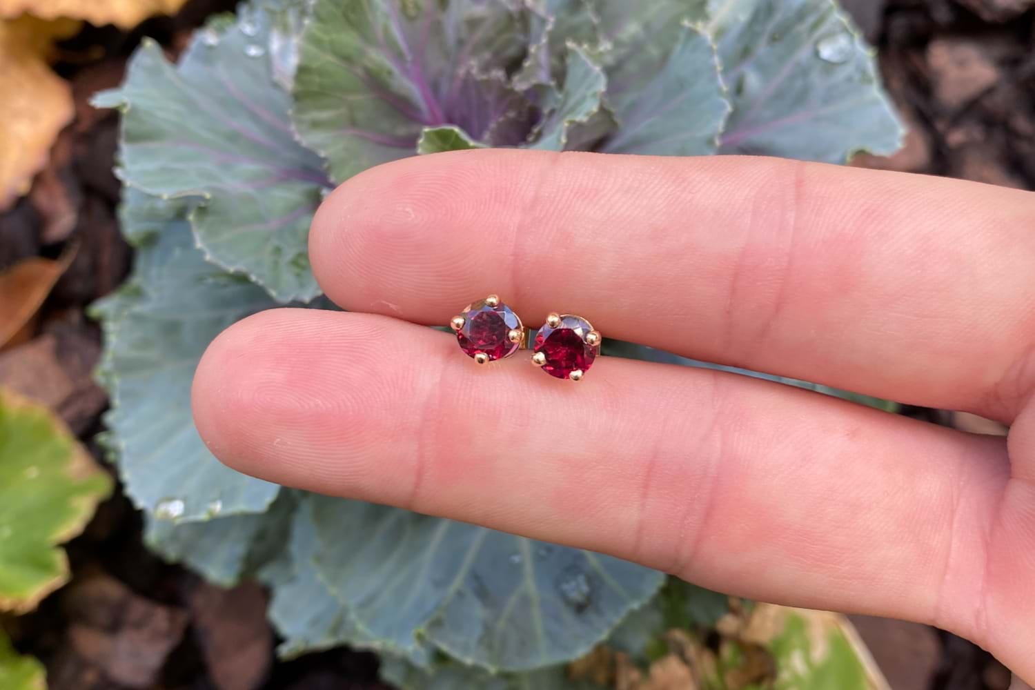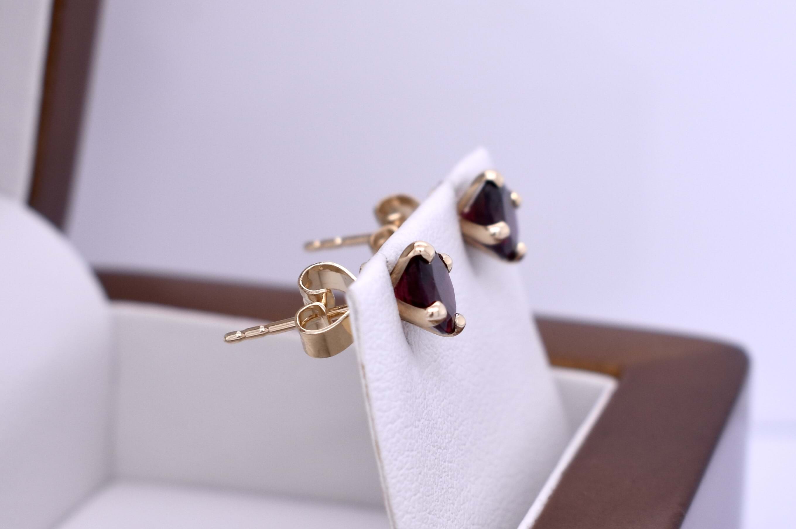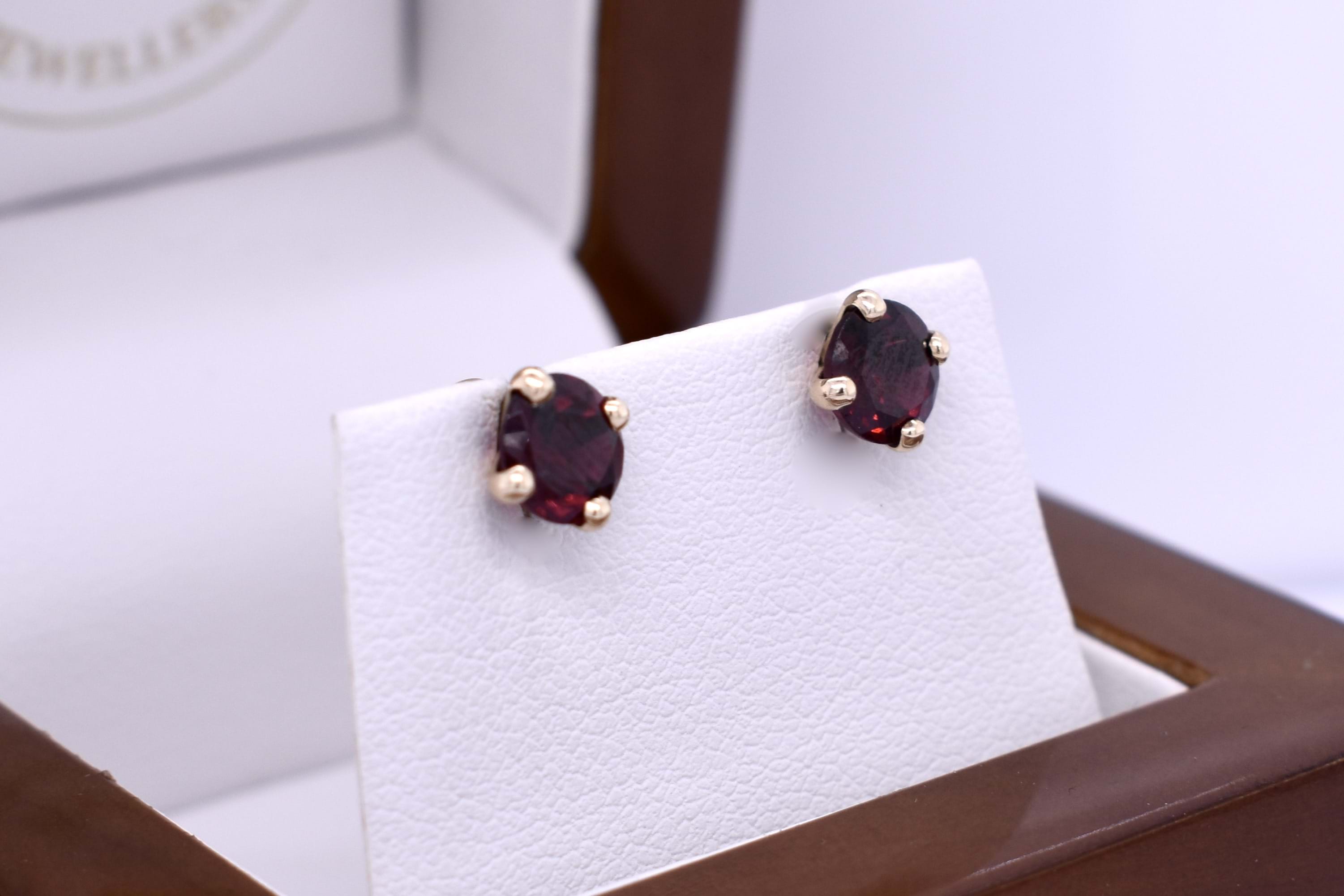 Simple and sweet pair of garnet studs featuring approx. 6.0mm round red garnets set into a classic 9ct yellow gold studs with handmade posts and butterfly fittings.