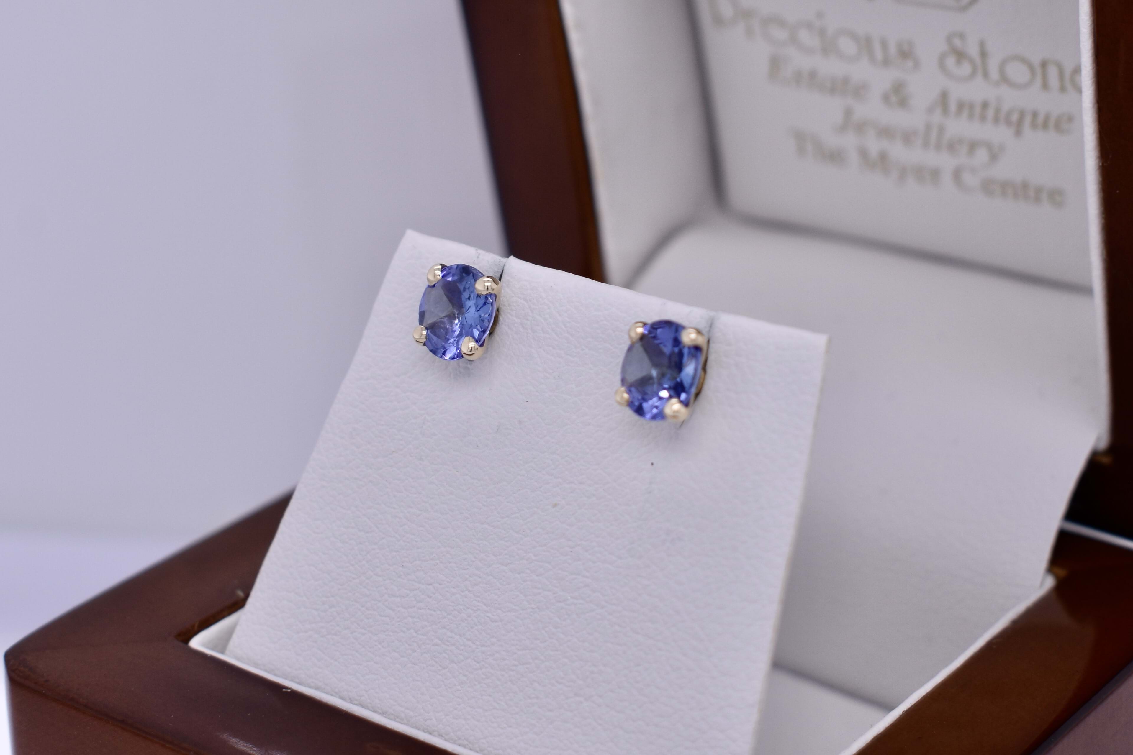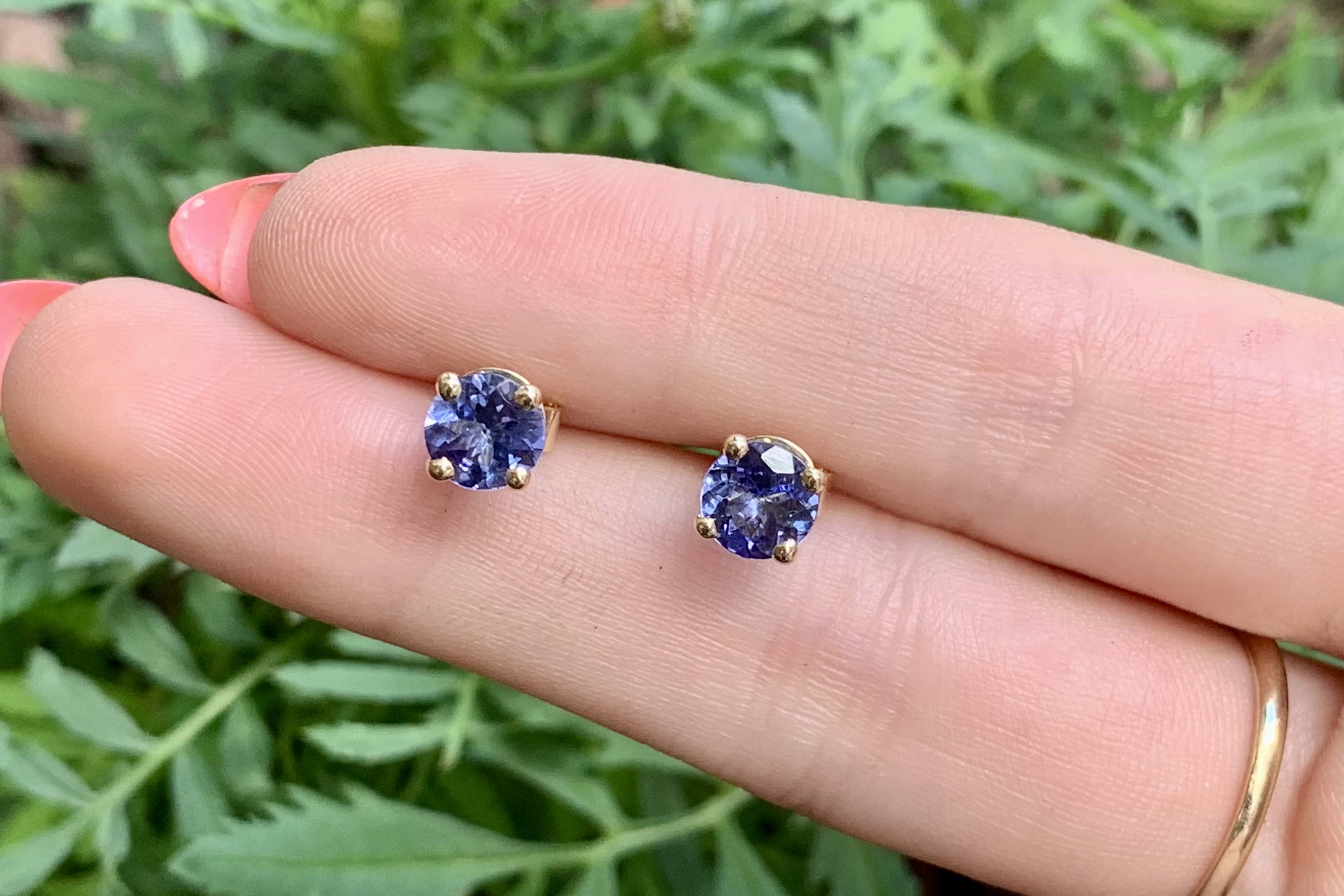 Simple and vibrant, this pair of 6.1mm round tanzanites are four claw set in 9ct yellow gold with post and butterfly fittings.