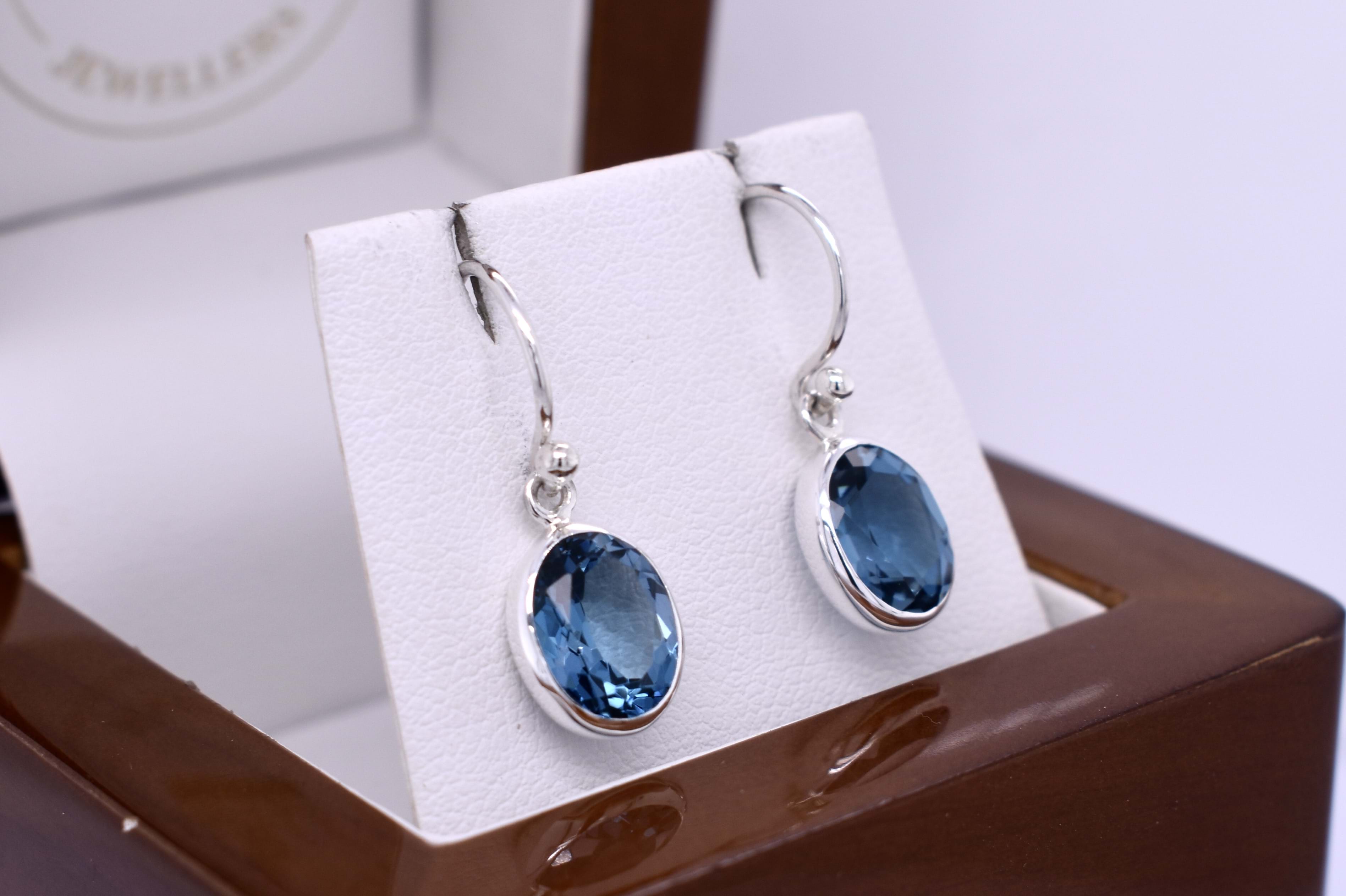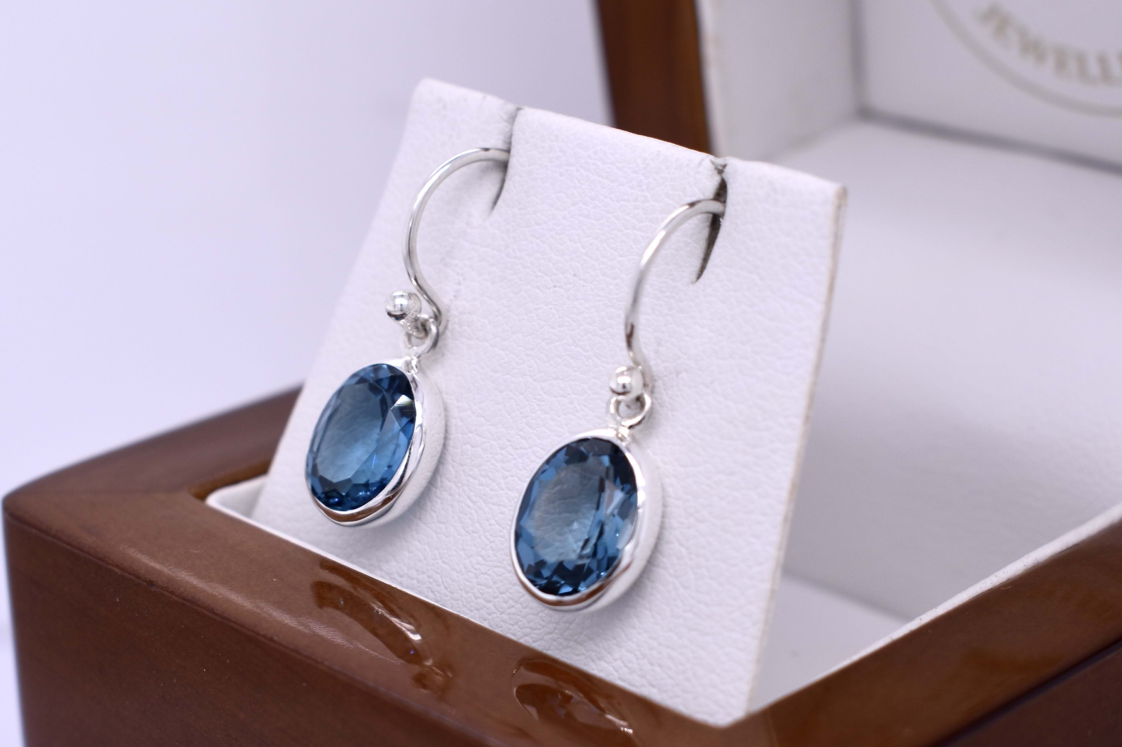 These appealing earrings feature oval London blue topaz measuring approx. 10.25x8.4mm, set into handmade sterling silver bezel settings. The earrings are finished with shepherd hook fittings for everyday wear.