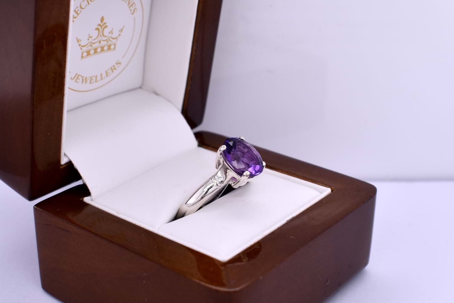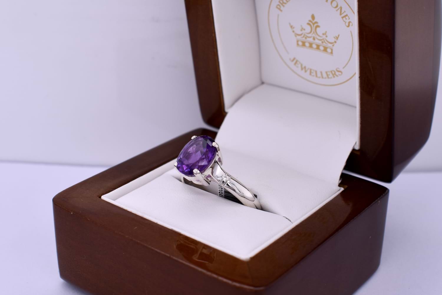 Gorgeous in purple, this ring is handmade and features an oval amethyst measuring approx. 10.8x8.9mm, four claw set into a sterling silver setting. The ring is finished on a plain, grooved band. Finger size R+.