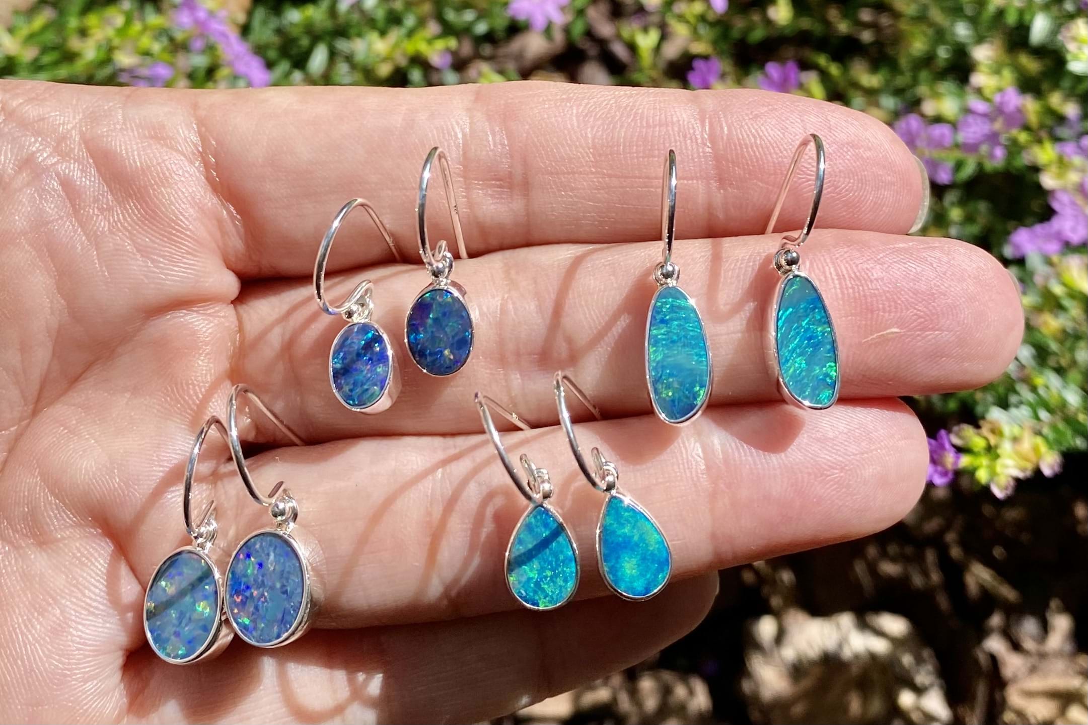 These stunning earrings feature pearshape Coober Pedy opals measuring approx. 10x7mm, that are set into handmade sterling silver bezel settings. The opal is a doublet, with a boulder opal backing and shows flashes of blue and green throughout. The earrings are finished with shepherd hook fittings.