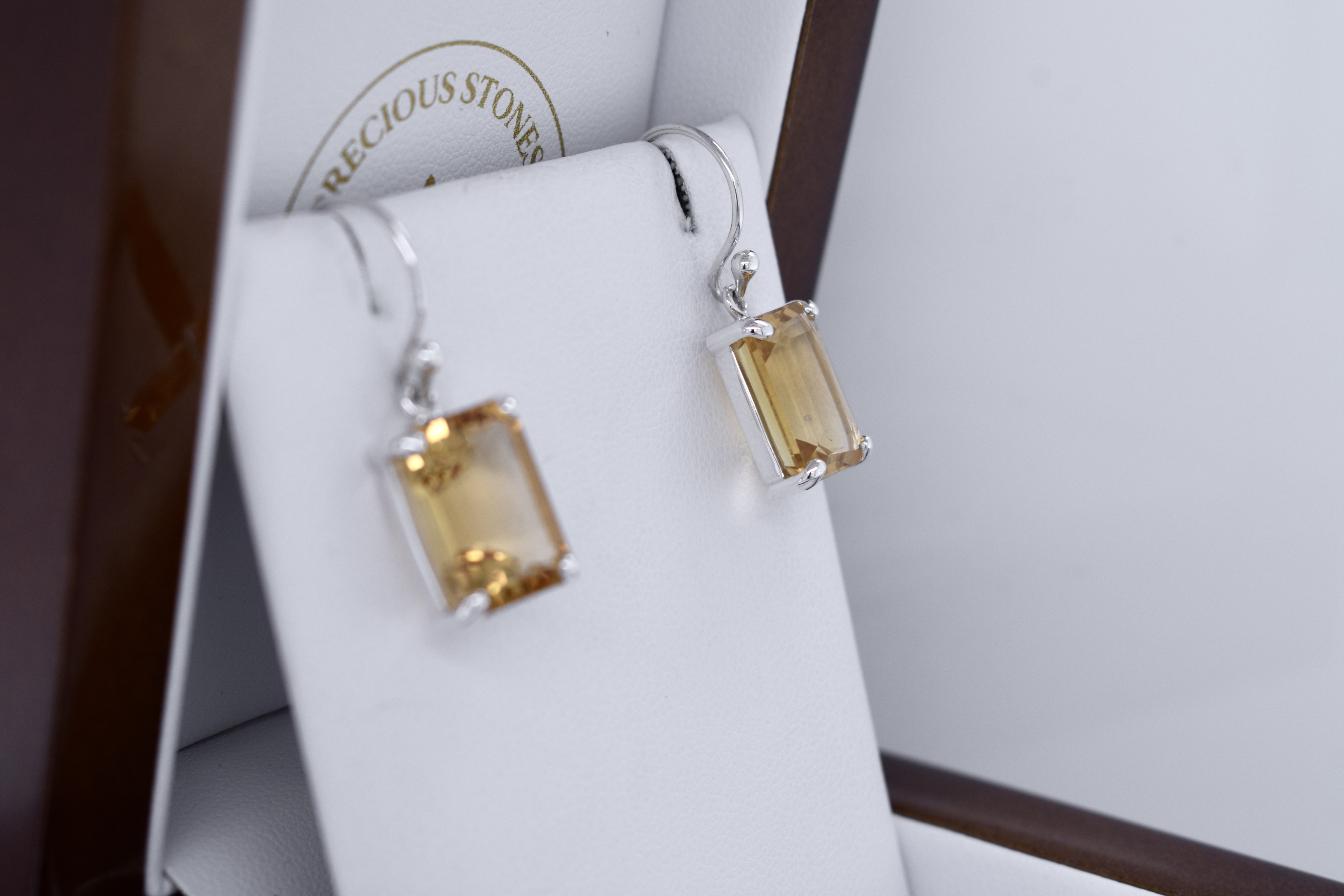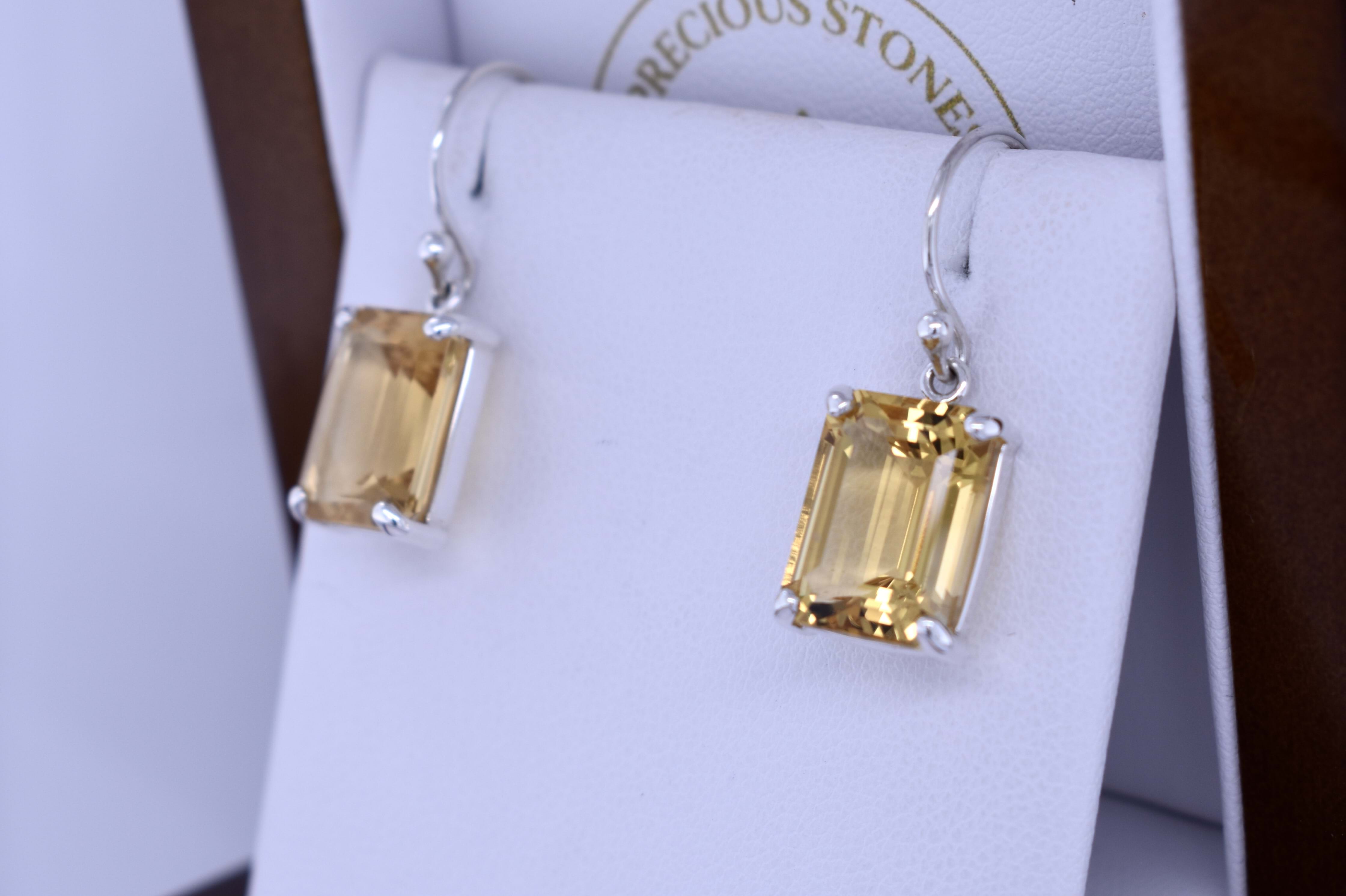 These pretty earrings feature emerald cut citrines measuring approx. 12x9.1mm, four claw set into handmade sterling silver settings. The earrings are finished with shepherd hooks for everyday wear.