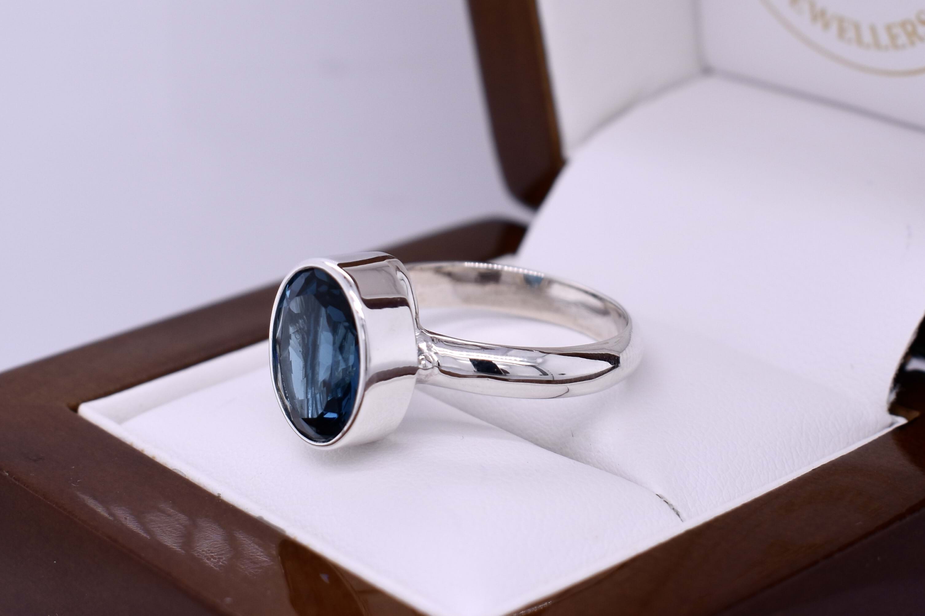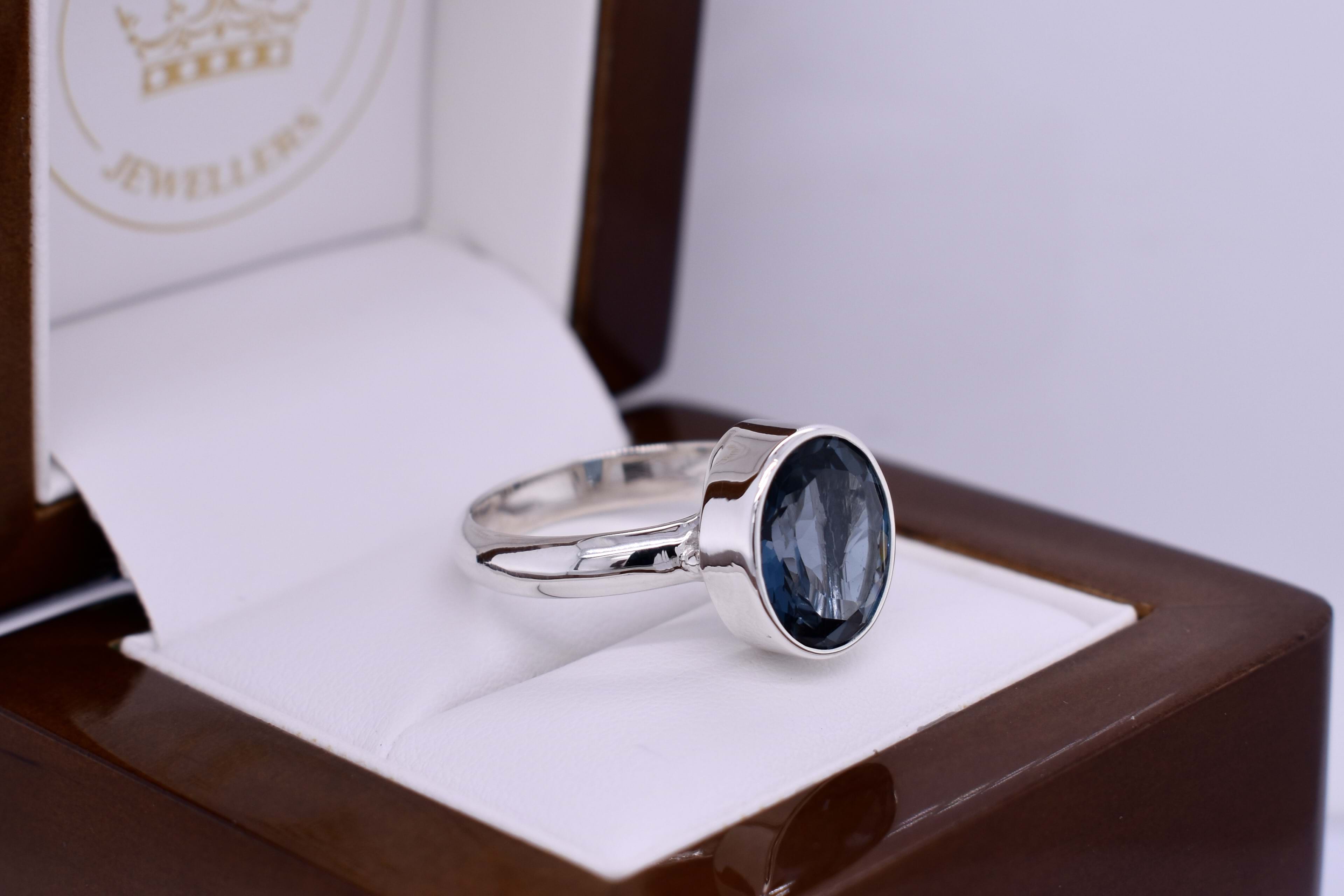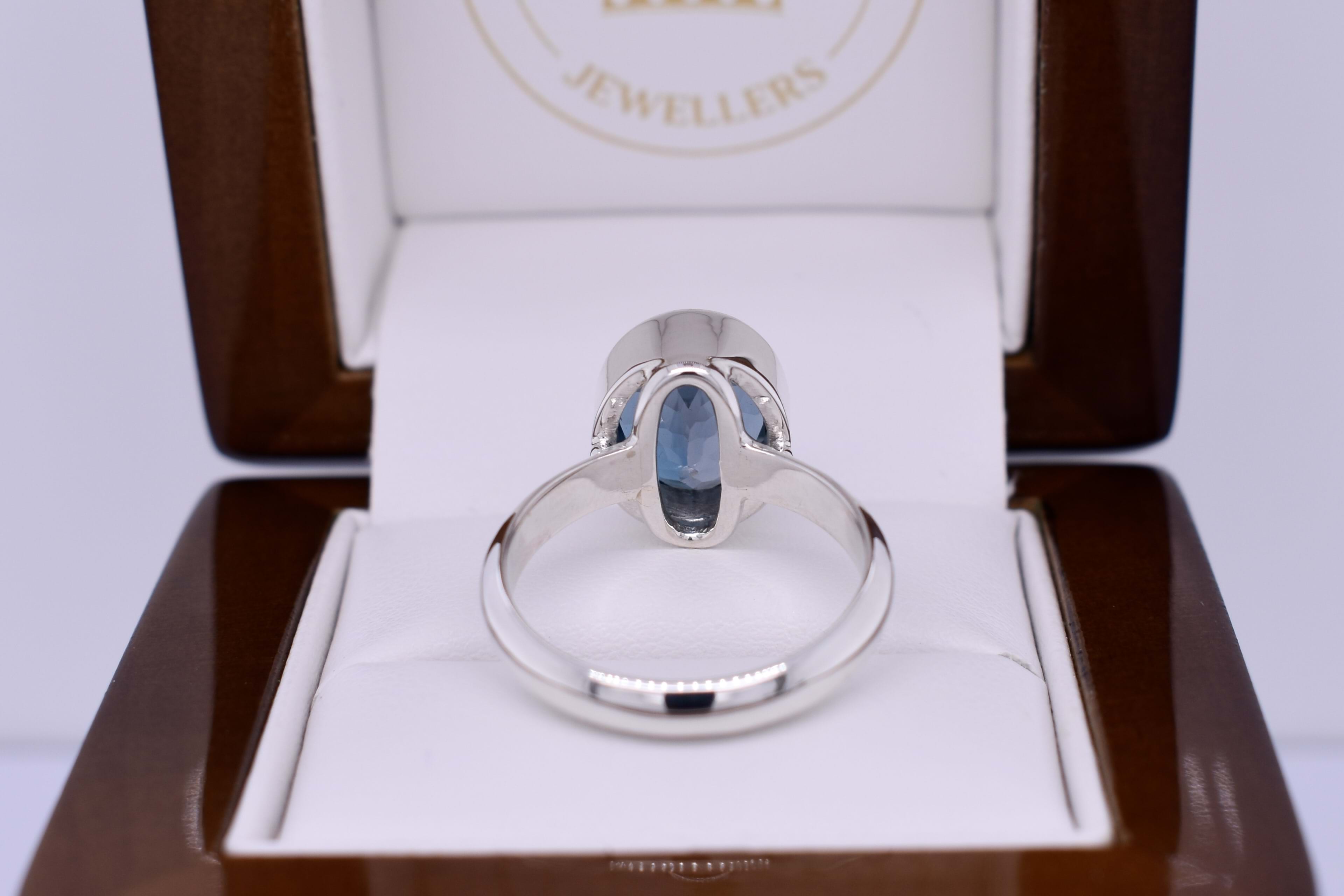 This pretty ring is handmade and features an oval London blue topaz measuring approx. 13x11mm, set into a handmade sterling silver bezel setting. Finished on a plain band. Finger size O+.