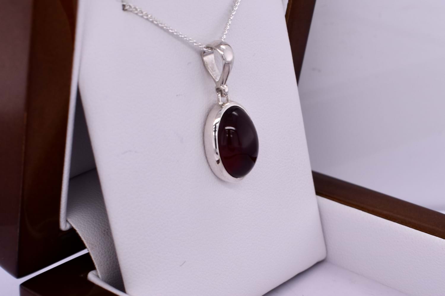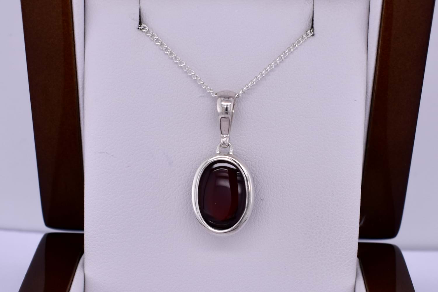 This pretty pendant is handmade and features an oval cabochon hessonite garnet measuring approx. 14.2x11.7mm, bezel set into a sterling silver setting. Finished with a plain bale. Chains are available for separate purchase.