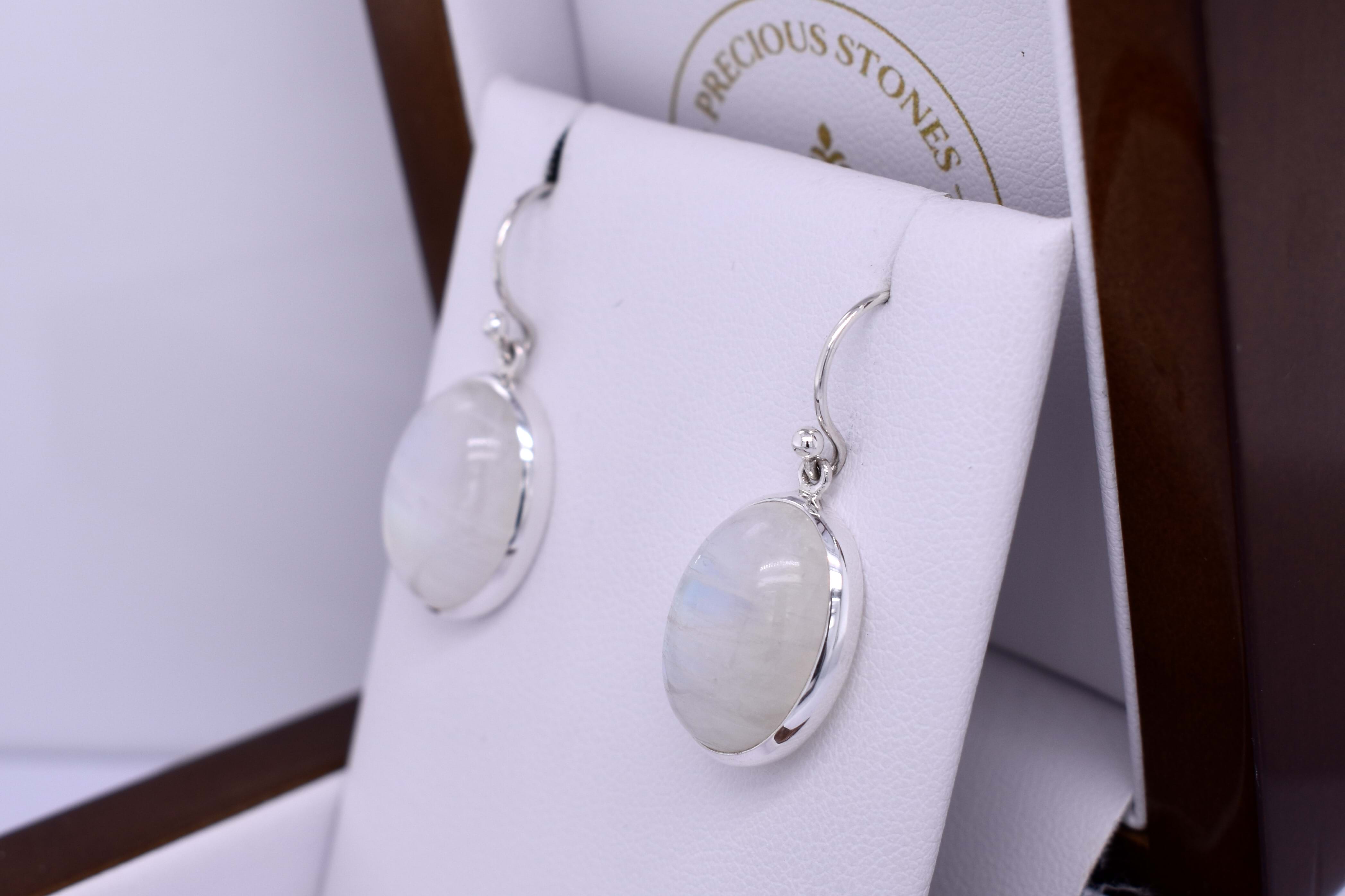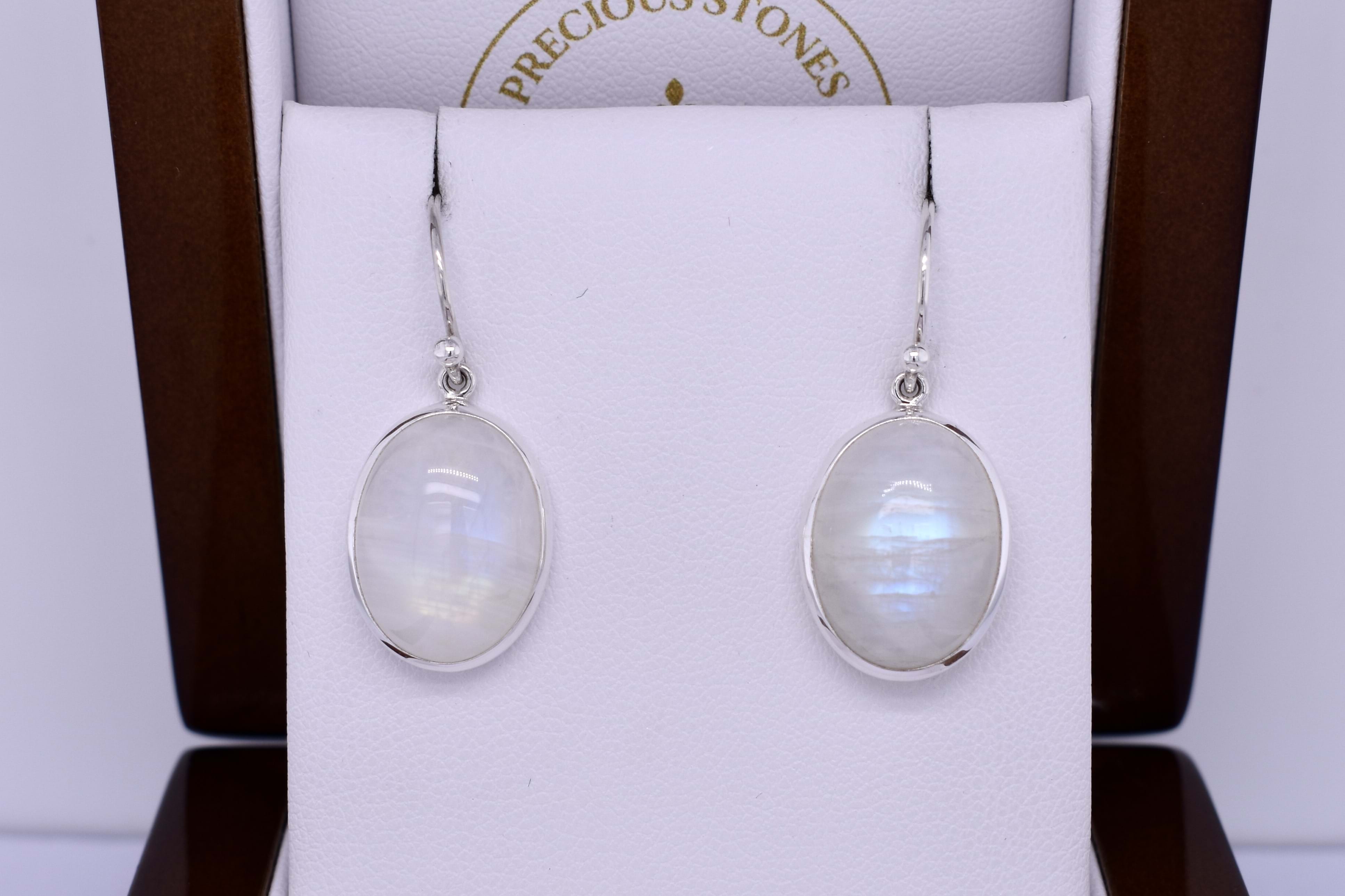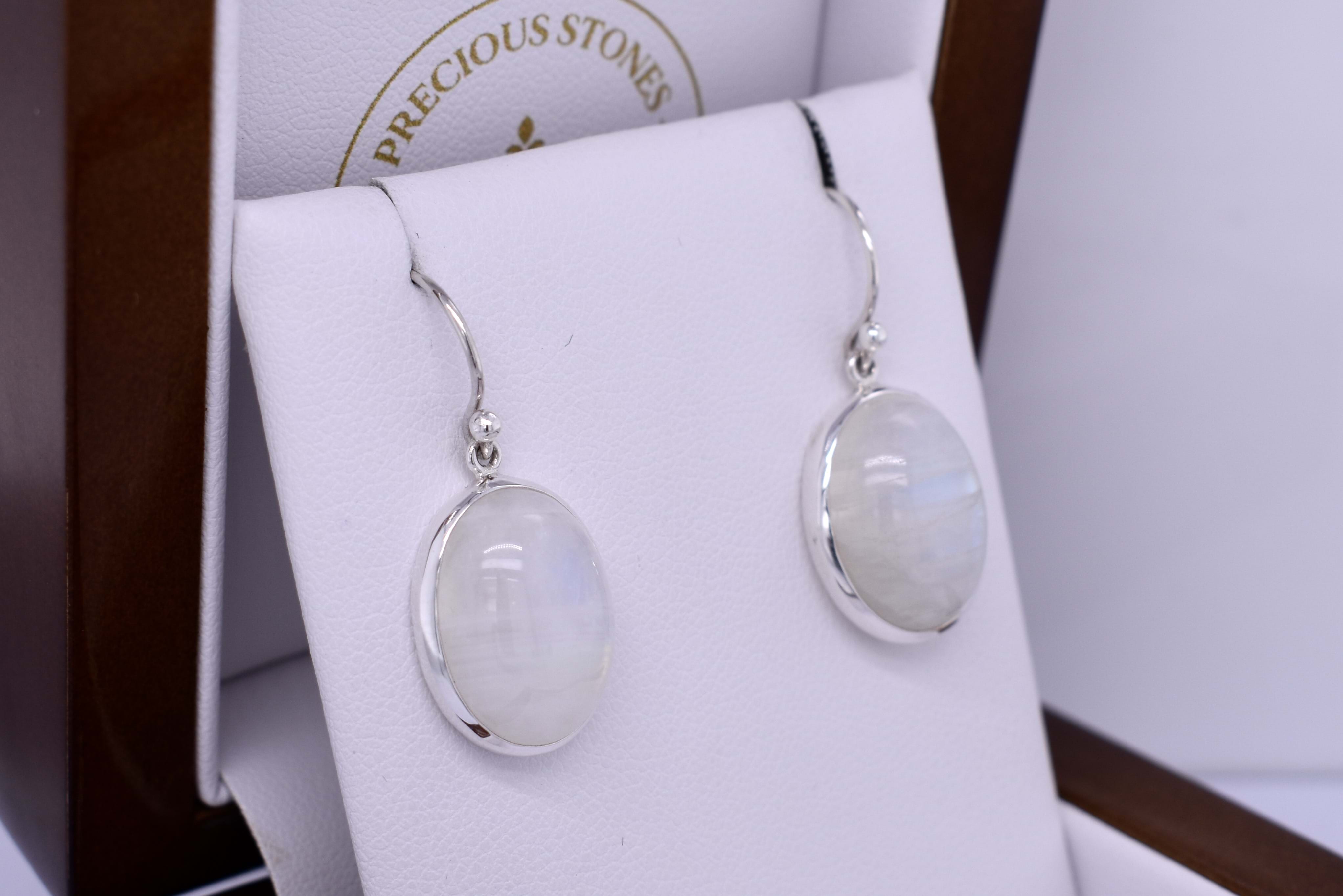 These gorgeous earrings are handmade and feature oval moonstones measuring approx 16.9x13.4mm, set into sterling silver bezel settings. The earrings are finished with shepherd hook fittings for everyday wear. Matching drops: 20396596