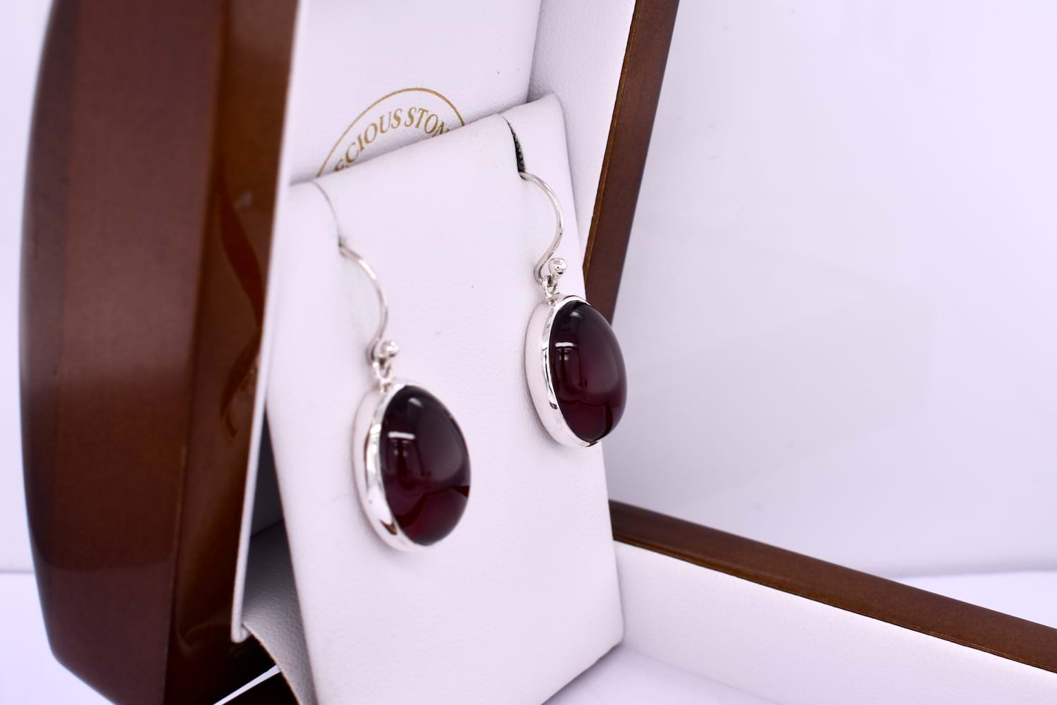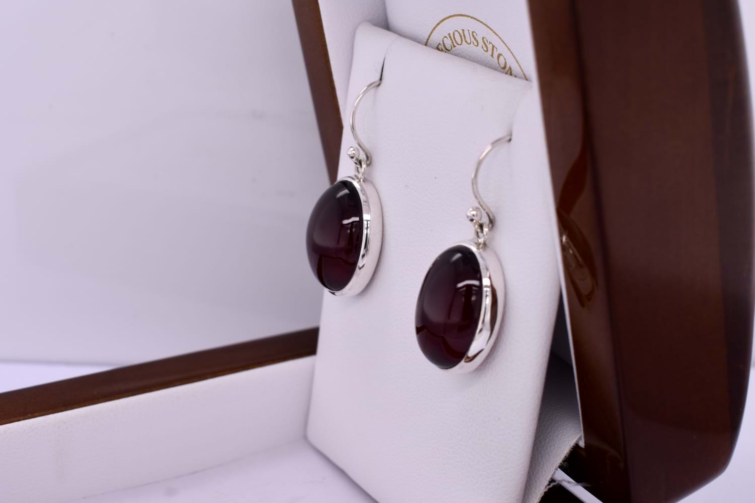 These unique earrings are handmade and feature two oval cabochon hessonite garnets measuring approx. 17.4x13.5mm, bezel set into sterling silver bezel settings. The earrings are finished with shepherd hook fittings for everyday wear.