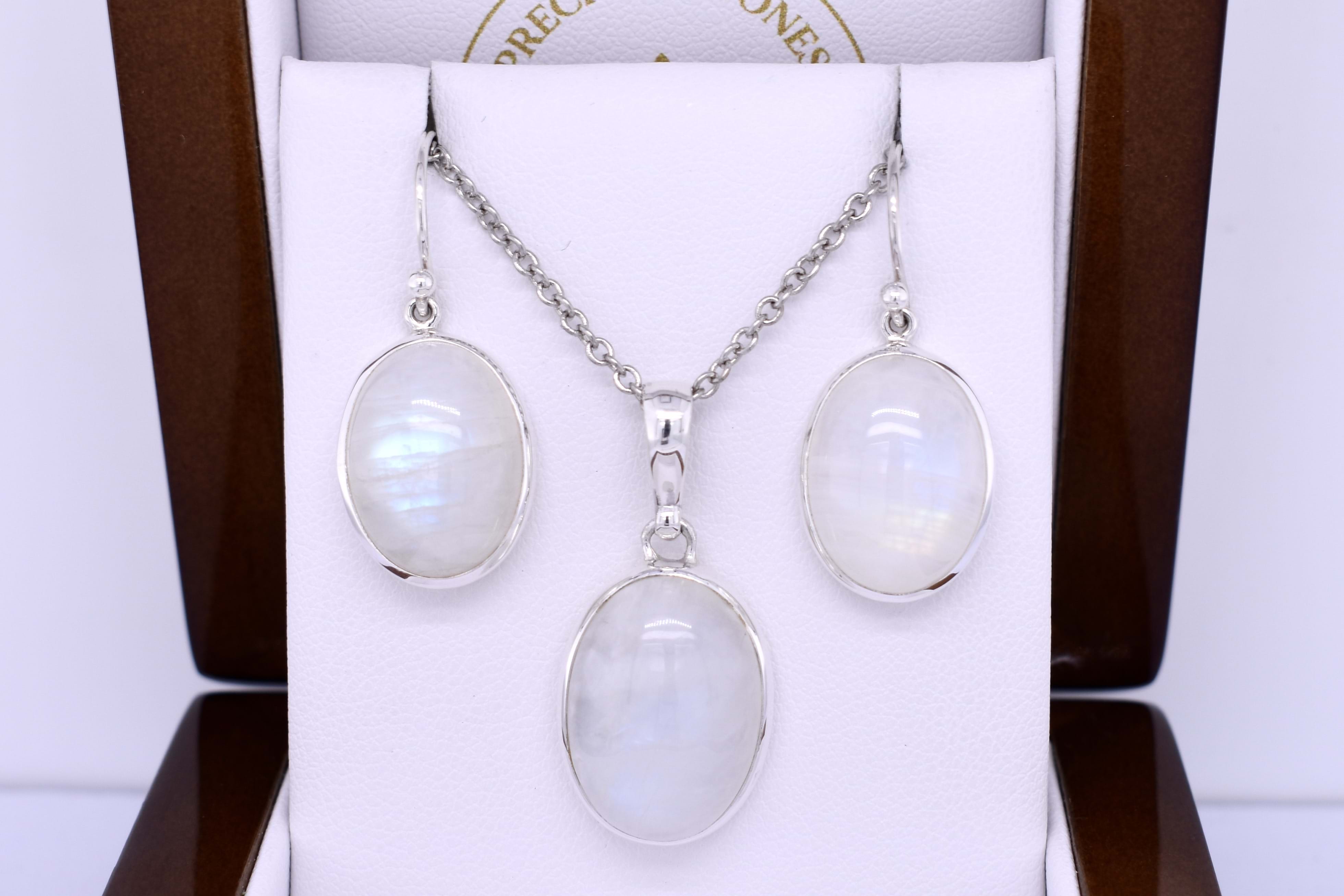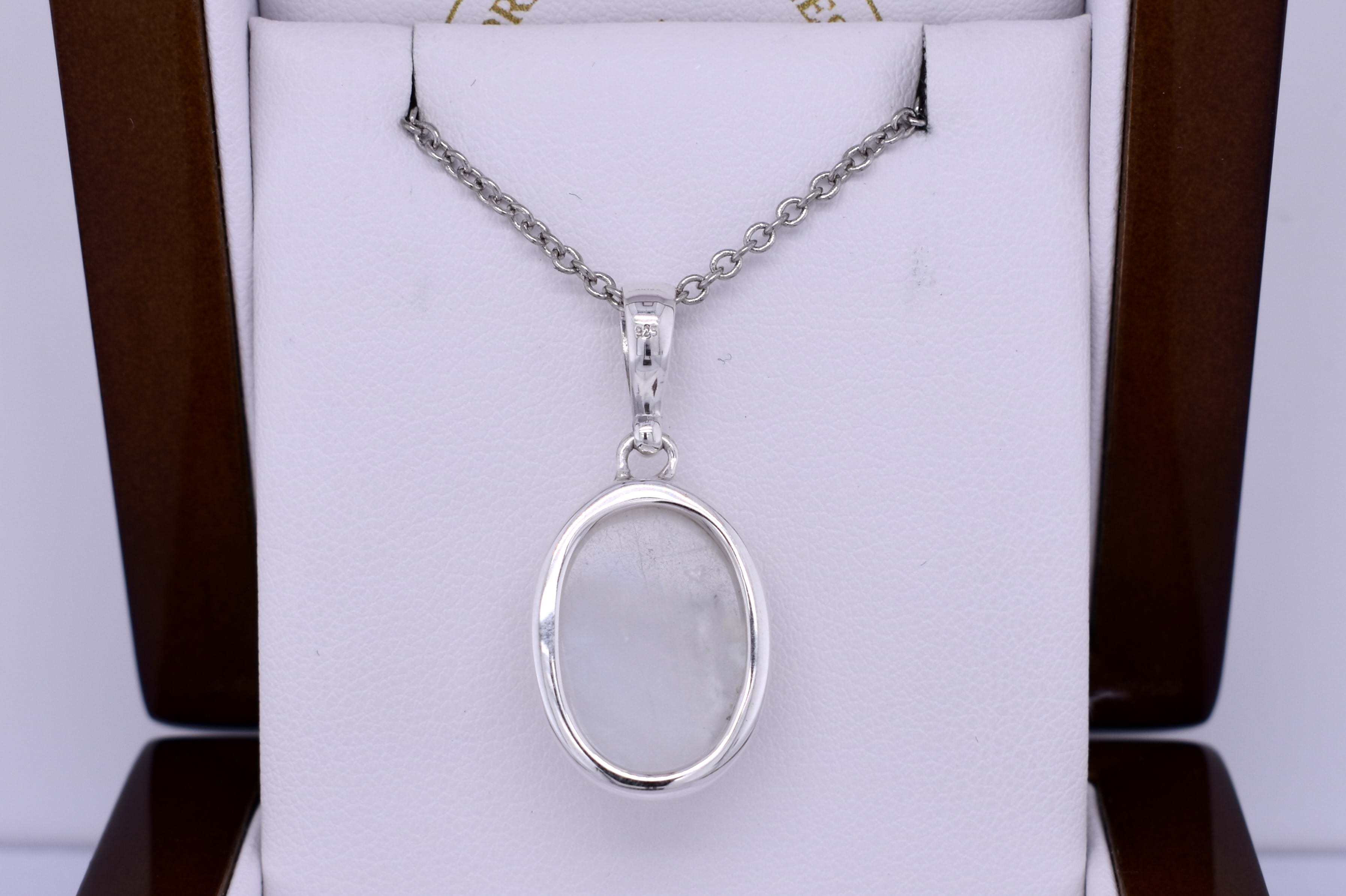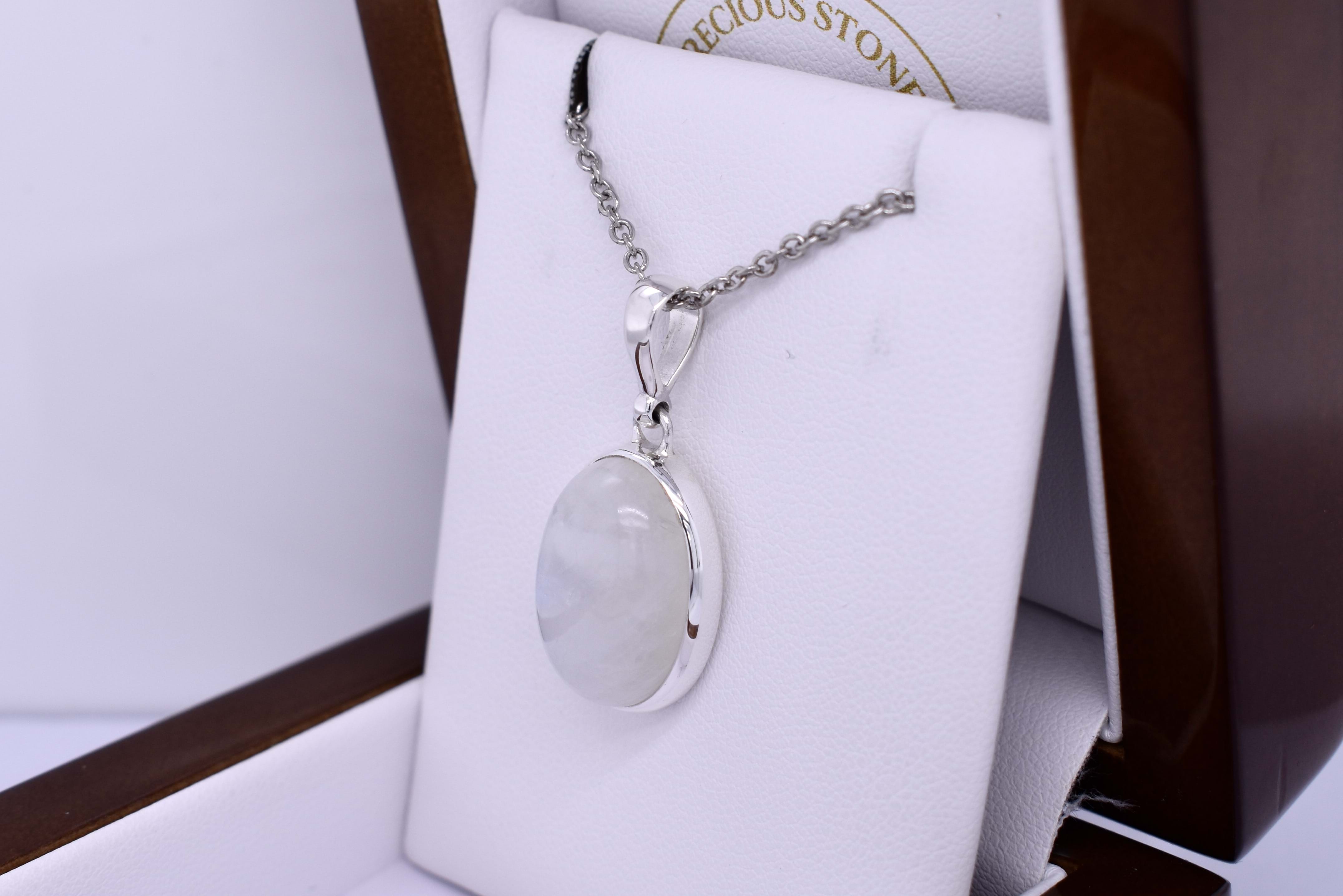 This classic pendant is handmade and features an oval moonstone measuring approx. 20.5x14.5mm, set into a sterling silver bezel setting. Finished with a plain bale. Chains are available for separate purchase. Matching drops: 20396589