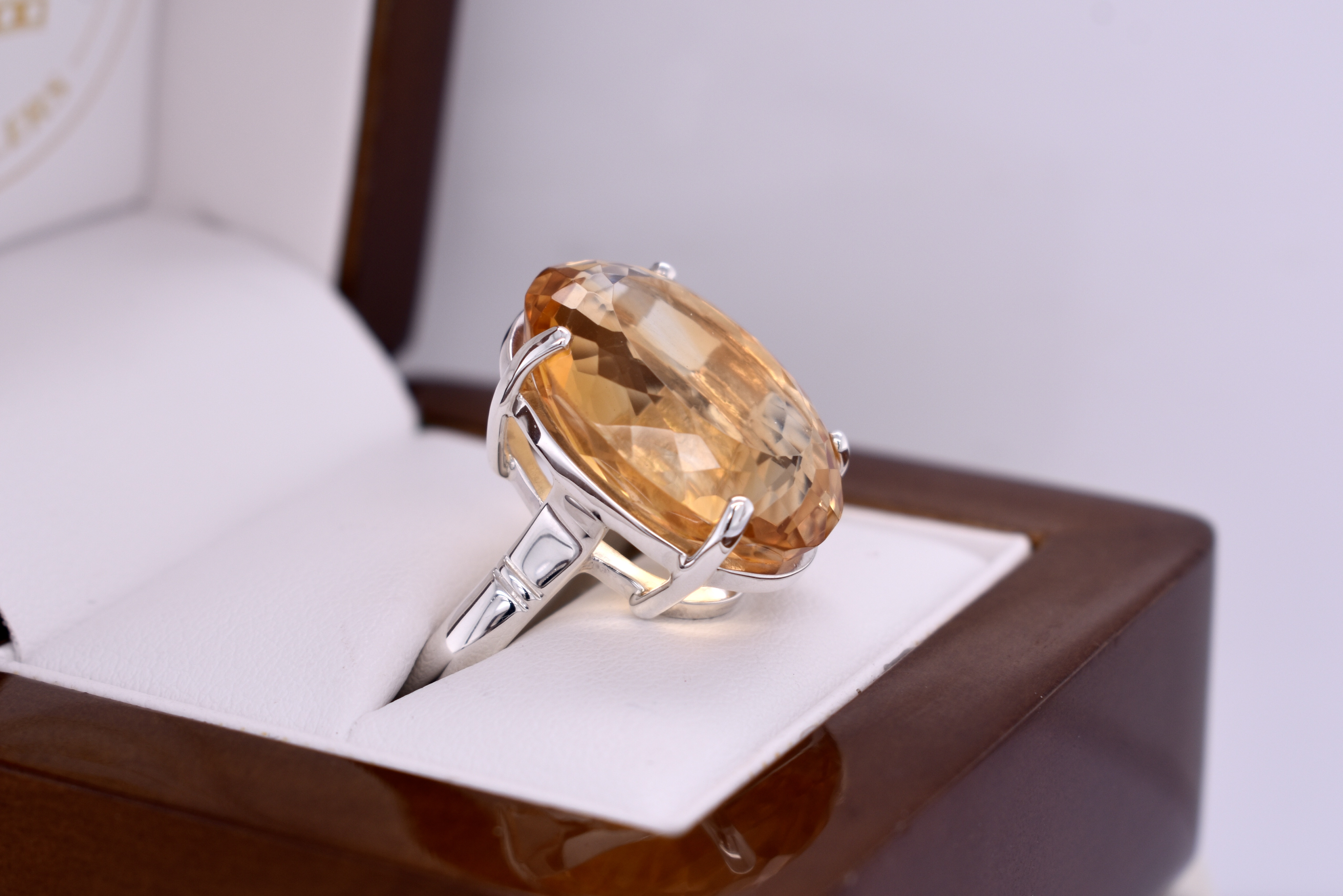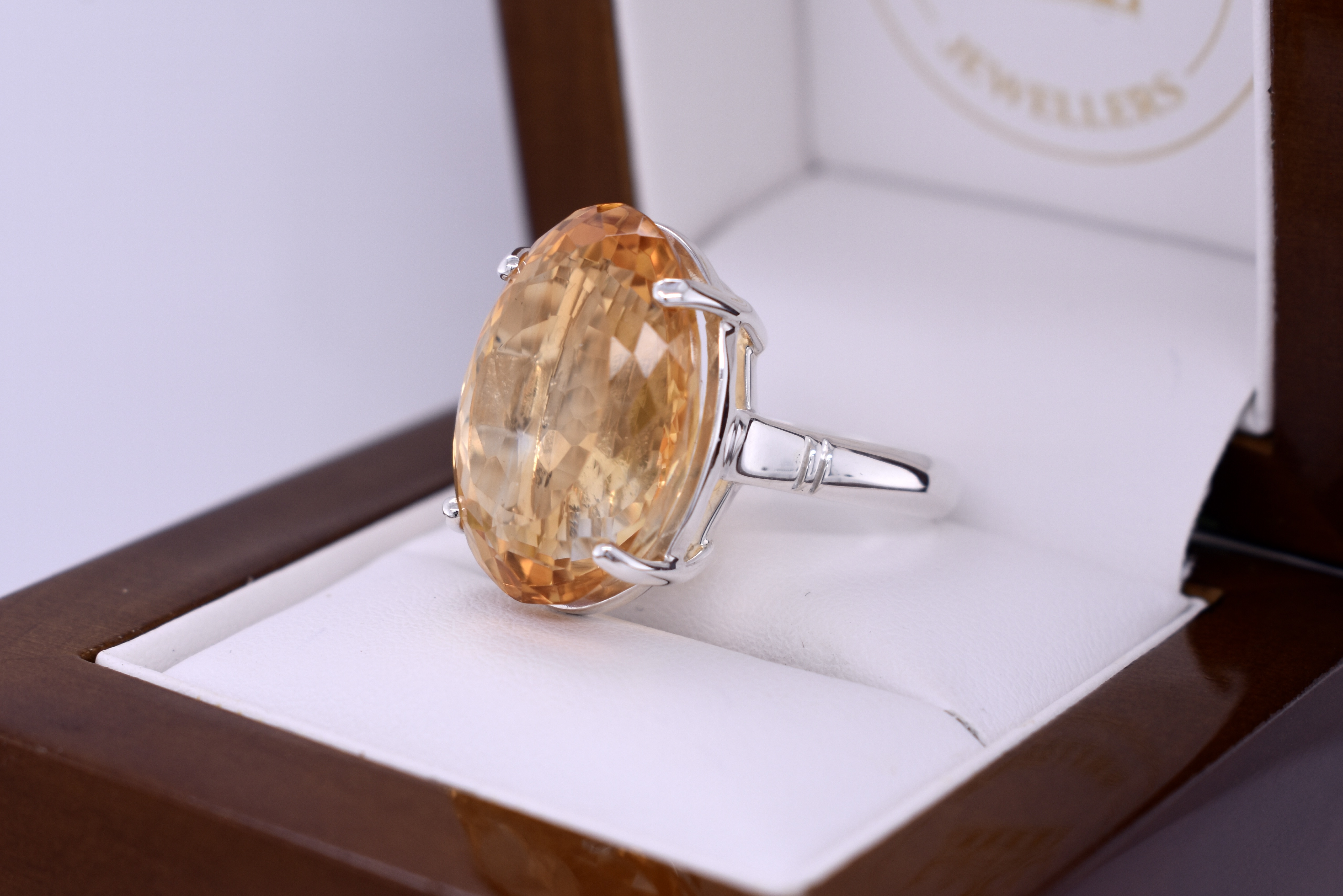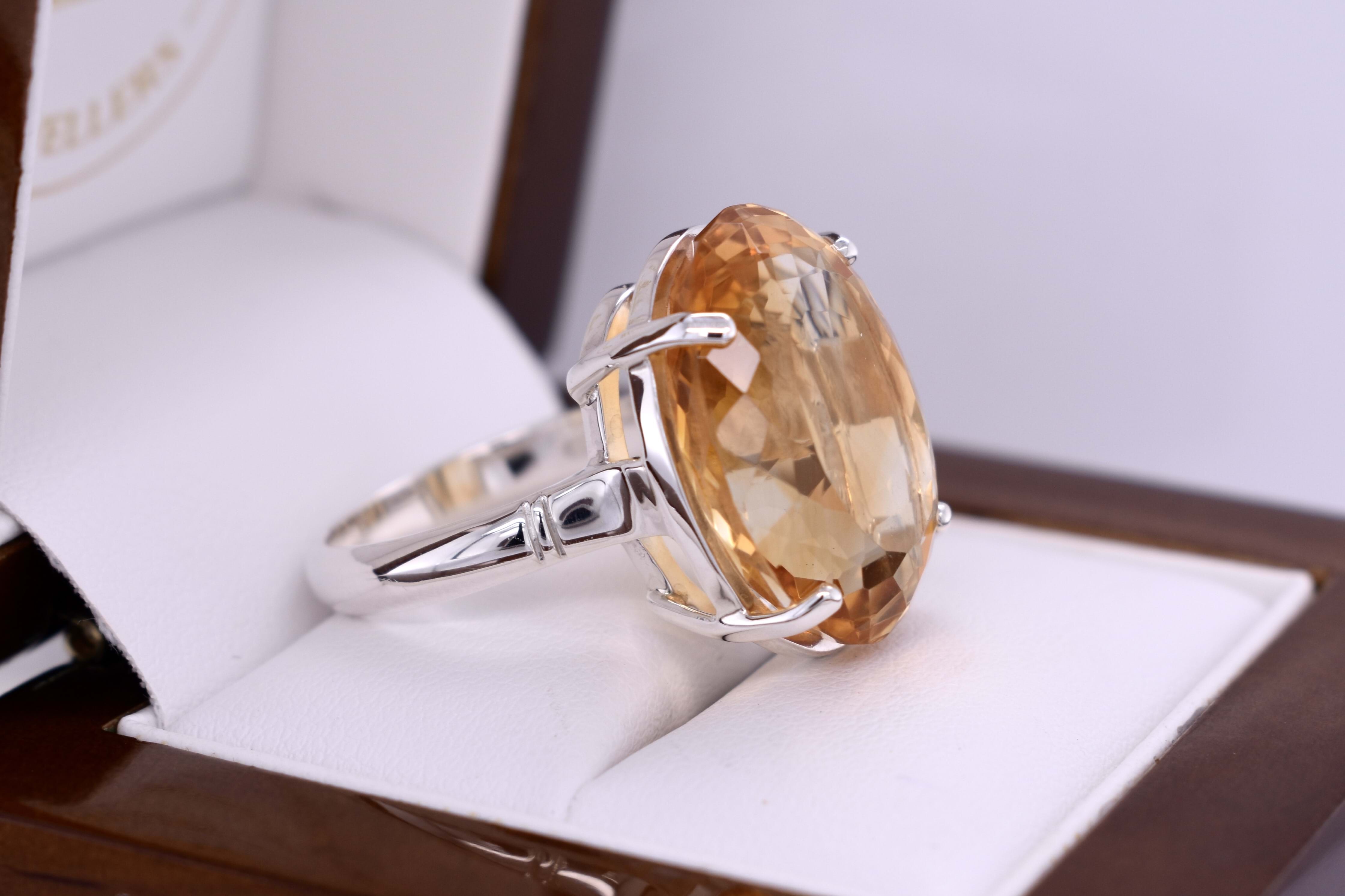 This giant ring is handmade and features an oval citrine measuring approx. 20.9x14.9mm, set into a sterling silver four claw setting. Finished on a plain, grooved band. Finger size R.