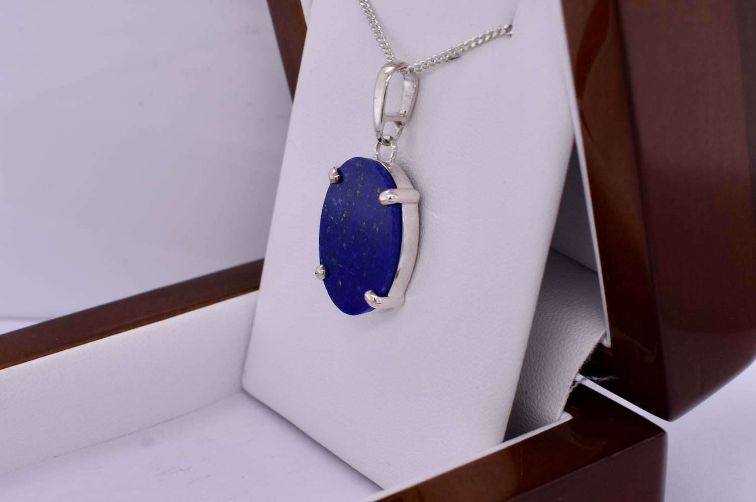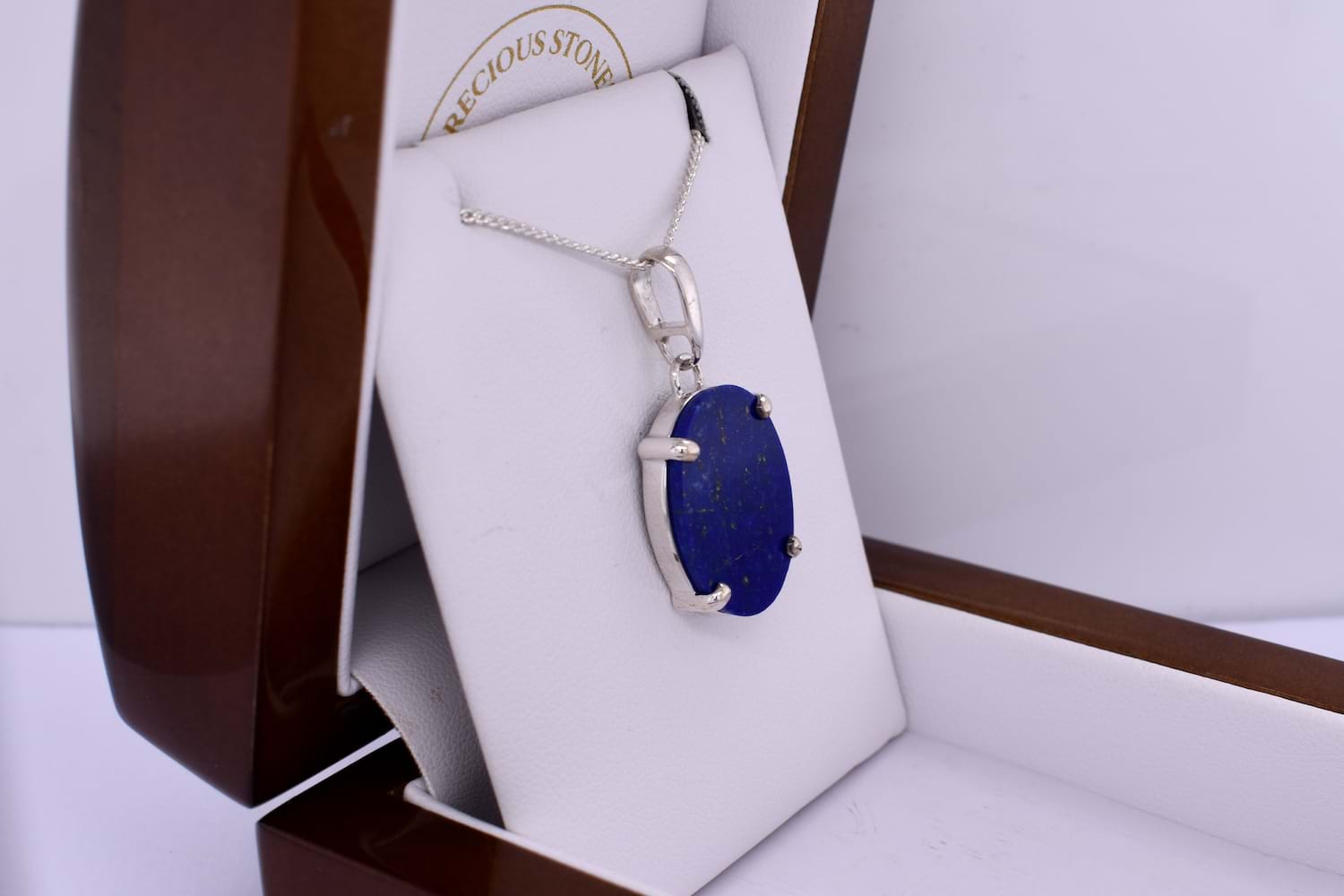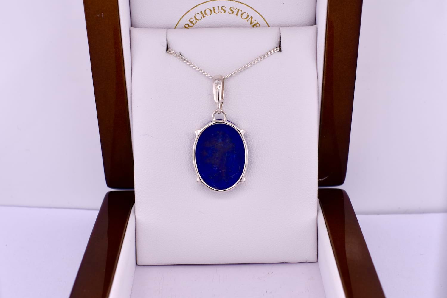This unique pendant is handmade and features an oval shaped tablet of lapis lazuli measuring approx. 20x15mm, set into a sterling silver four claw setting. Finished with a plain bale. Chains are available for separate purchase.