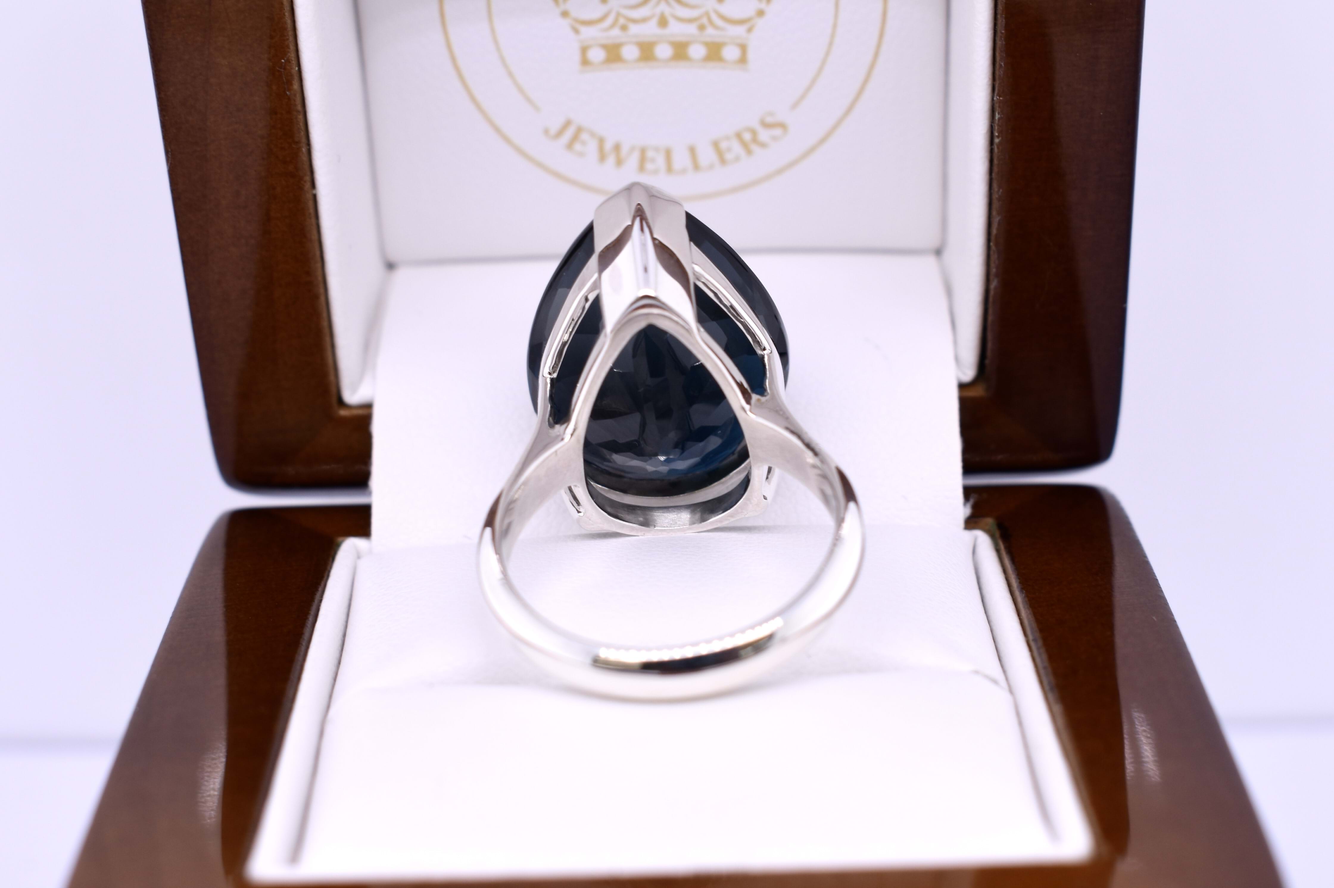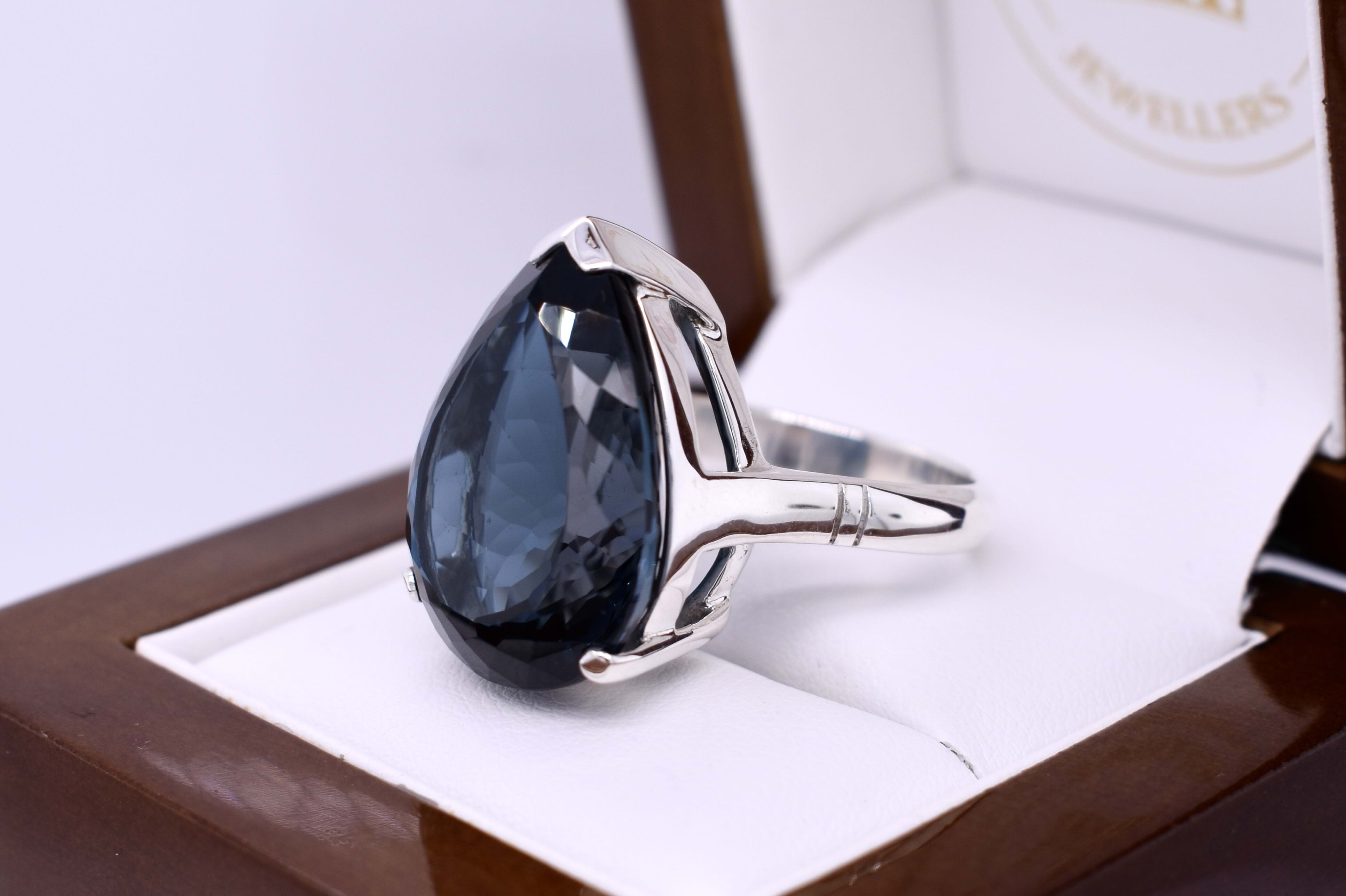 This appealing ring is handmade and features a large pearshape London blue topaz measuring approx. 23.2x17mm, set into a sterling silver two claw and cap setting. Finished on a plain grooved band. Finger size S+.