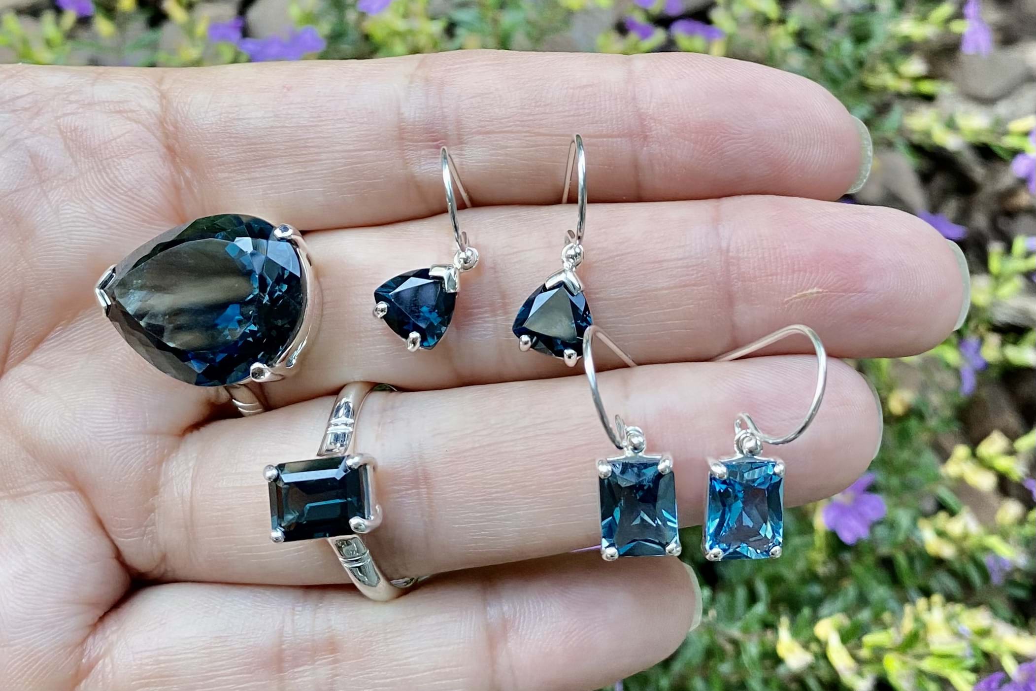 This appealing ring is handmade and features a large pearshape London blue topaz measuring approx. 23.2x17mm, set into a sterling silver two claw and cap setting. Finished on a plain grooved band. Finger size S+. Photographed outside with other pieces (Available for seperate purchase)