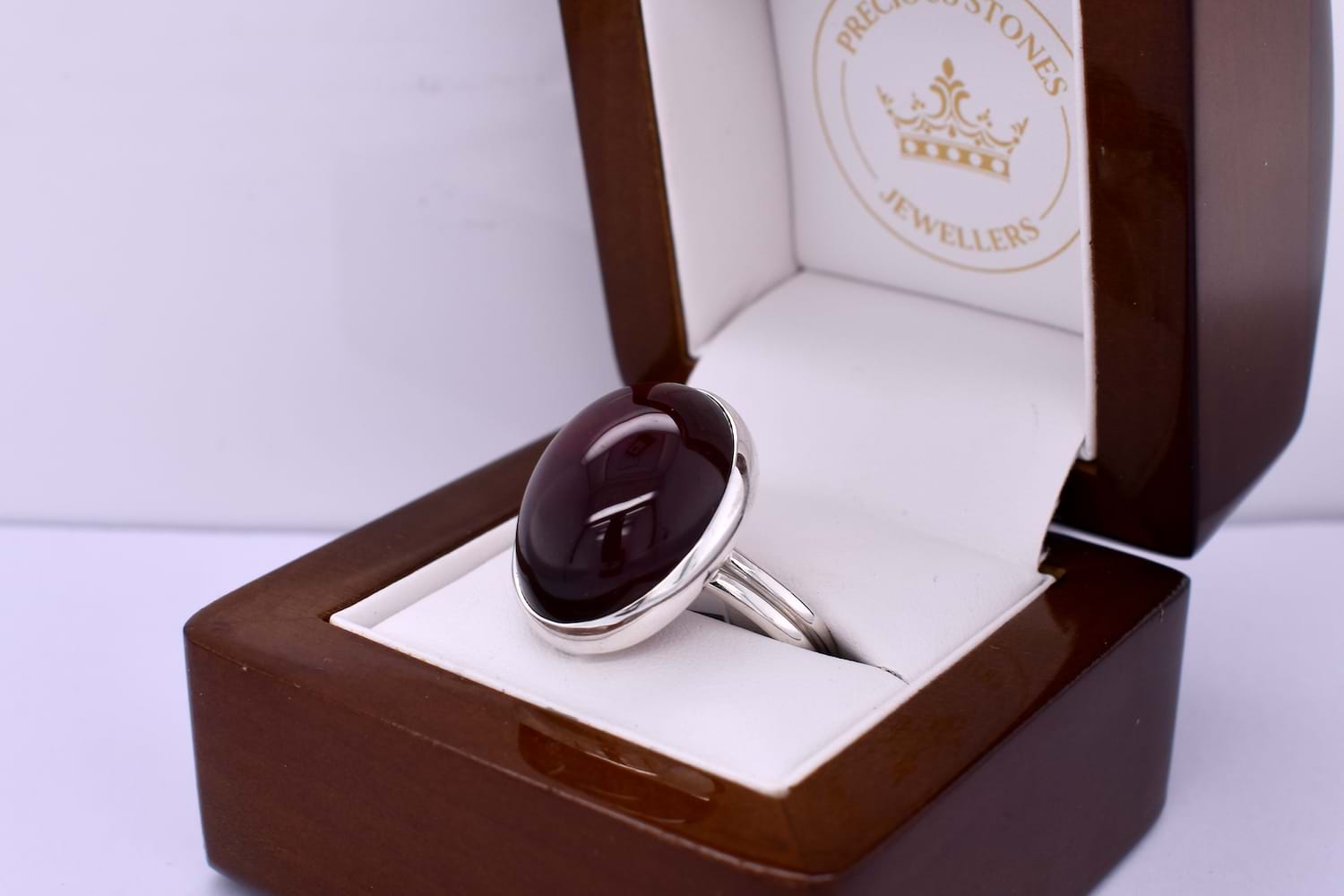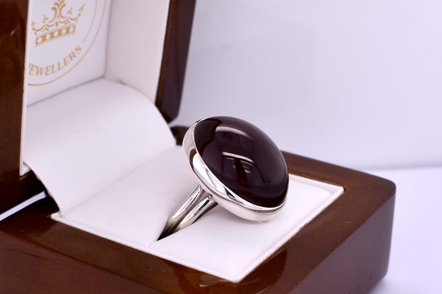This bold ring is handmade and features an oval cabochon hessonite garnet measuring approx. 23.6x17.8mm, bezel set into a sterling silver setting. Finished on a double row band. Finger size T adjustable.
