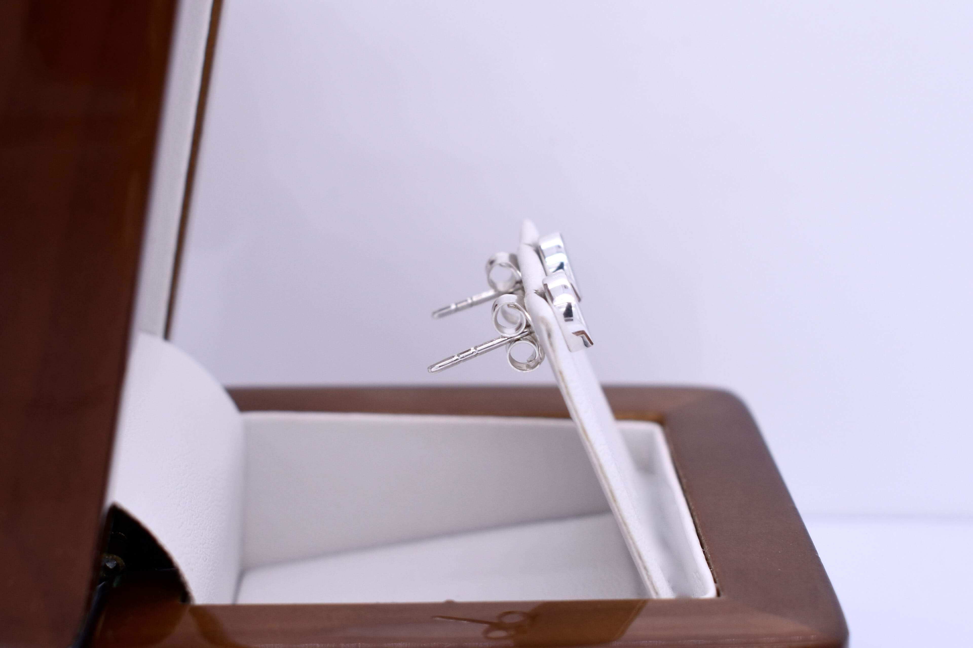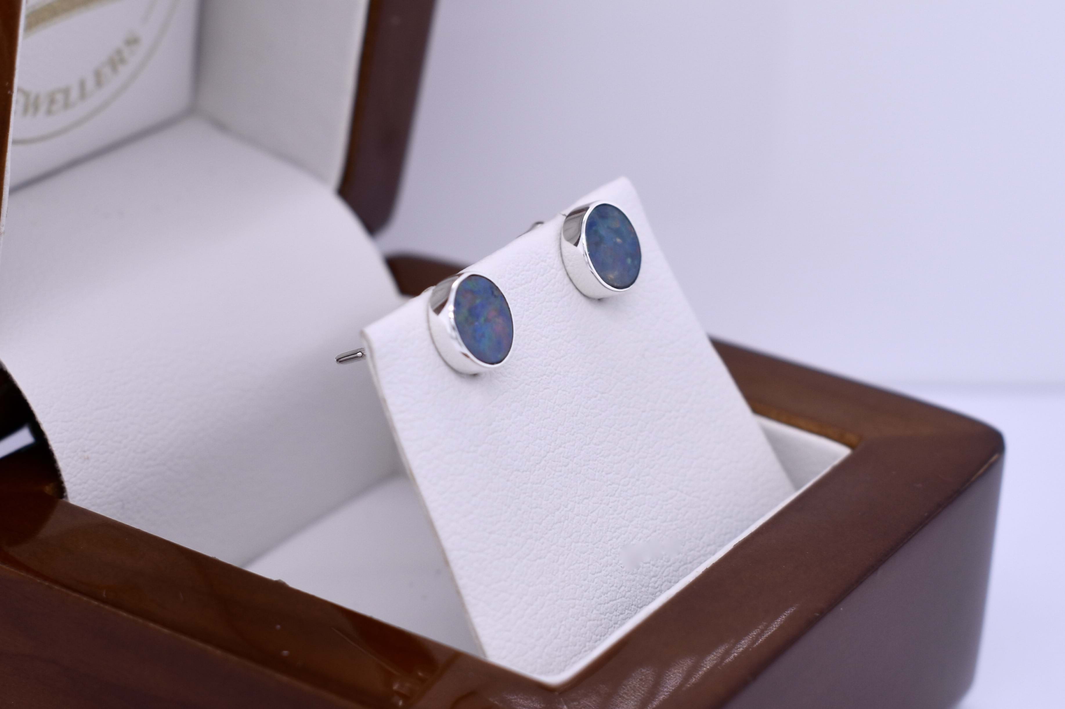 A pretty pair of round Coober Pedy opals, measuring 6.5mm, bezel set in sterling silver. The opals are doublets, consisting of Coober Pedy opal (on top) with a boulder opal backing with flashes of green, red and orange throughout. Finished with a post and butterfly fittings. Photographed in natural light with other pieces.