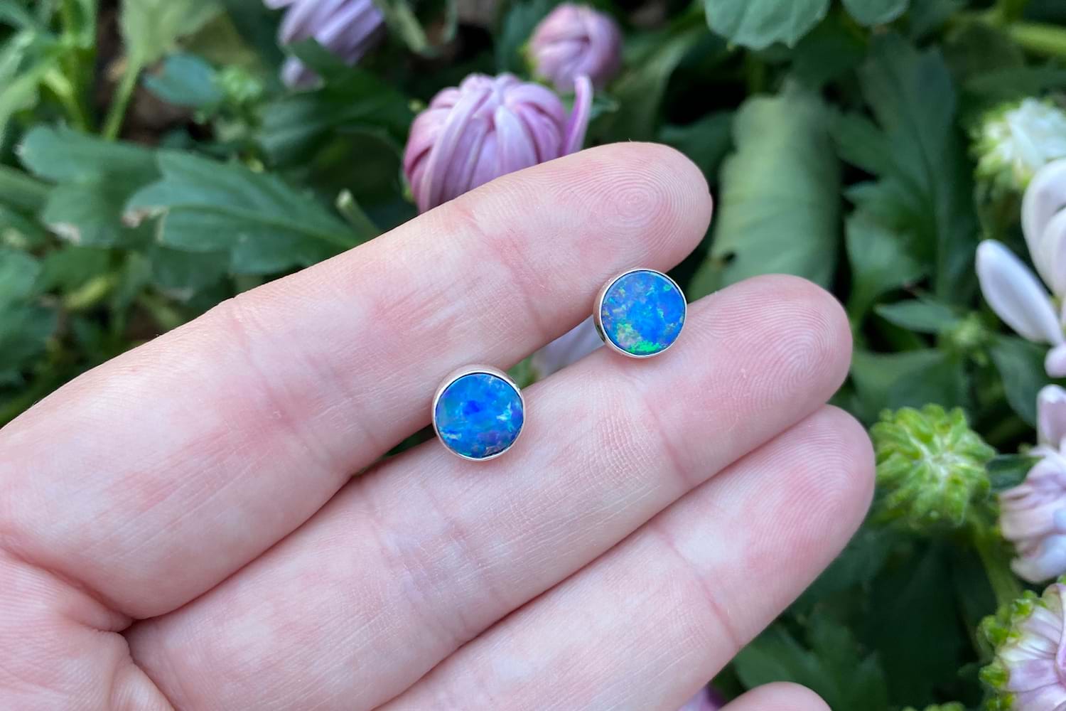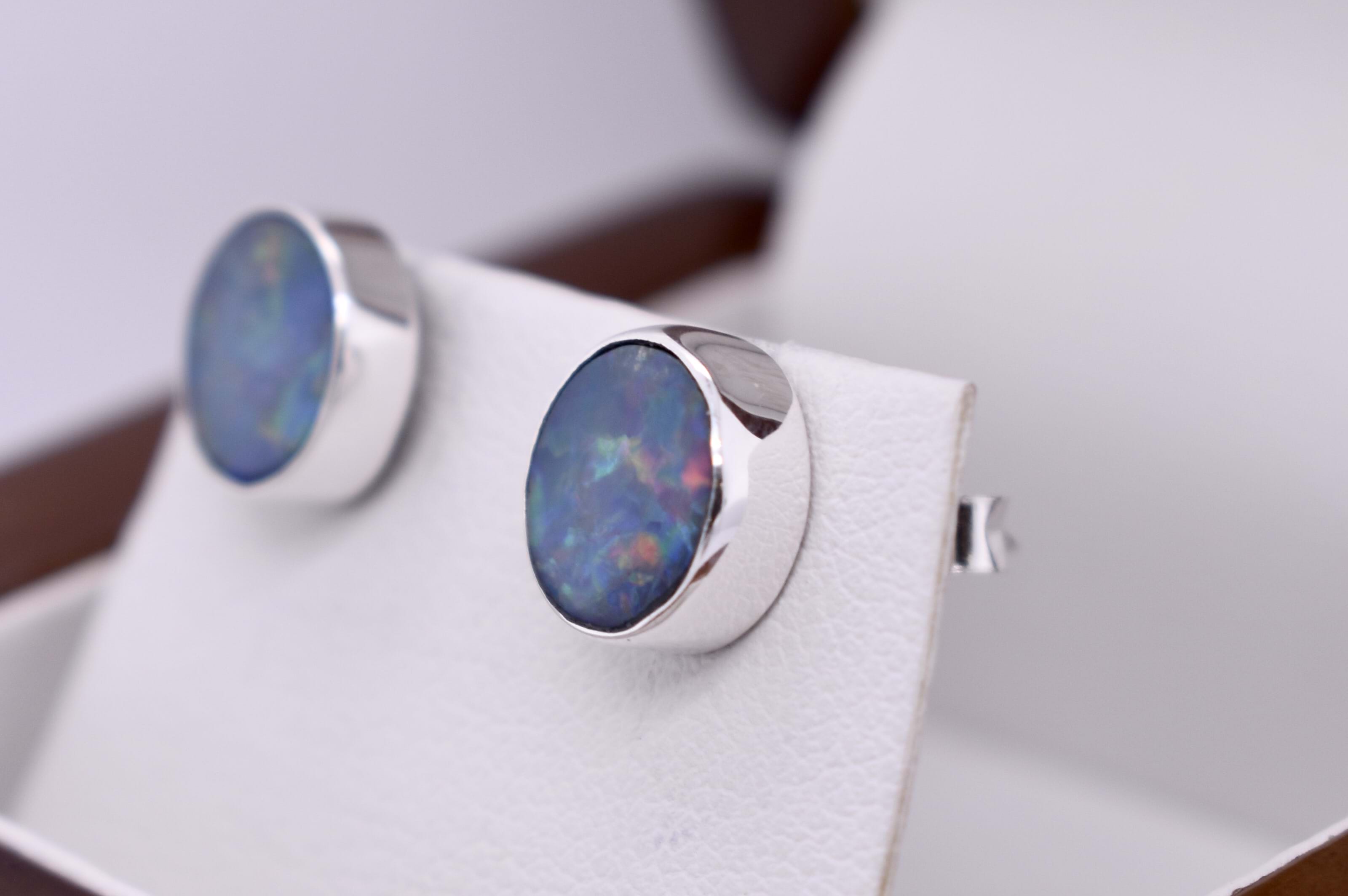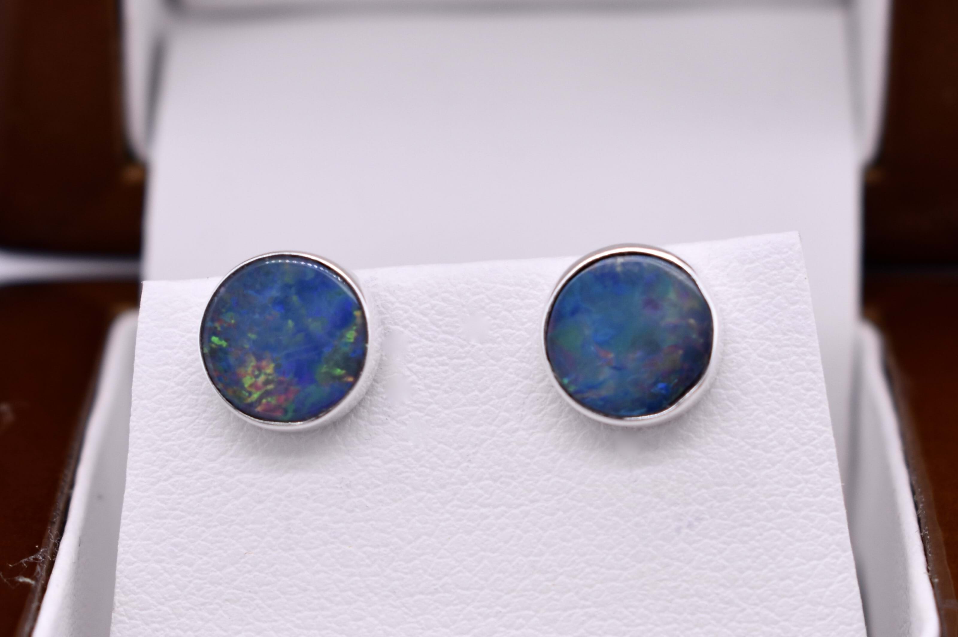 Wonderful pair of handmade studs crafted in sterling silver, with two dark Coober Pedy opal doublets with flashes of green, yellow and orange throughout. The doublet consisting of Coober Pedy crystal opal (on top) with a boulder opal backing. Studs measuring approx. 8.9mm round and are bezel set, with post and butterfly fittings.